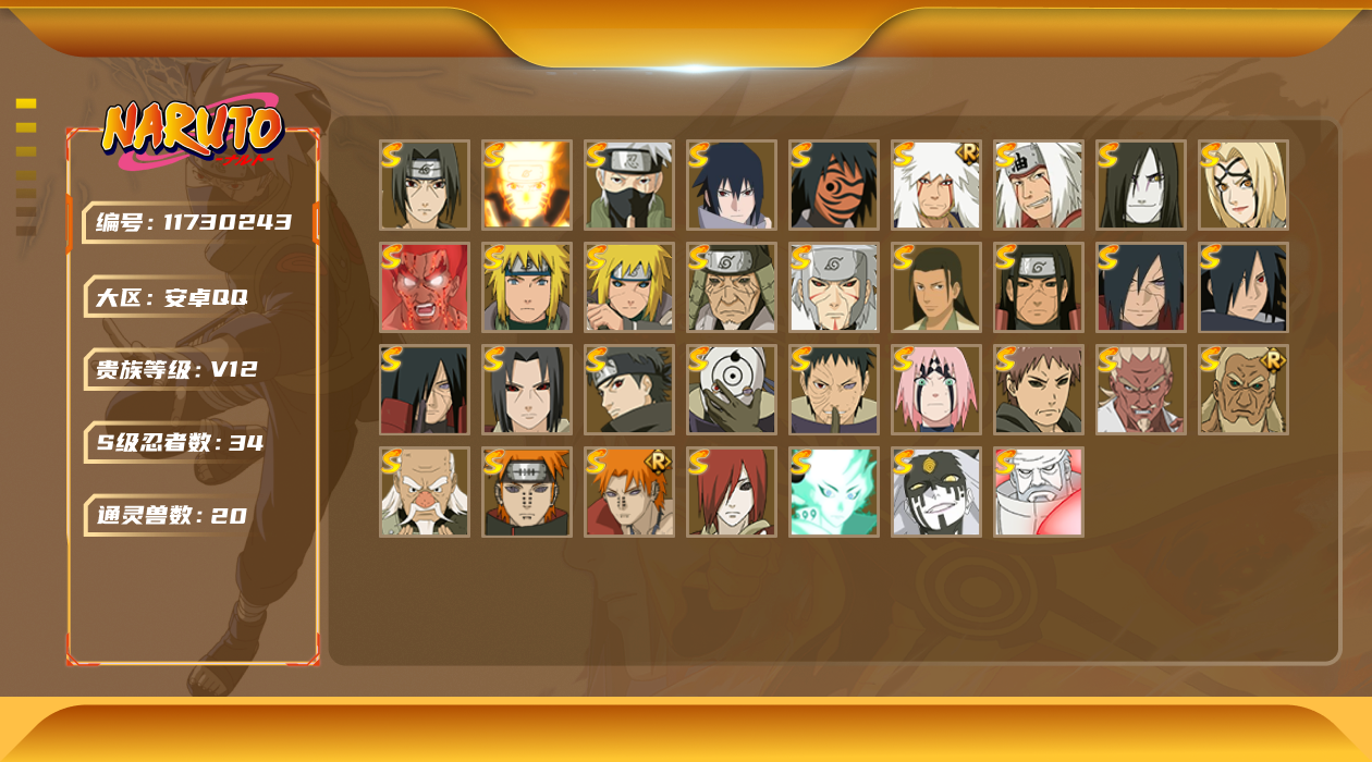 [11730243]V12 34S忍 48A忍 20通灵 1089.7W战力 可二次 可修改实名 优质装备:熊猫,千手柱间「秽土转生」,罗砂「四代目风影」,宇智波鼬「秽土转生」,佩恩·天道「超」,宇智波斑「秽土转生」,艾「三代目雷影」,宇智波斑 「木叶创立」,千手扉间「秽土转生」,纲手「百豪」,波风水门「秽土转生」,猿飞日斩「秽土转生」,长门「秽土转生」,宇智波鼬「秽土转生」,迈特凯「死门」,宇智波带土 「忍界大战」,“宇智波斑” 「白面具」,漩涡鸣人 「九喇嘛连结」,大筒木金式「博人传」,春野樱 「忍界大战」,神秘面具男 「红夜之刃」,宇智波佐助「永恒万花筒」,千手柱间·木叶创立,宇智波斑「秽土转生·解」,大筒木桃式,艾「忍界大战」,宇智波止水「须佐能乎」,旗木卡卡西「须佐能乎」,大筒木舍人 「最终章」,自来也 「传说中的三忍」 S级忍者:大野木 「忍界大战」,自来也 「舞之豪杰」,宇智波鼬 「须佐能乎」,佩恩「天道」,波风水门,大蛇丸 1