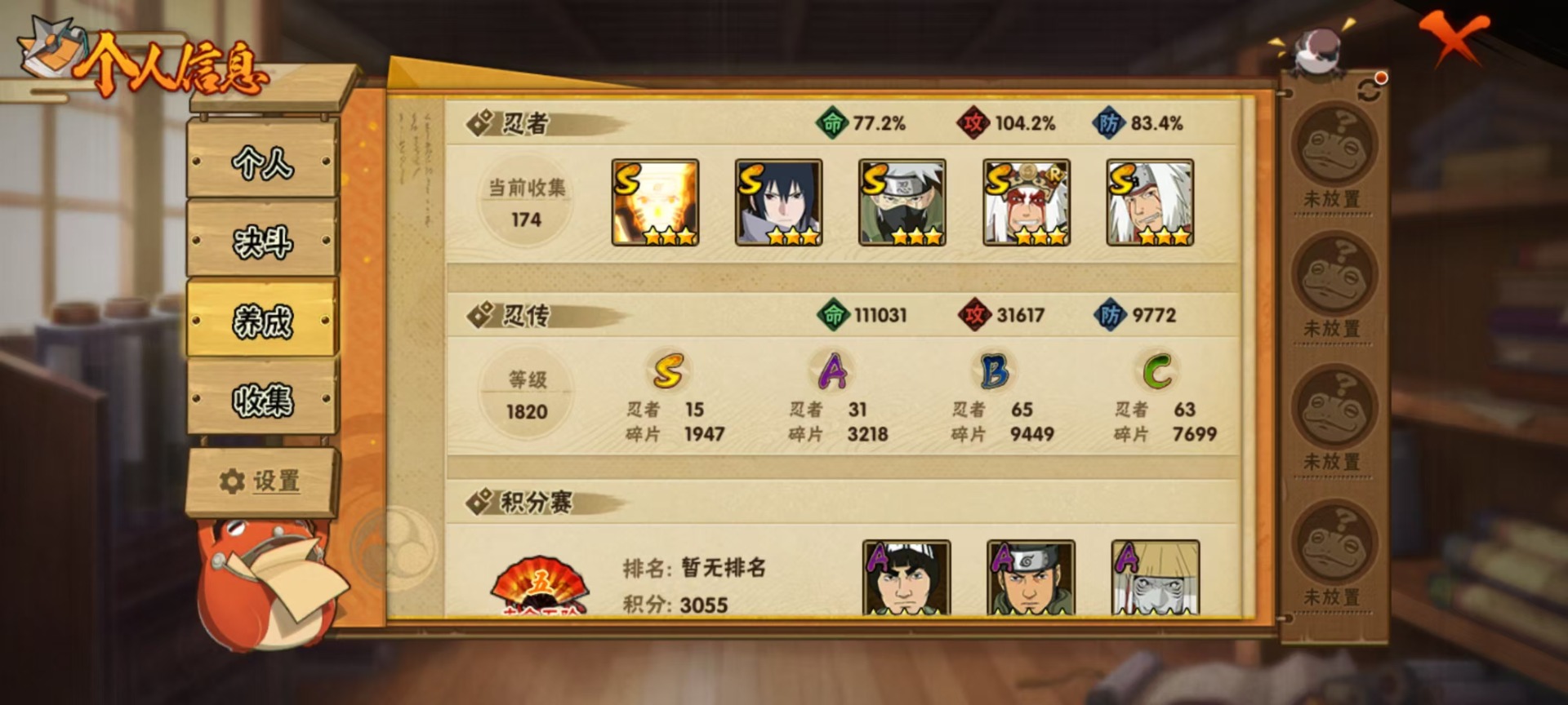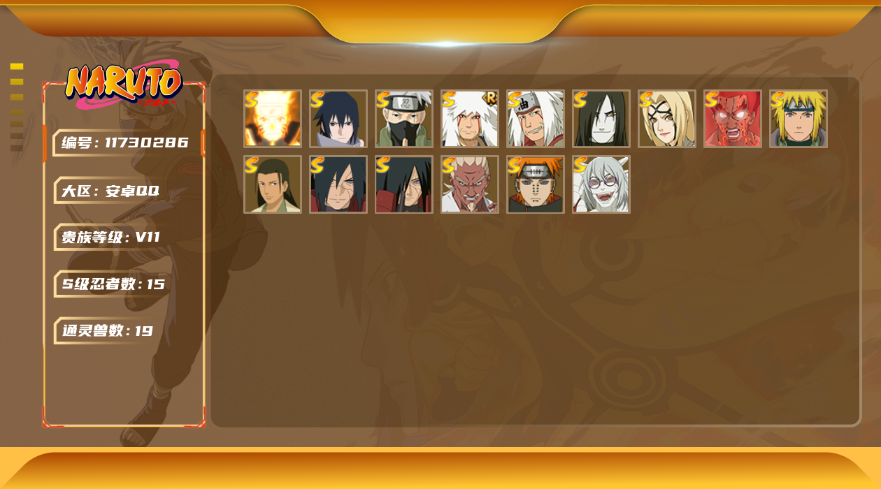 - [12085784]V11 16S忍 21A忍 17通灵 952W战力 可二次 可修改实名 优质装备:熊猫,药师兜「仙人模式」,无「二代目土影」,长门「秽土转生」,宇智波斑,千手柱间,“宇智波斑” 「白面具」,宇智波佐助「永恒万花筒」,大筒木桃式,宇智波止水「须佐能乎」,旗木卡卡西「须佐能乎」,大筒木舍人 「最终章」,漩涡鸣人 「暴怒·第六尾」 S级忍者:自来也 「舞之豪杰」,宇智波鼬 「须佐能乎」,佩恩「天道」,纲手