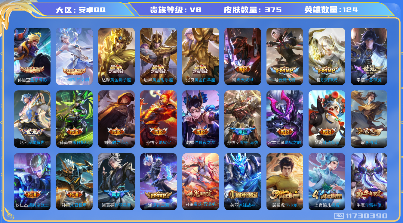 [11730390]【商品标题】:安卓Q-V8-最强王者段位-124英雄-375皮肤-2典藏-0珍品无双-0无双-0珍品传说-30传说-120史诗