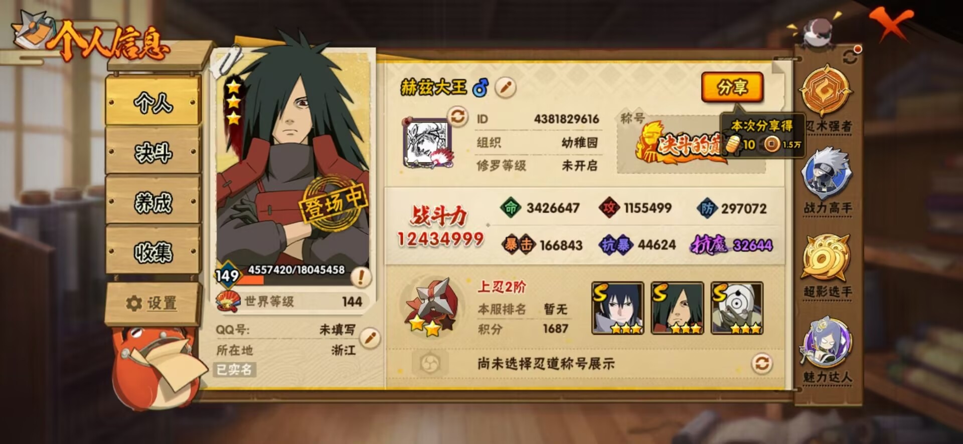 [11730523]V12 29S忍 41A忍 18通灵 1243.4W战力 可二次 可修改实名 优质装备:千手柱间「秽土转生」,药师兜「仙人模式」,宇智波斑「秽土转生」,千手扉间「秽土转生」,纲手「百豪」,波风水门「秽土转生」,金角/银角「秽土转生」,猿飞日斩「秽土转生」,宇智波斑,千手柱间,迈特凯「死门」,宇智波带土 「忍界大战」,“宇智波斑” 「白面具」,漩涡鸣人 「九喇嘛连结」,宇智波佐助「永恒万花筒」,宇智波斑「秽土转生·解」,艾「忍界大战」,宇智波止水「须佐能乎」,旗木卡卡西「须佐能乎」,大筒木舍人 「最终章」,自来也 「传说中的三忍」,漩涡鸣人 「暴怒·第六尾」 S级忍者:自来也 「舞之豪杰」,宇智波鼬 「须佐能乎」,佩恩「天道」,波风水门,大蛇丸,自来也