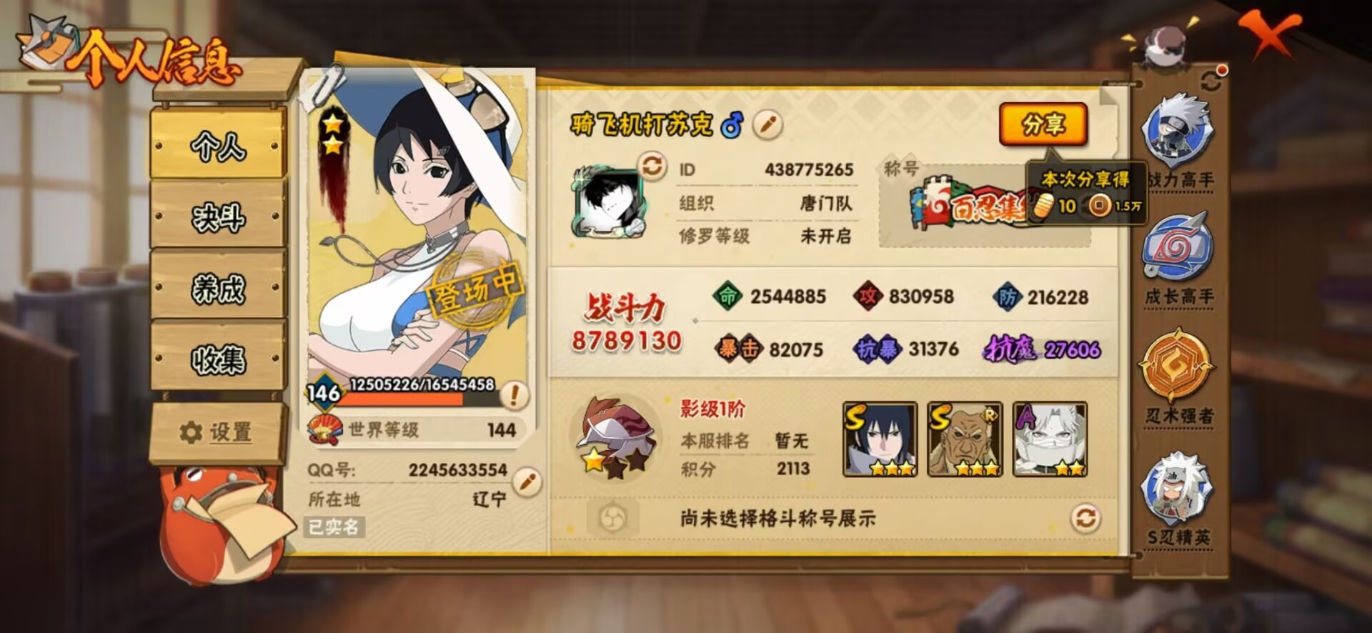 [11731255]V11 16S忍 31A忍 17通灵 878.9W战力 可二次 可修改实名 优质装备:宇智波鼬「秽土转生」,宇智波斑「秽土转生」,艾「三代目雷影」,猿飞日斩「秽土转生」,宇智波斑,千手柱间,宇智波带土 「忍界大战」,“宇智波斑” 「白面具」,漩涡鸣人 「九喇嘛连结」,春野樱 「忍界大战」,神秘面具男 「红夜之刃」,宇智波佐助「永恒万花筒」 S级忍者:自来也 「舞之豪杰」,波风水门,大蛇丸,纲手