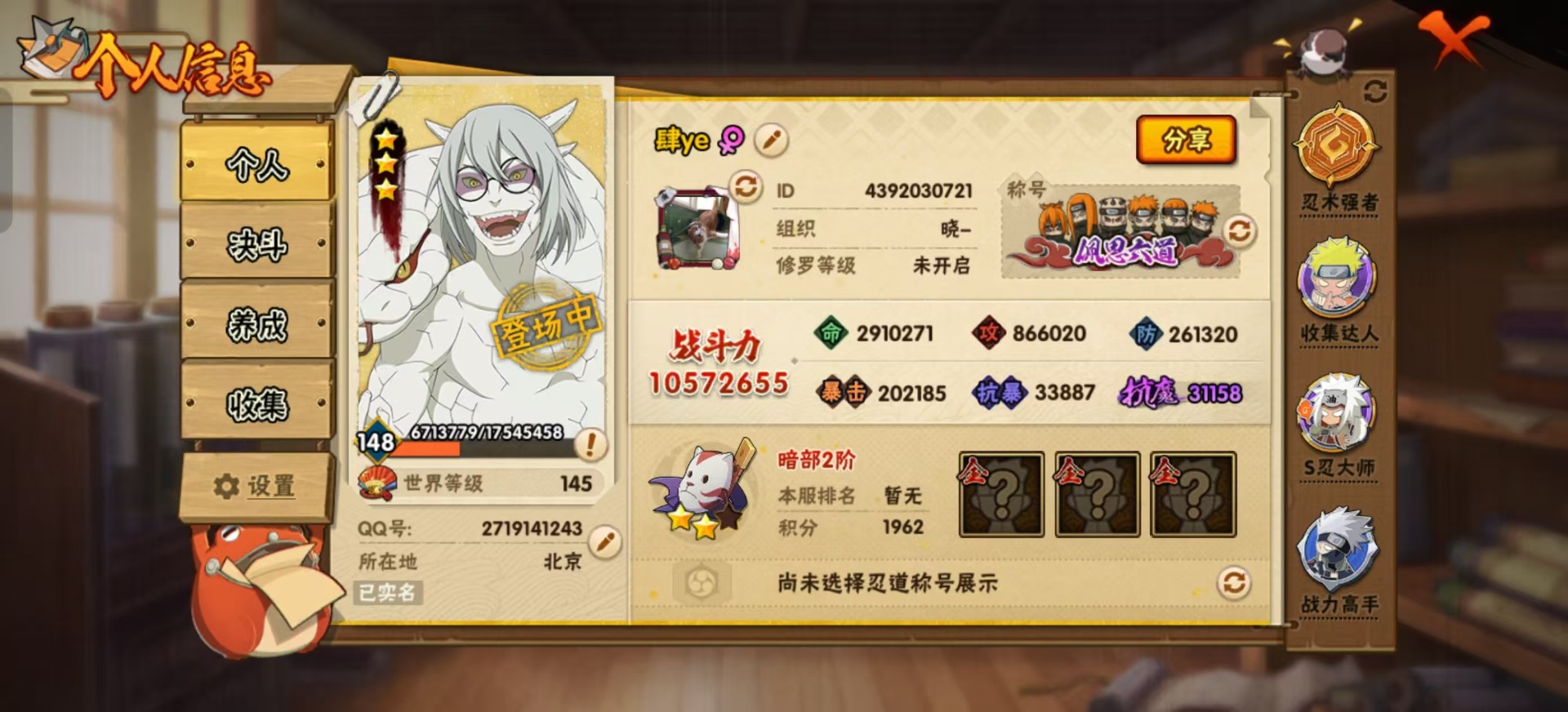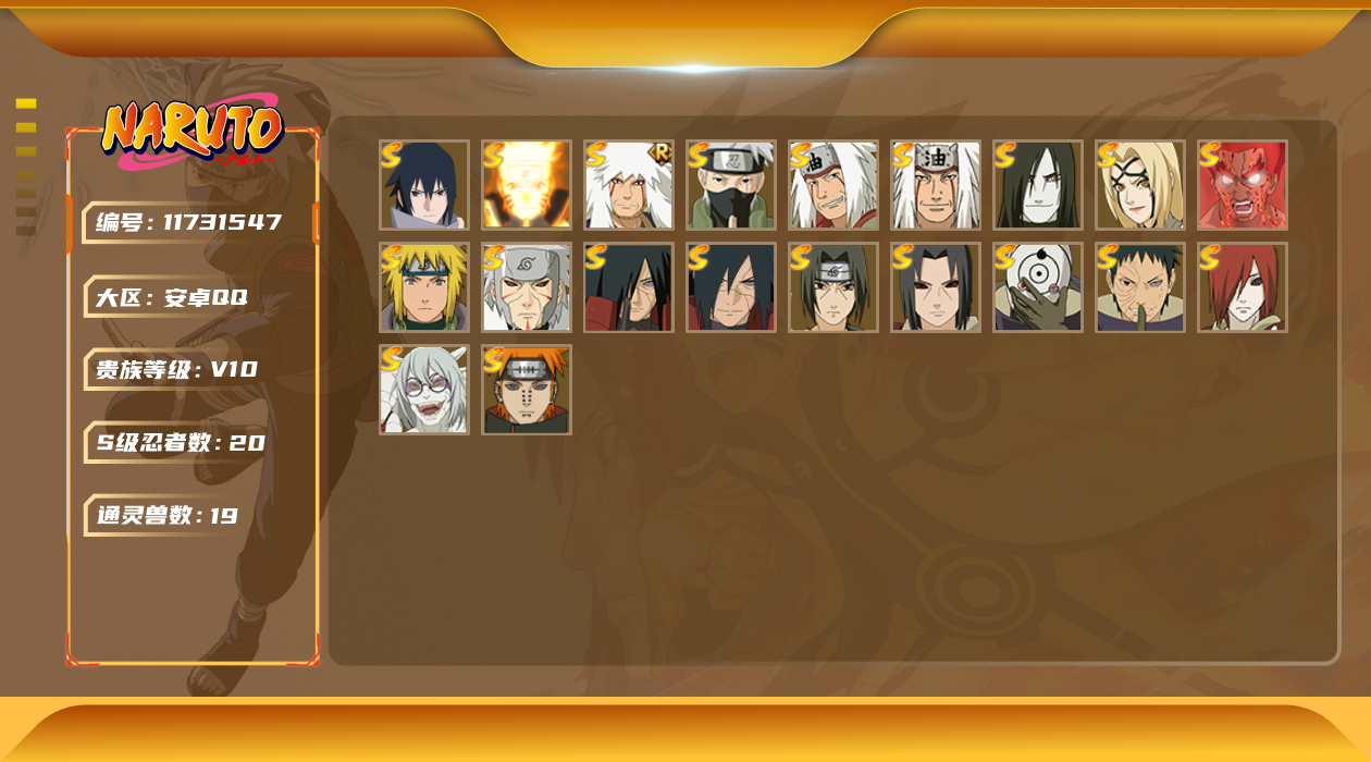 [11731547]V10 20S忍 42A忍 19通灵 1057.2W战力 可二次 可修改实名 优质装备:熊猫,宇智波鼬「秽土转生」,药师兜「仙人模式」,宇智波斑「秽土转生」,千手扉间「秽土转生」,纲手「百豪」,长门「秽土转生」,迈特凯「死门」,宇智波带土 「忍界大战」,“宇智波斑” 「白面具」,漩涡鸣人 「九喇嘛连结」,宇智波佐助「永恒万花筒」,宇智波斑「秽土转生·解」,旗木卡卡西「须佐能乎」,自来也 「传说中的三忍」 S级忍者:自来也 「舞之豪杰」,宇智波鼬 「须佐能乎」,佩恩「天道」,波风水门,大蛇丸,自来也