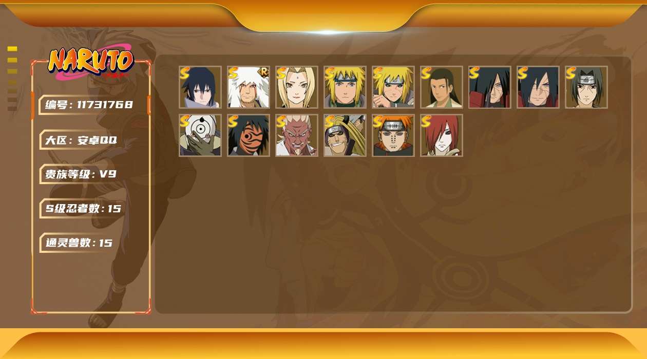 [11731768]V9 15S忍 30A忍 15通灵 753.8W战力 可二次 可修改实名 优质装备:宇智波斑「秽土转生」,波风水门「秽土转生」,金角/银角「秽土转生」,长门「秽土转生」,“宇智波斑” 「白面具」,神秘面具男 「红夜之刃」,宇智波佐助「永恒万花筒」,千手柱间·木叶创立,宇智波斑「秽土转生·解」,艾「忍界大战」 S级忍者:自来也 「舞之豪杰」,宇智波鼬 「须佐能乎」,佩恩「天道」,波风水门,纲手1