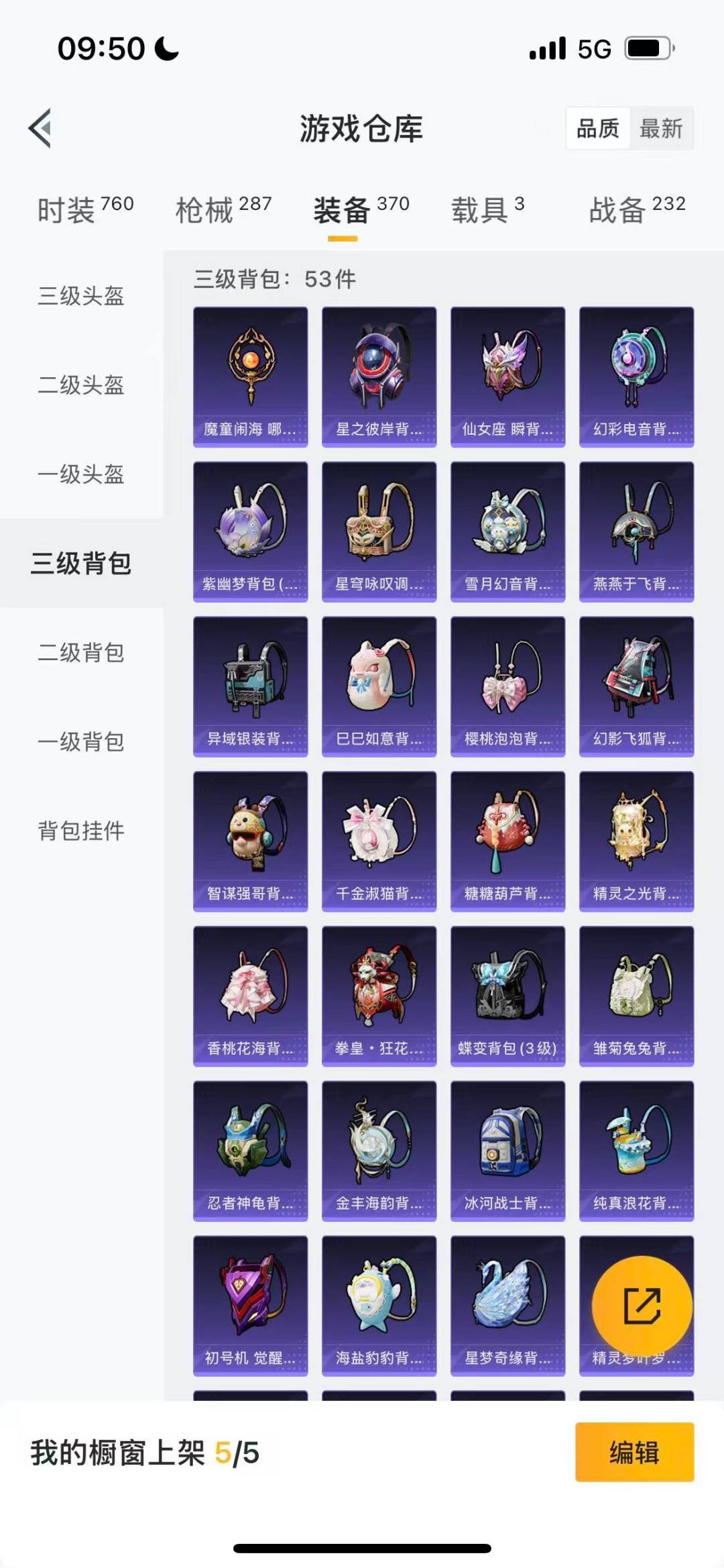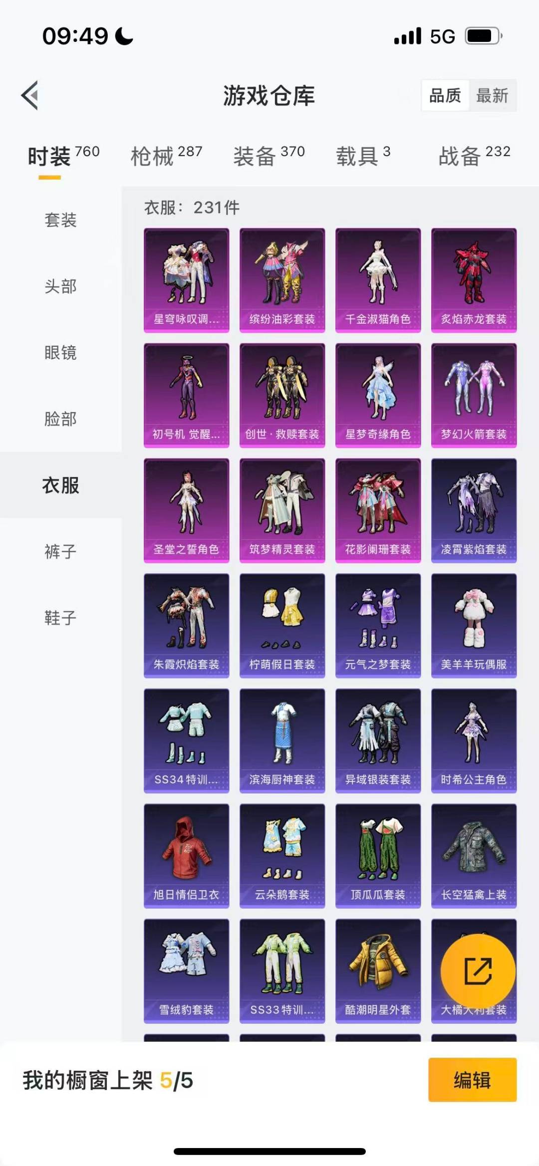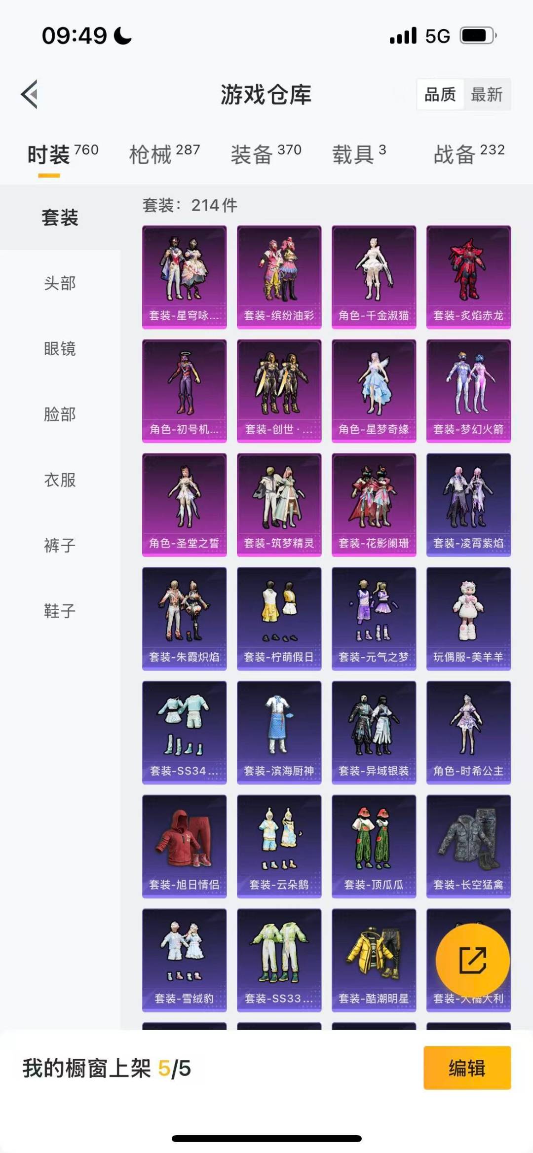 [11731776]11粉装 8特效枪 3载具 12印记 可二次 可修改实名 身法装备:初号机 觉醒Ver.(新紫螳螂),8号机(新粉螳螂),Mark.06(新蓝螳螂) 优质装备:星梦玉骢,特斯拉Roadster(水滴蓝),路特斯ELETRE(冰川蓝),梦幻火箭(新101)(新火箭少女101粉色套装),缤纷油彩(猪妹猪脸妹),M416风花雪月,Kar98K未来歌姬,SCAR-L-锦绣绵绵,七级M416-风花雪月,破片手榴弹粉粉猫爪,七级破片手榴弹粉粉猫爪,M762-青锋波束,千金淑猫,AUG-暖羊咩咩,星穹咏叹调,Kar98K-巳巳如意 热门装扮:炙焰赤龙,花影阑珊,筑梦精灵,圣堂之誓,创世·救赎,星梦奇缘,初号机 觉醒Ver.(新紫螳螂),迅捷狂鲨 稀有枪皮:DP-28-豹影疾电 五级特效枪:五级M762-青锋波束,五级Kar98K-巳巳如意,五级DP-28-豹影疾电,五级AUG-暖羊咩咩,五级Kar98K-未来歌姬,五级SCAR-L-锦绣绵绵 紫色装扮:田园牧歌,轻风白浪,SS22特训,SS23特训,幻彩翩翩,妙红点点,娇憨猪猪,萌趣咩咩,SS21特训,SS31特训套装,冰川特警,冷焰舞者,北国孤狼,旭日情侣,SS30特训套装,云朵鹅,雪绒豹,SS33特训套装,顶瓜瓜,时希公主,SS20特训,时空追击者,暴风机械师,SS16特训,冰爽风暴,爆裂葡萄,冰爽海盐,银白舞王,SS13特训,滑板小狐,治愈之星,迅捷之星,科技之星,SS14特训,萌趣颜团子,飞驰魅影,音速流光,SS19特训,豚鼠丹丹,甜心亚梦,虚音幻奏,瑞龙福将,团圆交子,SS17特训,异彩先驱,SS18特训,水晶王族,双彩绵绵,都市漫游者,酒红色名流,酷潮明星,野性战心,长空猛禽,迅猛虎鲸,霓虹极客,霓虹街区,青年教官,耀眼新星,蓝色守护者,蓝色运动,虎虎生威吉莉,风行保卫者,飞行日记,龙腾端午,骑行爱好者,魅力单车,鹤鸣,黄色伏地魔,黄色名流,黄色运动,黎明保卫者,黑色伏地魔,龟仙人,冰河战士,龙魂突击队,蝶变,香桃花海,柠萌假日,格斗先锋,橘黑制服,沙漠兵团,沙漠雄狮,海岛探路者,深蓝色名流,滨海假日,幻影武者,夏日音浪,幻世战舞者,怒火燎原,战地名士,探宝勇士,湖蓝色名流,滨海厨神,绮丽涂鸦,白熊同盟,白色伏地魔,甜蜜告白,福星高照,空岛之星,空投萌叽,竞技勇士朋克,竞技达人朋克,红色运动,甜蜜熊情侣,潮流先锋,