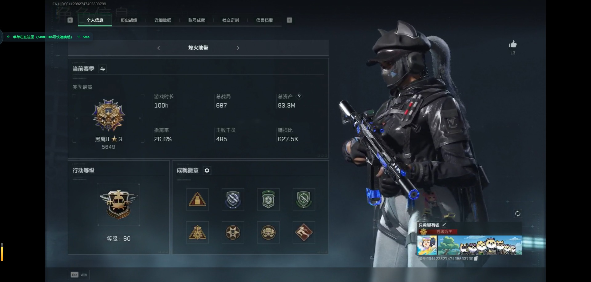 [11682138]总资产:93.3M 2干员外观 1近战传说 11传说枪械 哈夫币:34.470K 高级安全箱(9.17到期) 可二次 可修改实名 优质装备:近战-北极星 烽火地带段位:黑鹰 全面战场段位:校官 传说武器皮肤:CAR-15突击步枪-阿米娅,复合弓-黑-天际线,AWM狙击步枪-捞点薯条,QCQ171冲锋枪-北极星,腾龙突击步枪-捞点薯条,93R-捞点薯条,勇士冲锋枪-能天使-午夜邮差,725双管霰弹枪-送葬人-无题密令,K437突击步枪-北极星,CAR-15突击步枪-黑鹰坠落 史诗武器皮肤:AUG突击步枪-蝮蛇,PKM通用机枪-荒野求生,MP5冲锋枪-深海恐惧,勇士冲锋枪-深海恐惧,AKM突击步枪-林中猎手,.357左轮-幸运时刻,SR-3M紧凑突击步枪-荒野求生,M1014霰弹枪-林中猎手,SV-98狙击步枪-林中猎手,SVD狙击步枪-荒野求生,AS Val突击步枪-典狱官,SCAR-H战斗步枪-囚徒,腾龙突击步枪-无垢,MP7冲锋枪-无垢,PSG-1射手步枪-无垢,Vector冲锋枪-阿萨拉文明,SVD狙击步枪-阿萨拉工艺,S12K霰弹枪-曙光,M700狙击步枪-竞技风 干员外观:蜂医-送葬人·无题密令(S5),露娜-黑·天际线