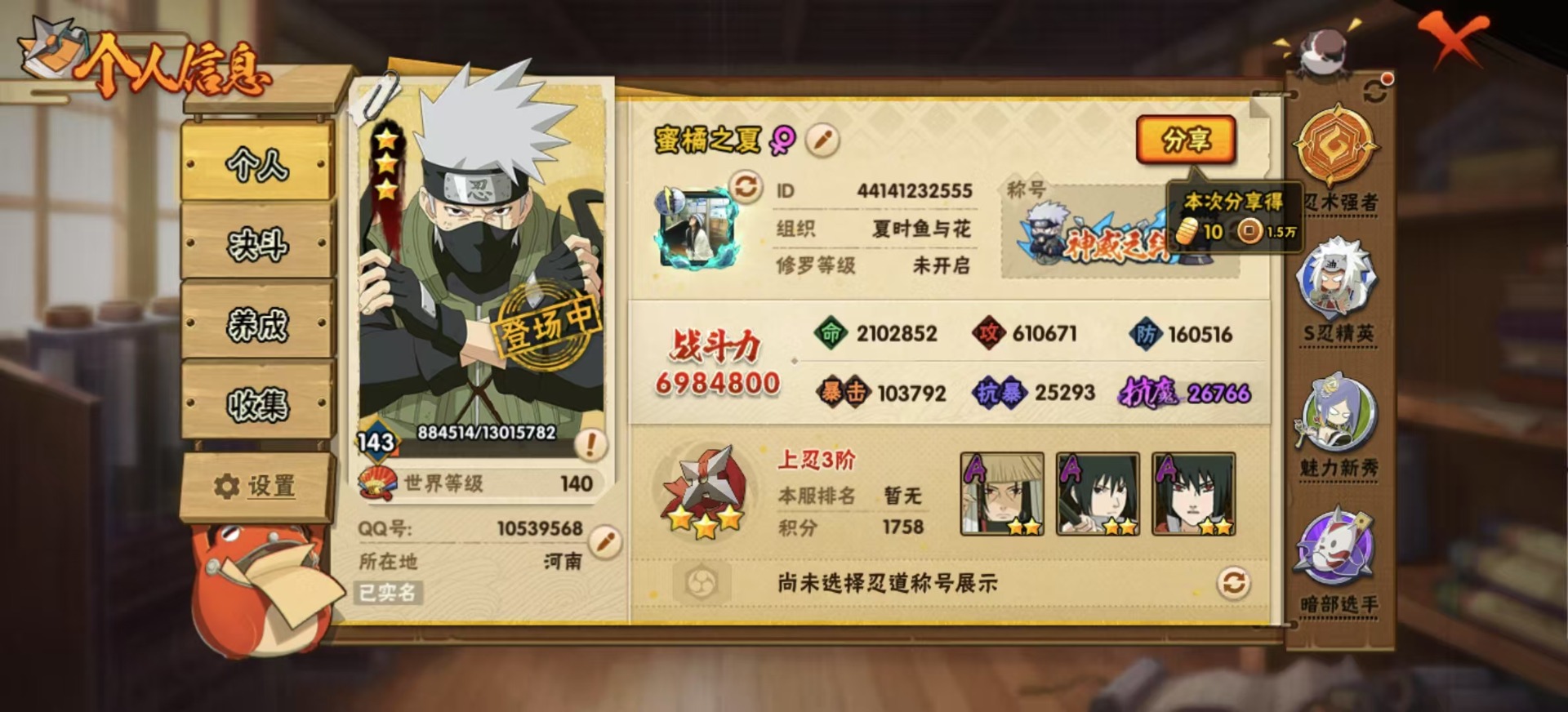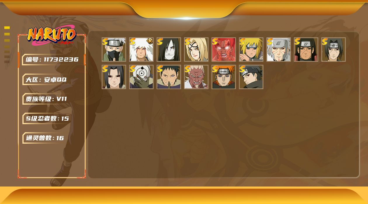 [11732236]V11 15S忍 33A忍 16通灵 698.4W战力 可二次 可修改实名 优质装备:千手柱间「秽土转生」,宇智波鼬「秽土转生」,千手扉间「秽土转生」,纲手「百豪」,波风水门「秽土转生」,迈特凯「死门」,宇智波带土 「忍界大战」,“宇智波斑” 「白面具」,艾「忍界大战」,宇智波止水「须佐能乎」,旗木卡卡西「须佐能乎」 S级忍者:自来也 「舞之豪杰」,宇智波鼬 「须佐能乎」,佩恩「天道」,大蛇丸