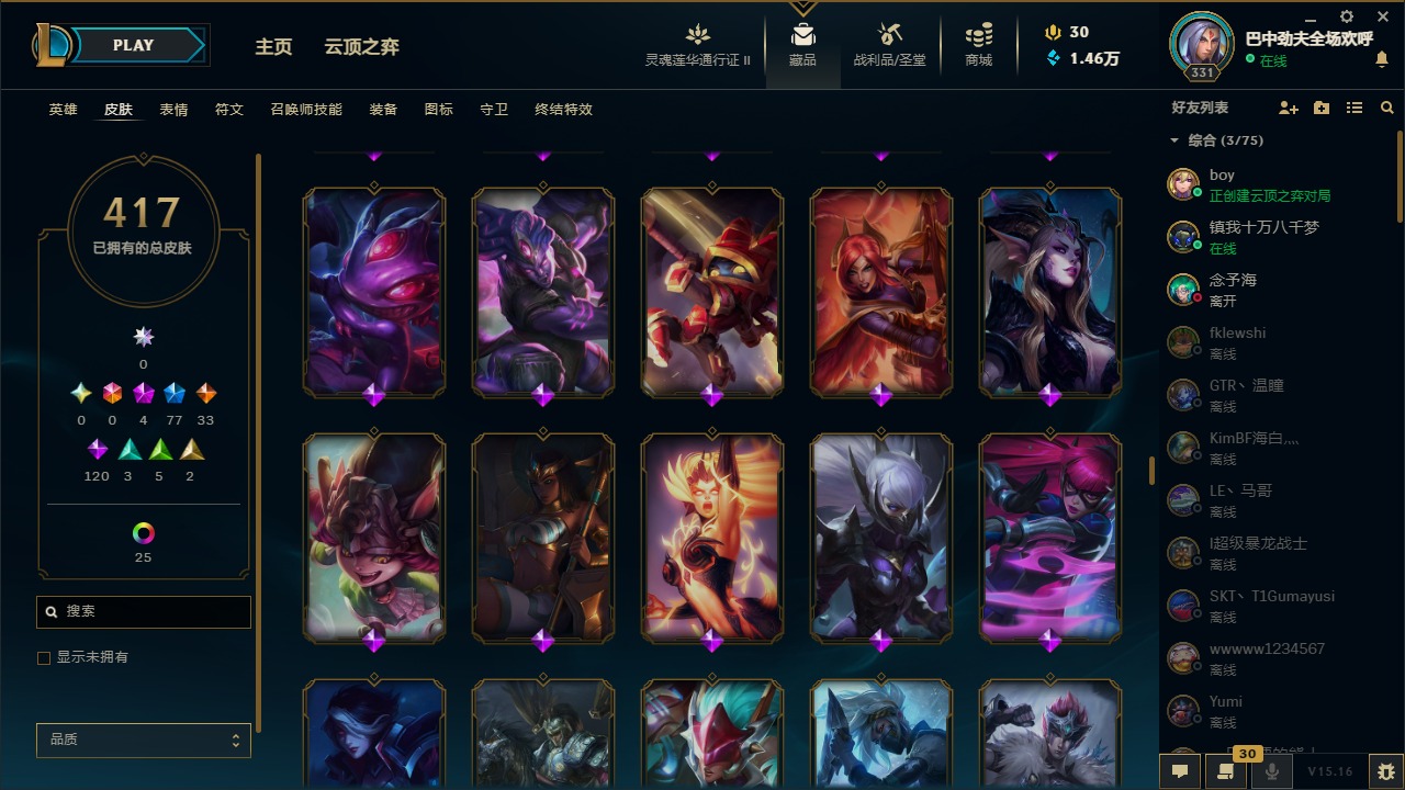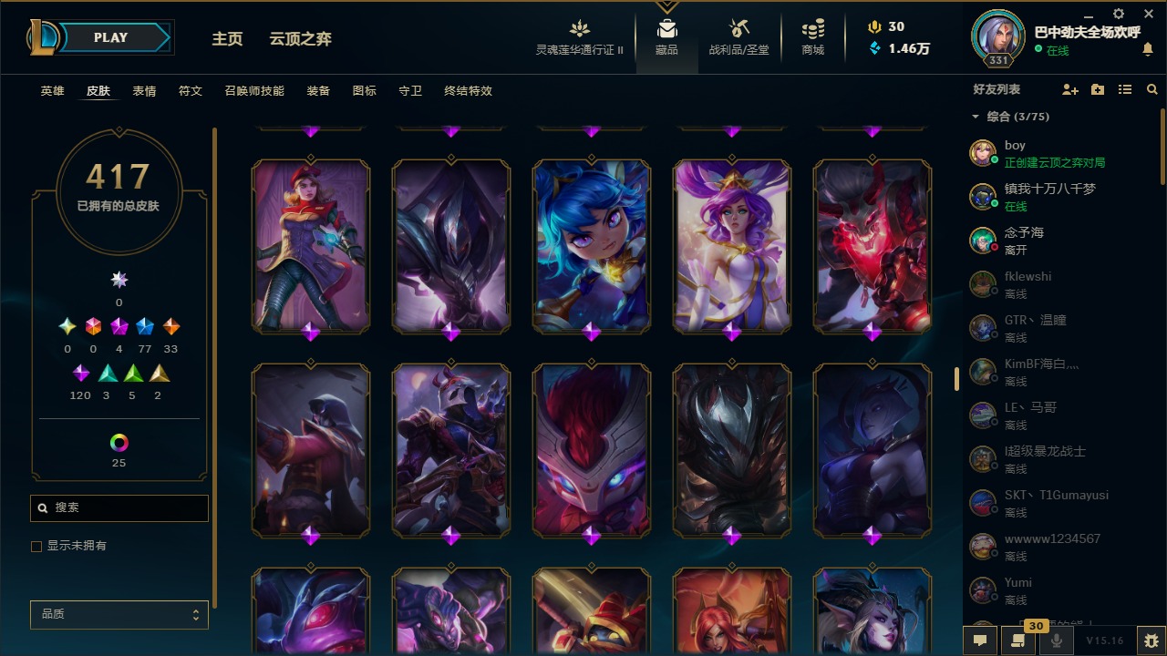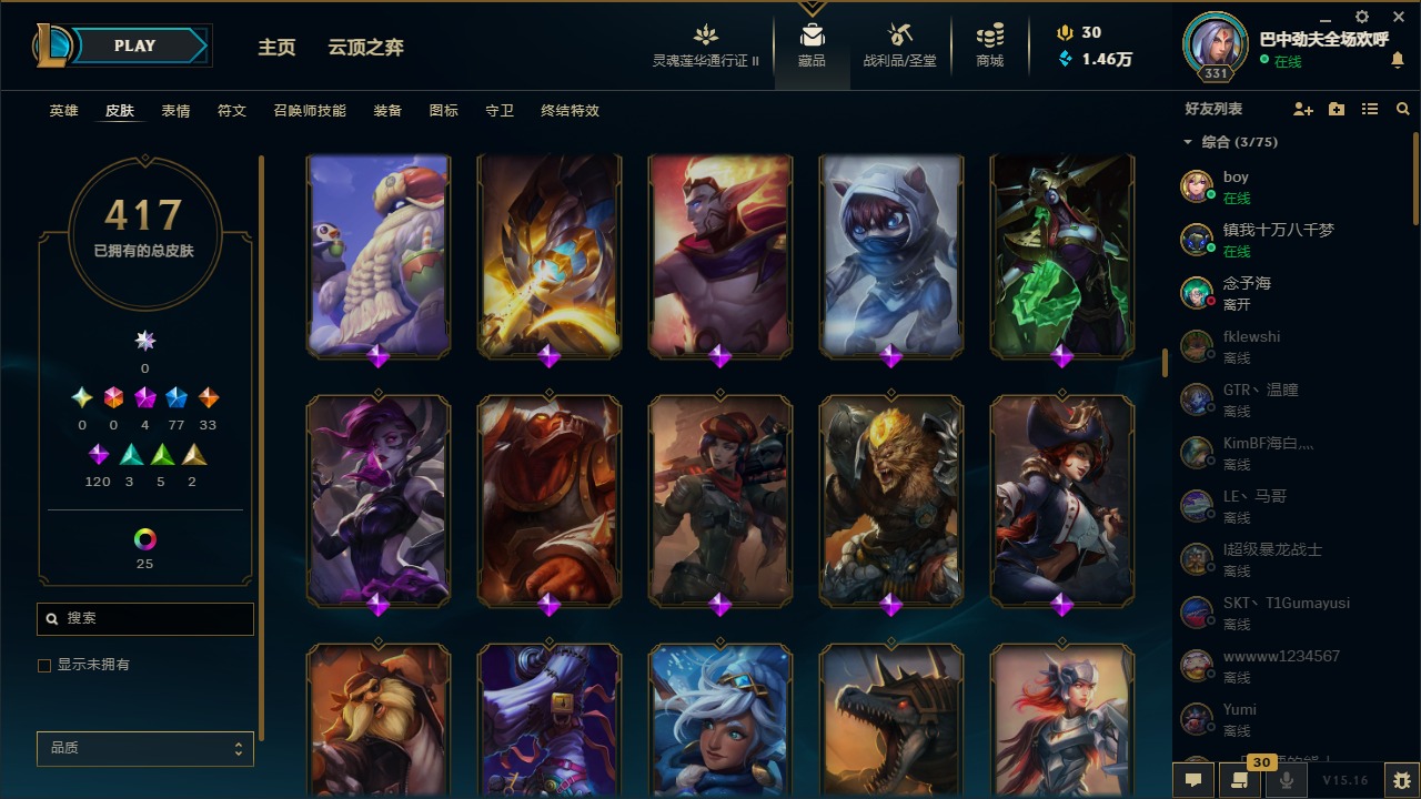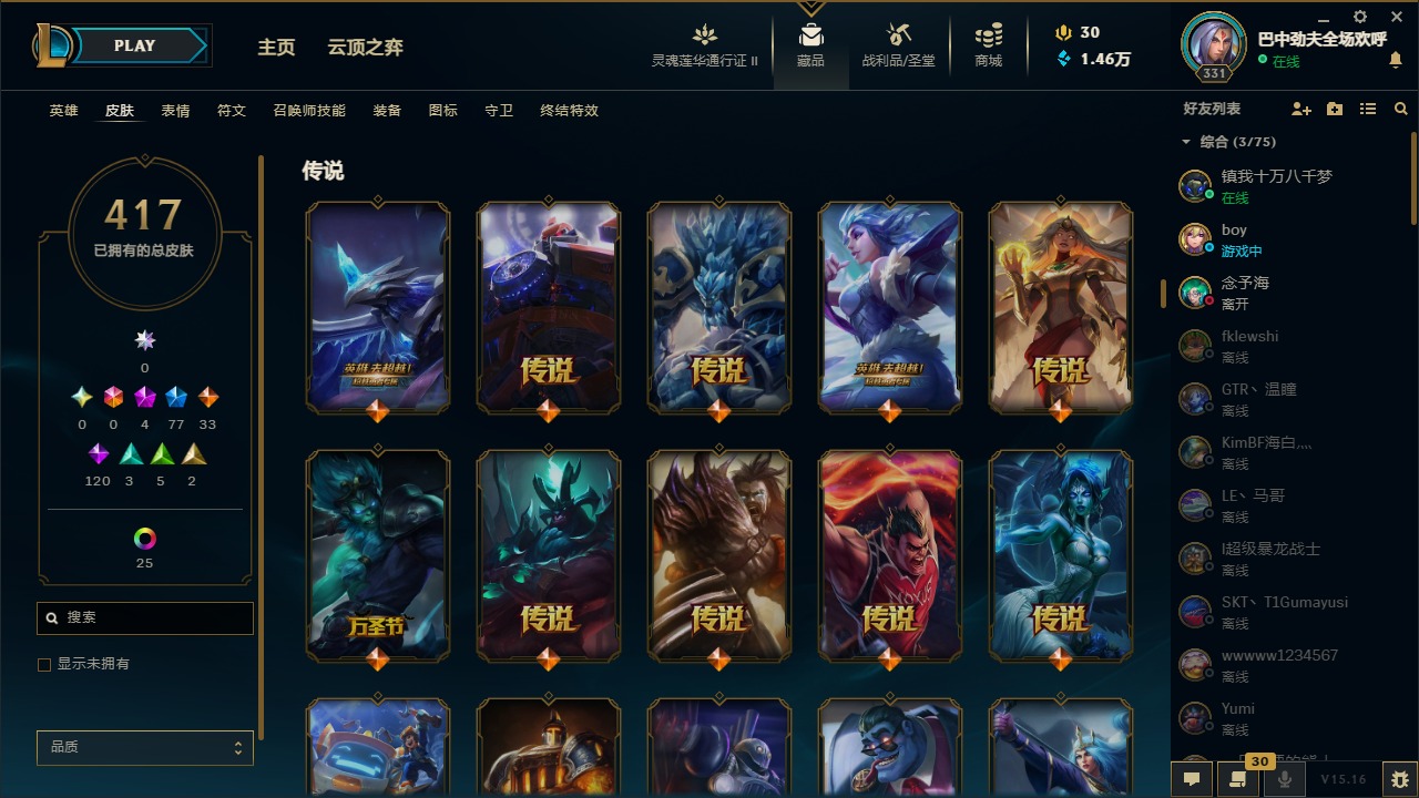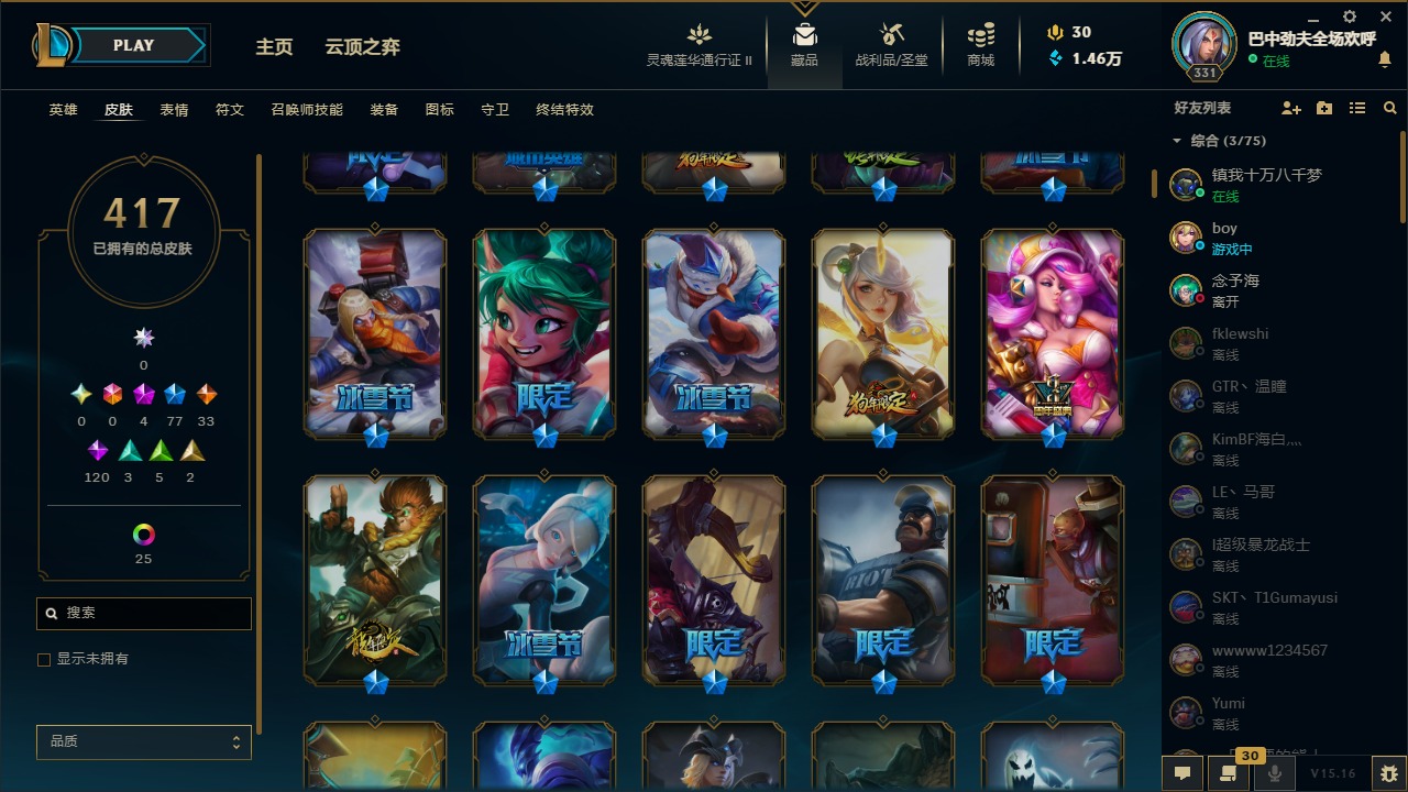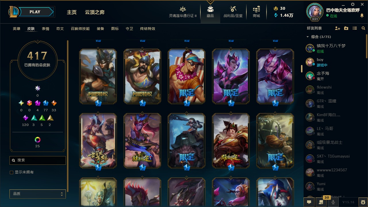 [11732896]可二次 可修改实名 4神话 8臻彩 77限定 33传说 120史诗 417皮肤 41炫彩 171英雄 铂金 皮肤:至臻 神龙尊者 炎龙瑟提,王国机神苍狼 瑟提,太空律动 “创乐之神” 奥恩,雷霆领主 奥恩,晨星之翎 洛,冰雪游神 巴德,腥红之月 卡莉丝塔,灌篮高手 艾翁,糖果之王 艾翁,上古战魂 雷克塞,虚空使者 俄洛伊,腥红之月 锤石,冠军典狱长 锤石,司马懿 仲达,星际之门 阿兹尔,海皇姬 娜美,鲛妮座人 娜美,胜利之剑 亚托克斯,仲裁圣骑 亚托克斯,源计划:裁决 蔚,虎痴之拳 蔚,霓虹杀拳 蔚,SKT T1 艾克,任性学霸 艾克,爵士 克烈,胜利枪神 卢锡安,纳财大帝 塔姆,海牛大大 塔姆,星之守护者 金克丝,神龙烈焰 金克丝,黯焰双魂 千珏,腥红之月 烬,西部牛仔 烬,糖果大战 布隆,布隆·狮心,猛虎 布隆,屠龙勇士 布隆,源代码 卡蜜尔,弗雷尔卓德 塔莉垭,这货不是维克兹,苍穹之光 维克兹,战地机甲 维克兹,源计划:风 亚索,西部牛仔 亚索,邪恶魔人 扎克,狂狮 纳尔,萌侦探 喵尔摩斯,最后一只恐龙 纳尔,魔女 婕拉,驯龙女巫 婕拉,SKT T1 婕拉,鬼影森森 婕拉,野火之藤 婕拉