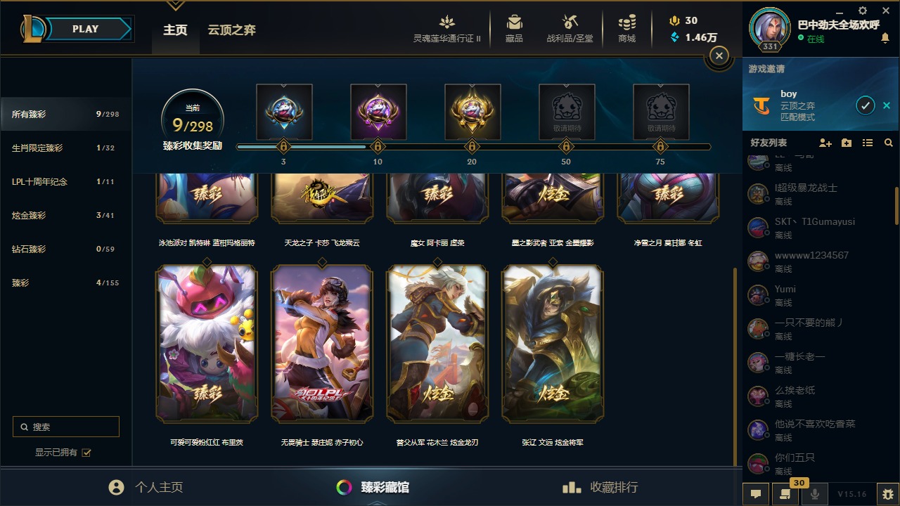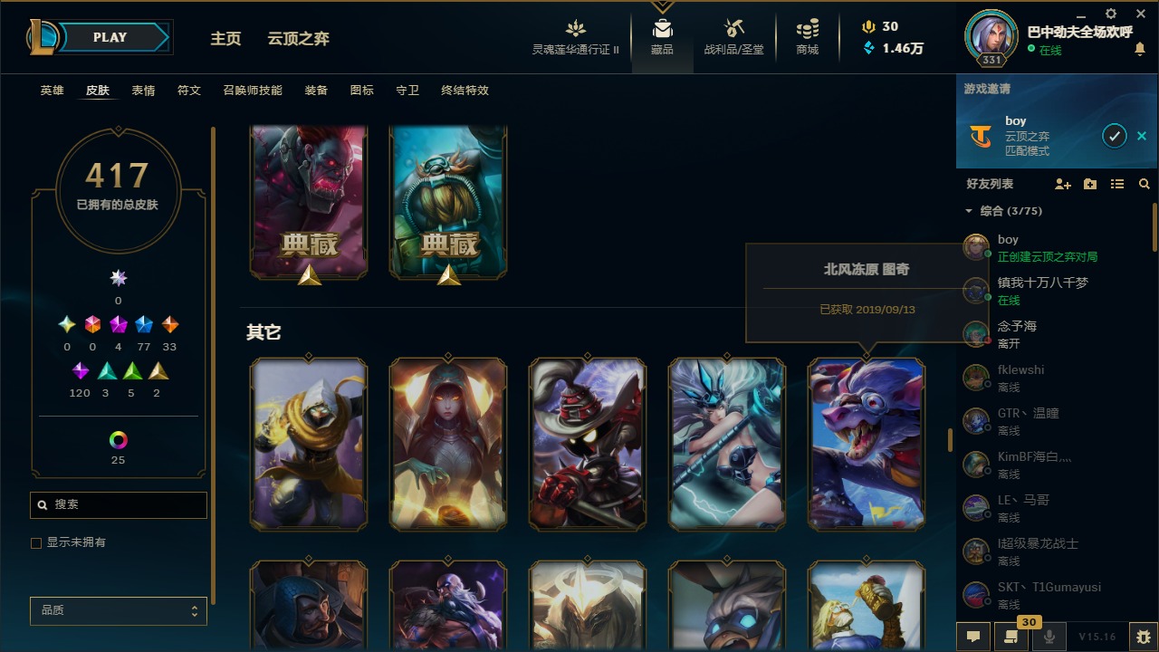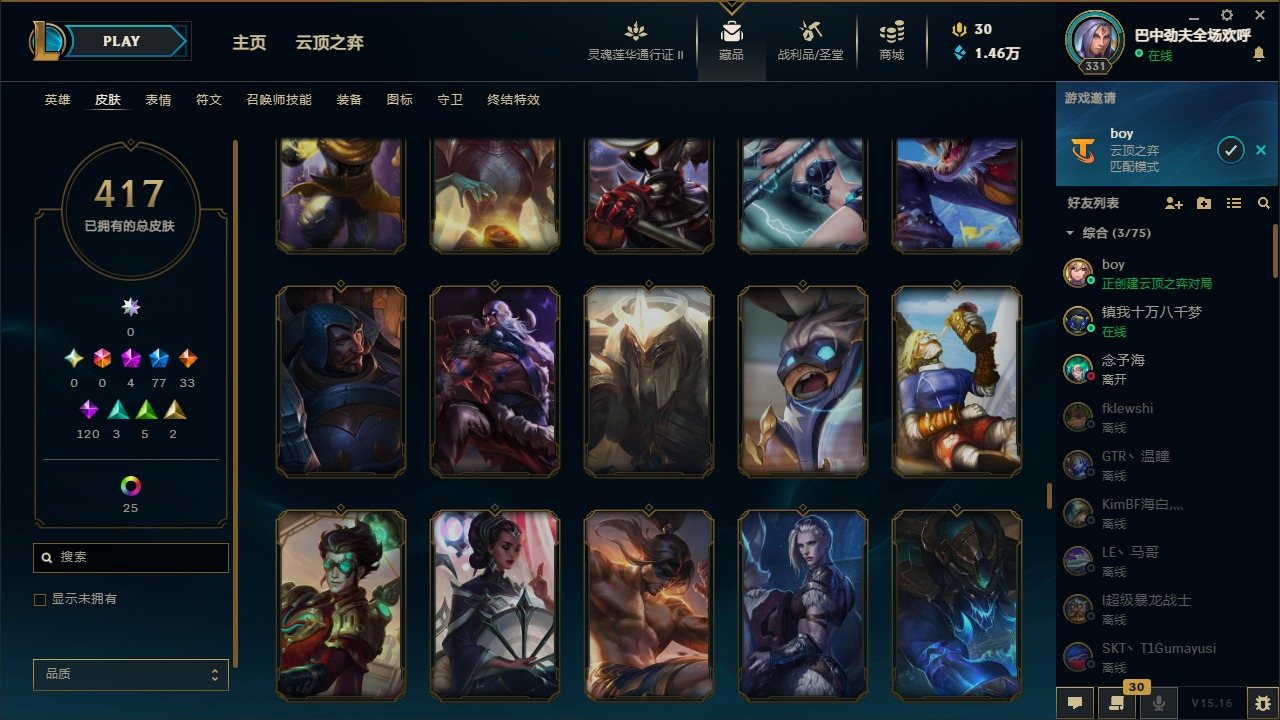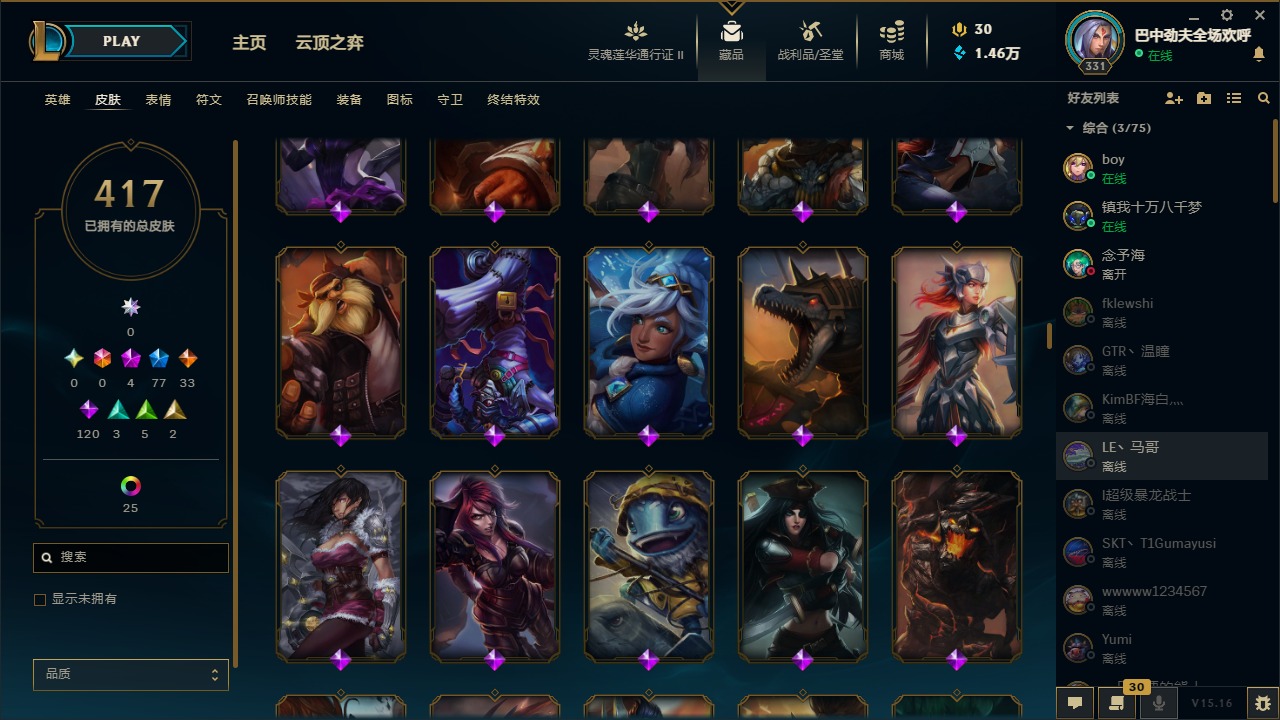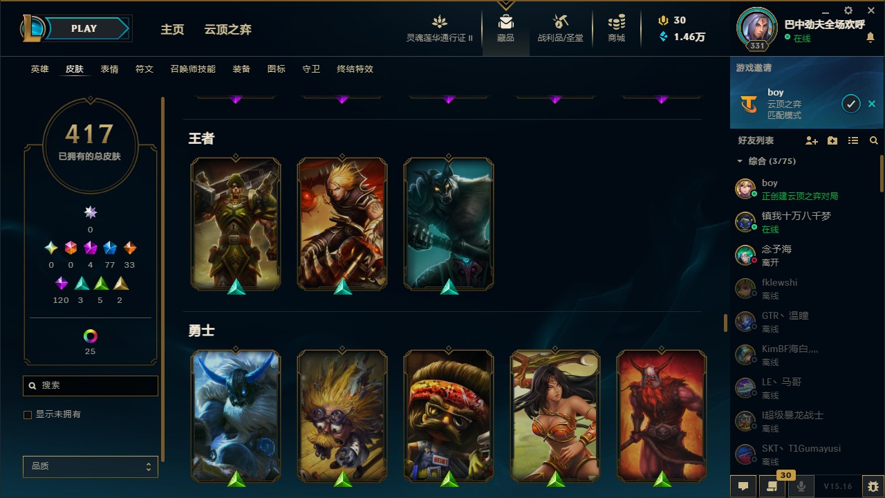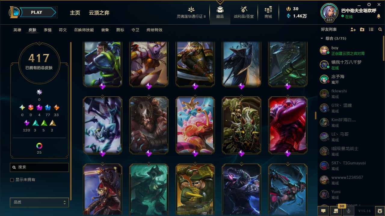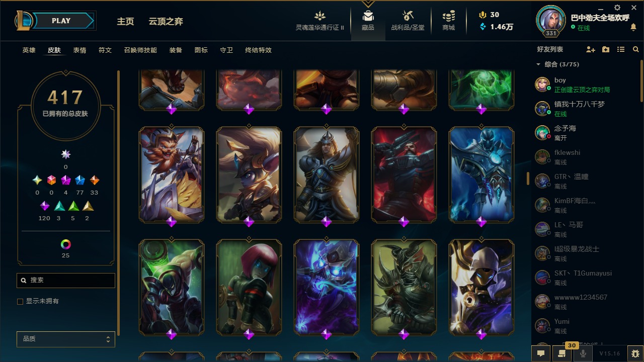 [11732896]可二次 可修改实名 4神话 8臻彩 77限定 33传说 120史诗 417皮肤 41炫彩 171英雄 铂金 皮肤:至臻 神龙尊者 炎龙瑟提,王国机神苍狼 瑟提,太空律动 “创乐之神” 奥恩,雷霆领主 奥恩,晨星之翎 洛,冰雪游神 巴德,腥红之月 卡莉丝塔,灌篮高手 艾翁,糖果之王 艾翁,上古战魂 雷克塞,虚空使者 俄洛伊,腥红之月 锤石,冠军典狱长 锤石,司马懿 仲达,星际之门 阿兹尔,海皇姬 娜美,鲛妮座人 娜美,胜利之剑 亚托克斯,仲裁圣骑 亚托克斯,源计划:裁决 蔚,虎痴之拳 蔚,霓虹杀拳 蔚,SKT T1 艾克,任性学霸 艾克,爵士 克烈,胜利枪神 卢锡安,纳财大帝 塔姆,海牛大大 塔姆,星之守护者 金克丝,神龙烈焰 金克丝,黯焰双魂 千珏,腥红之月 烬,西部牛仔 烬,糖果大战 布隆,布隆·狮心,猛虎 布隆,屠龙勇士 布隆,源代码 卡蜜尔,弗雷尔卓德 塔莉垭,这货不是维克兹,苍穹之光 维克兹,战地机甲 维克兹,源计划:风 亚索,西部牛仔 亚索,邪恶魔人 扎克,狂狮 纳尔,萌侦探 喵尔摩斯,最后一只恐龙 纳尔,魔女 婕拉,驯龙女巫 婕拉,SKT T1 婕拉,鬼影森森 婕拉,野火之藤 婕拉