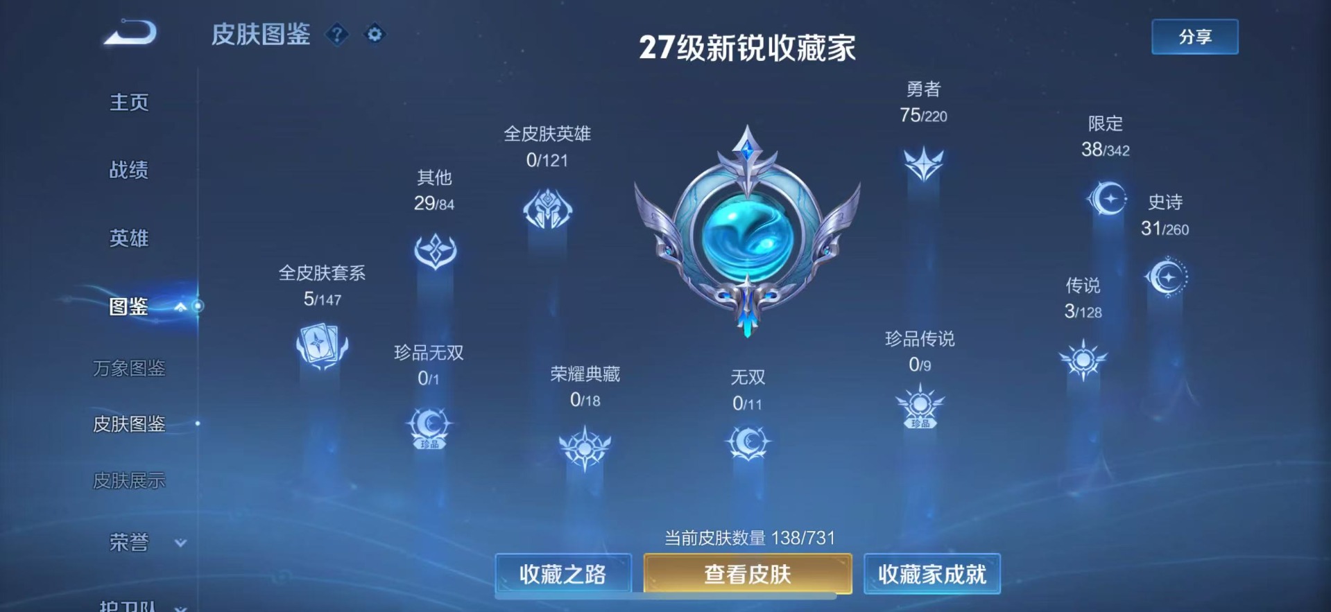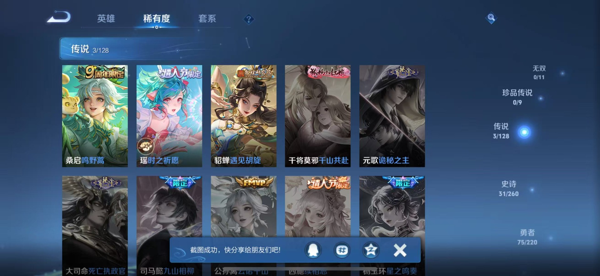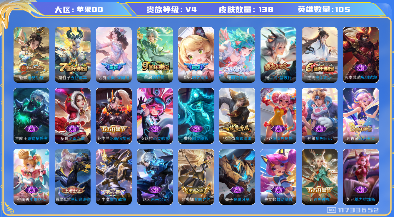 - [12227319]V8 1典藏 9传说 124英雄 330皮肤 可修改实名 优质装备:弑枪猎影(韩信典藏),黄金狮子座,冠军飞将,一念神魔,地狱火 珍宝阁皮:优雅恋人,女武神 限定皮:白虎志(电光耗子),凤求凰(白切鸡),武陵仙君(小桃花),时之彼端,飞衡(韩信年限),瑞麟志(木兰年限),遇见飞天,高山流水,五谷丰年,冰锋战神,游园惊梦,梁祝,天狼狩猎者,天狼征服者,李小龙,逐梦之影,逐梦之光,朱雀志(守约年限),辉光之辰,霸王别姬-项羽,圣诞老人,默契交锋-花木兰,真爱至上,猪悟能,一生所爱,大圣娶亲,天魔缭乱,青春决赛季,冰霜恋舞曲 史诗皮:鸭鸭历险记-刘禅,龙之律动,石田雨龙,遇见神鹿,紫霞仙子,苍穹之光,白龙吟,黄金分割率,特工魅影,千年之狐,江河有灵,魅语,百解令(蒙犽),蒙恬荣光圣徽,冰冠公主,暗夜猫娘,末日机甲-吕布,猫狗日记-孙策,时之恋人-孙尚香,乱世虎臣,节奏热浪,修罗,女仆咖啡,摇滚巨星,水果甜心,绅士熊喵,天才门将,星夜王子,心灵骇客,功夫厨神,德古拉伯爵,暗隐猎兽者,幽灵船长,鬼剑武藏,乐园奇幻夜,舞动绿茵,地狱岩魂,纤云弄巧,繁星吟游(呼啦呼啦),拒霜思,缤纷独角兽,乘风破浪,逐浪之夏,水晶猎龙者,曙光守护者,箭羽风息,金属风暴,原初追逐者,圣诞狂欢,圣诞恋歌,鹰眼统帅,王者之锤,暗夜贵公子,魅力维加斯,黎明之约,无心,未来纪元-赵云