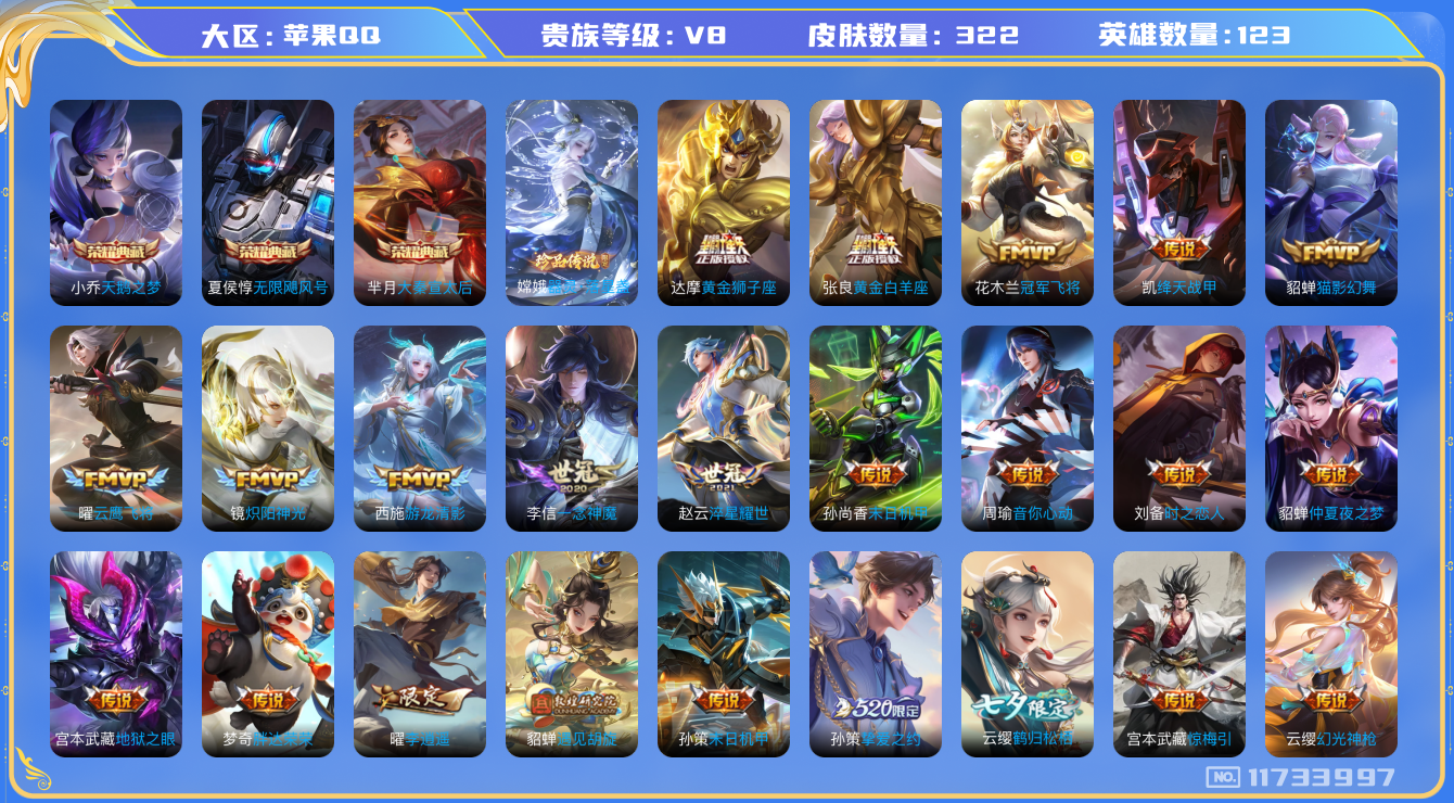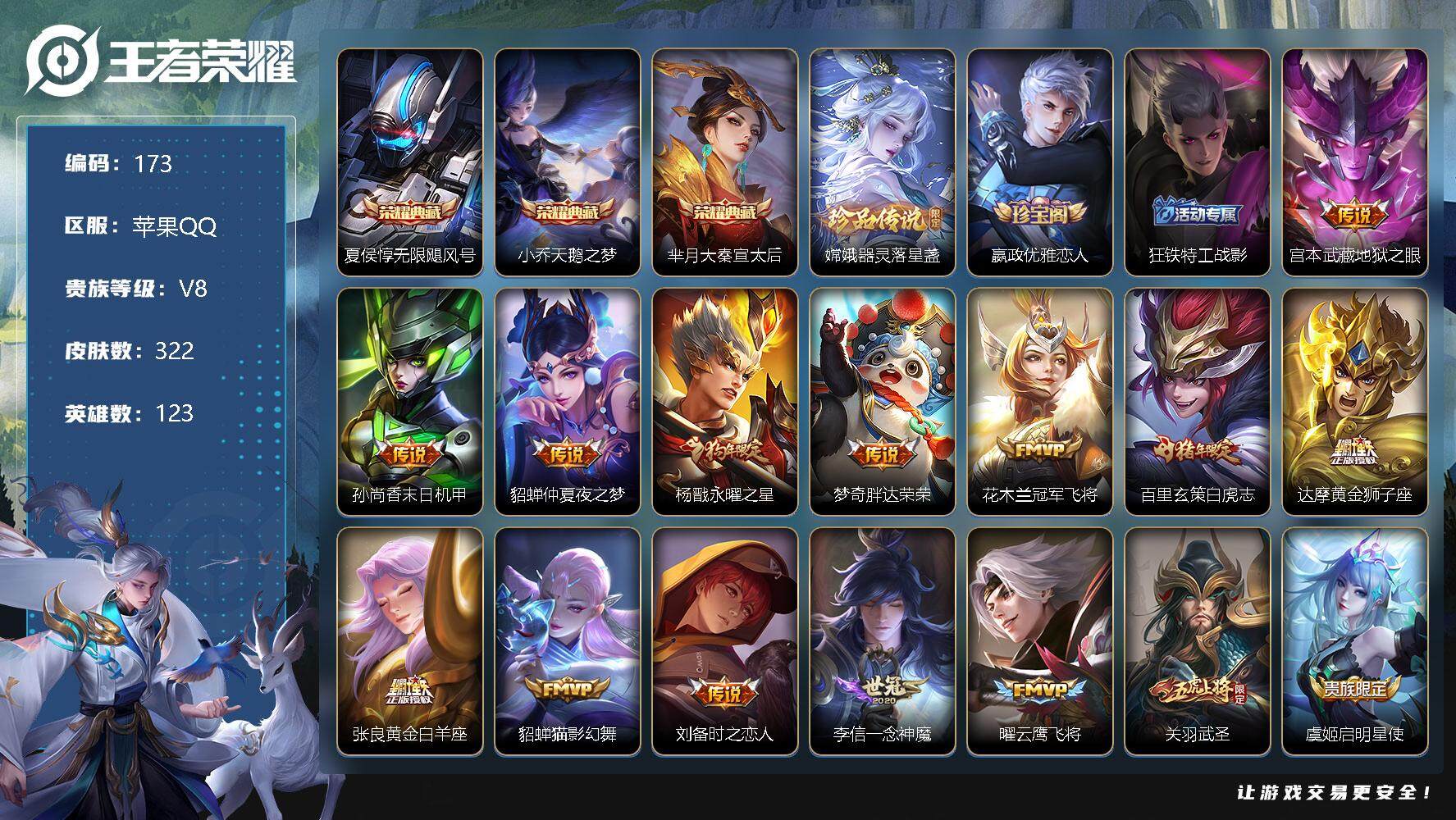 [11733997]【商品标题】:苹果Q-V8-永恒钻石IV段位-123英雄-322皮肤-3典藏-0珍品无双-0无双-1珍品传说-31传说-94史诗
