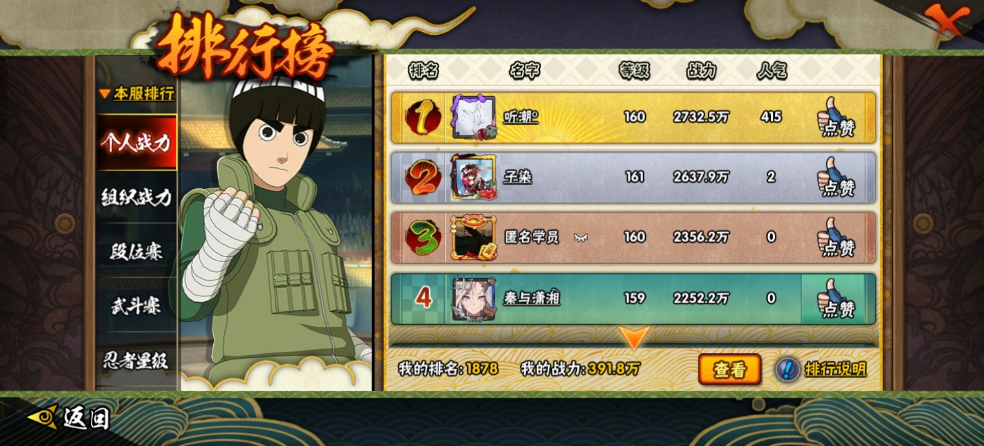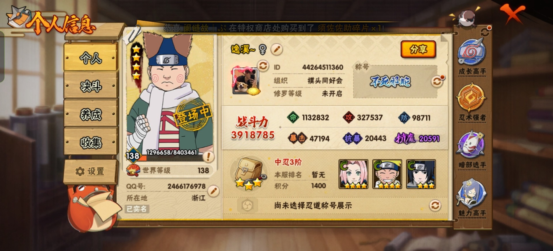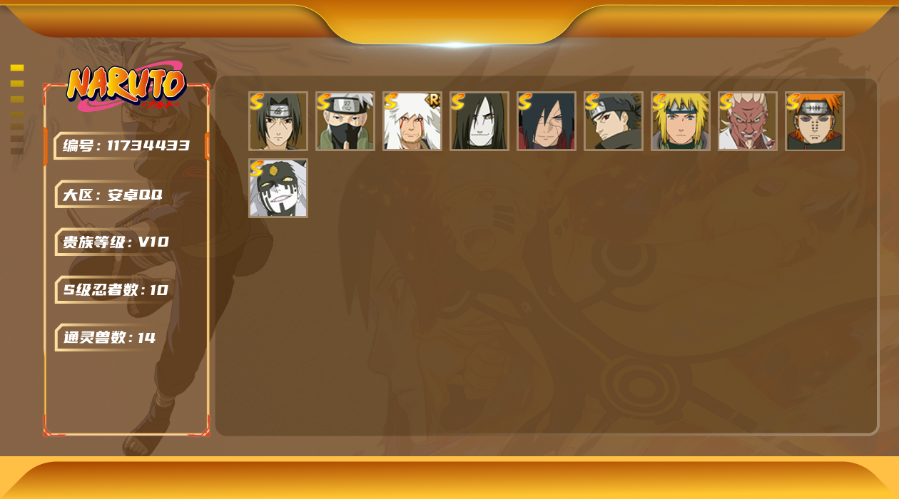 [11734433]V10 10S忍 22A忍 14通灵 391.8W战力 可二次 可修改实名 优质装备:宇智波斑「秽土转生·解」,大筒木桃式,艾「忍界大战」,宇智波止水「须佐能乎」,旗木卡卡西「须佐能乎」 S级忍者:自来也 「舞之豪杰」,宇智波鼬 「须佐能乎」,佩恩「天道」,波风水门,大蛇丸