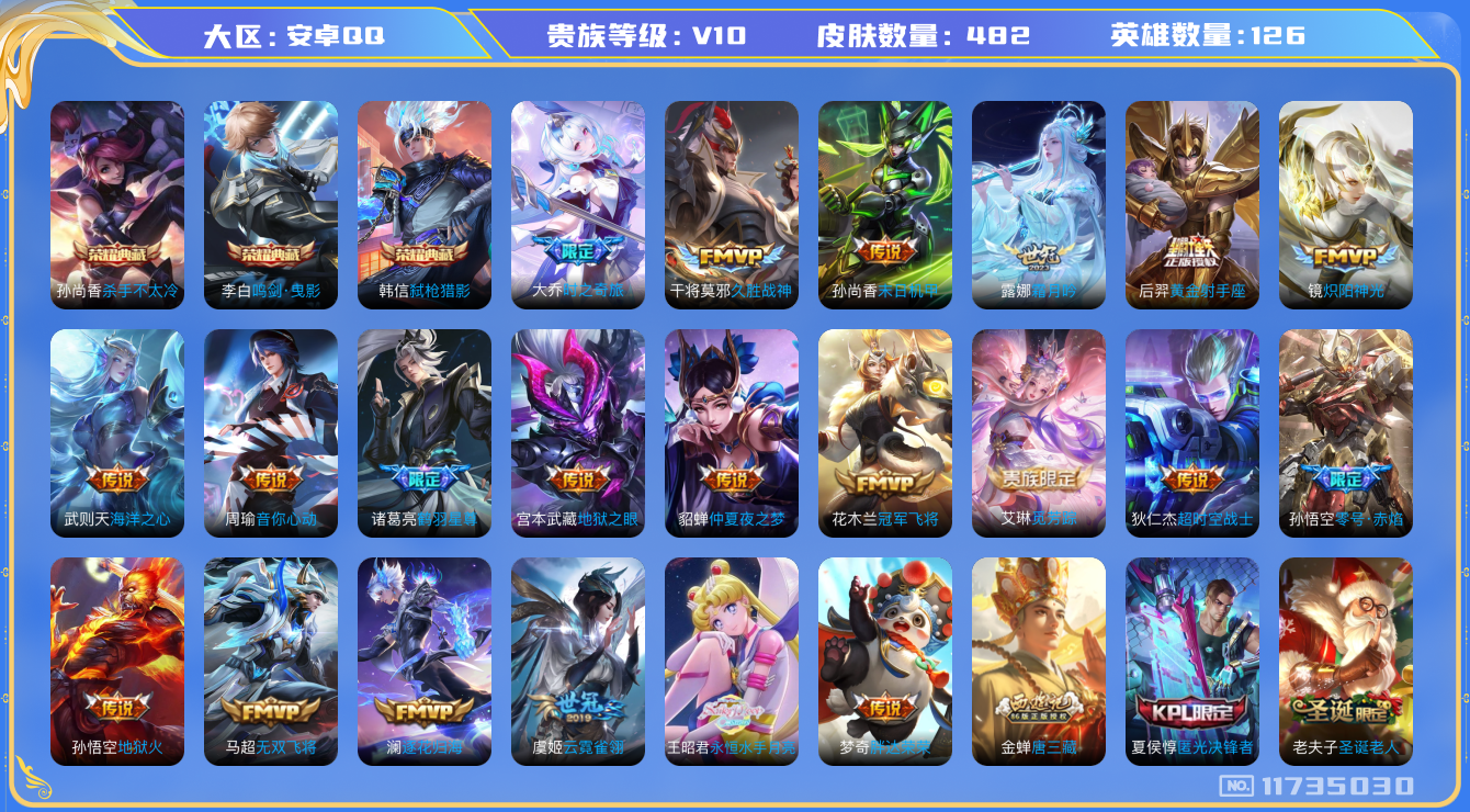 [11735030]V10 3典藏 35传说 126英雄 482皮肤 典藏英雄武则天 牛魔大国标 孙膑小国标 武则天小国标 墨子小国标 钟馗小国标 大乔小国标 苏烈小国标 女号 可修改实名 优质装备:杀手不太冷,鸣剑·曳影,弑枪猎影(韩信典藏),黄金射手座,冠军飞将,久胜战神,炽阳神光,云霓雀翎,末日机甲-孙尚香(绿蚂蚱),地狱火,仲夏夜之梦(大飞蛾),零号·赤焰,海洋之心,地狱之眼,音你心动-周瑜,胖达荣荣,超时空战士-狄仁杰,无双飞将,鹤羽星尊,大乔-时之奇旅,永恒水手月亮,霜月吟,澜逐花归海,艾琳觅芳踪,涂山容容 珍宝阁皮:妄想食味,蔷薇恋人,女武神 限定皮:愿照·九州拓(澜年限),愿照·福禄聚(蔡文姬年限),逐霄战戟,鸣野蒿,凤求凰(白切鸡),武陵仙君(小桃花),异界灵契(白毛香),傲雪梅枪,寅虎·展翼(孙膑年限),前尘镜,绯月行,白晶晶,神威(电光马子),飞衡(韩信年限),至美·乘鲤谣,遇见飞天,高山流水,诗剑行,匿光决锋者,降魔,五谷丰年,冰锋战神,天狼运算者,游园惊梦,梁祝,御风骁将(吕布年限),龙胆,逐梦之星,天狼溯光者,祈雪灵祝(雪兔子),李小龙,逐梦之影,如梦令-嫦娥,霸王别姬-虞姬,圣诞老人,默契交锋-花木兰,孙行者,猪悟能,大圣娶亲,冰霜恋舞曲,乒乒小将,热情桑巴,美猴王,匿光追影者,寅虎·御盾(廉颇年限),寅虎·赤拳(老虎年限),时之祈愿-云中君,百木心枪,玉兔公主,启示之音,深海之息(深海大菠萝),唐三藏,山海·玄木吟(马可年限) 史诗皮:鸭鸭历险记-刘禅,化蝶舞,灵蛊蚀心,星界战将,石田雨龙,百相守梦-周瑜,茶境仙,幻珠鲛人,炽弈燎原,破空之剑,涂山红红,埋骨钱,琥珀纪元伽罗,蔬乡物语(鲁班七号),超元猎域,乘龙·忆丹青(大乔年限),百相守梦-百里守约,百相守梦-黄忠,织梦人,遇见神鹿,紫霞仙子,苍穹之光,电玩小子(小书包),白龙吟,黄金分割率,特工魅影,千年之狐,永昼,江河有灵,雪夜绮愿(周瑜),闲日渔趣,魅语,百解令(蒙犽),高渐离燃音魔法,蒙恬荣光圣徽,无限星赏官,匿光破解者,冰冠公主,青蛇,偶像歌手,白蛇,晚萤,电玩·爆裂旋风,暗夜猫娘,银翎春语,龙骑士(小龙虾),末日机甲-吕布,猫狗日记-孙策,猫狗日记-大乔,时之恋人-孙尚香,乱世虎臣,节奏热浪,修罗,女仆咖啡,摇滚巨星,水果甜心,绅士熊喵,天才门将,星夜王子,心灵骇客,
