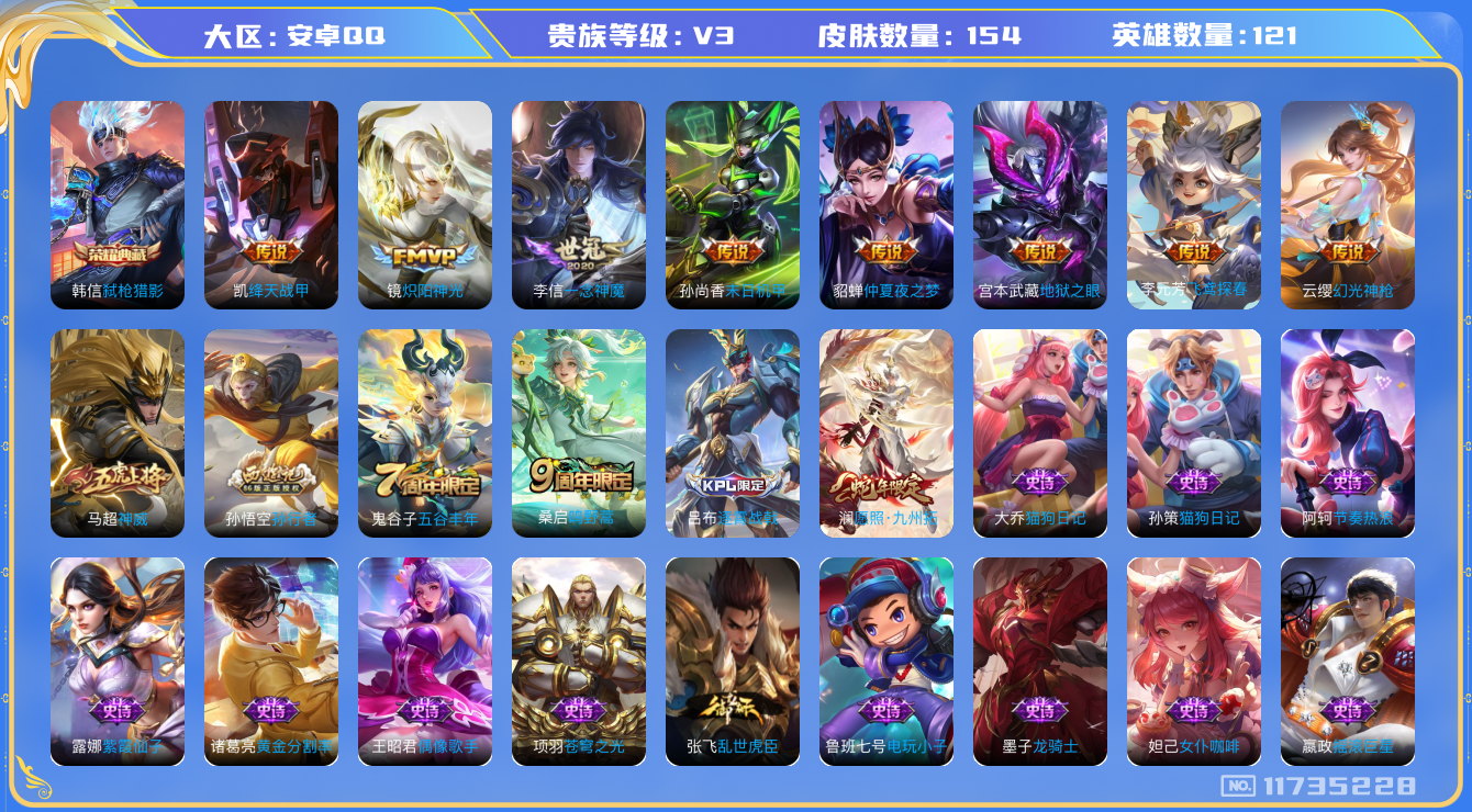 [11735228]【商品标题】:安卓Q-V3-永恒钻石III段位-121英雄-154皮肤-1典藏-0珍品无双-0无双-0珍品传说-10传说-47史诗