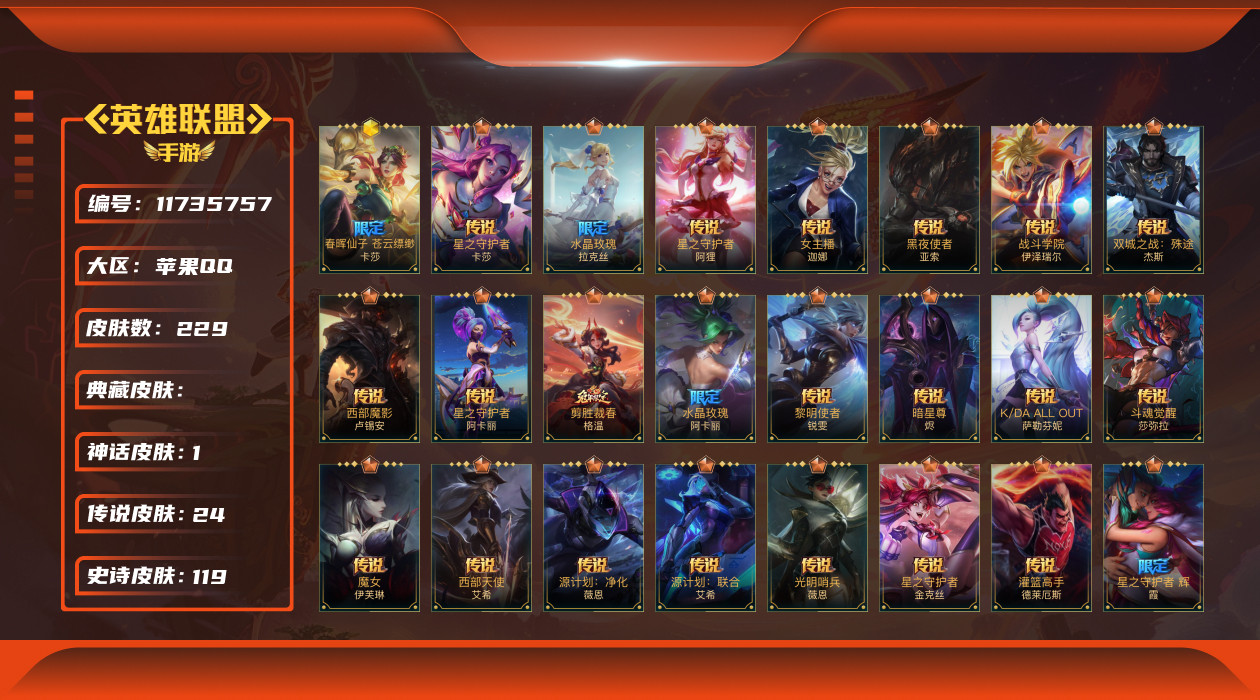 [11735757]24传说 119史诗 229皮肤 可二次 可修改实名 优质装备:暗星尊,灌篮高手,光明哨兵薇恩,黑夜使者亚索,K/DA ALLOUT萨勒芬妮,黎明使者锐雯,女主播风女,欧米伽小队 幽灵特工,水晶玫瑰阿卡丽,水晶玫瑰拉克丝,西部魔影卢锡安,西部天使寒冰,星之守护者金克丝,星之守护者阿狸,星之守护者 辉,源计划:净化,源计划:联合,战斗学院ez,剪胜裁春格温,水晶玫瑰拉克丝,星之守护者卡莎,魔女伊芙琳,春晖仙子苍云缥缈卡莎,斗魂觉醒 莎弥拉 段位:翡翠 限定皮肤:掠星魔刃,御星魔矢,斩星魔剑,水晶玫瑰皇子,水晶玫瑰阿卡丽,水晶玫瑰蔚 传说皮:双城之战:殊途 杰斯,星之守护者 阿卡丽 亮点:暗星尊,灌篮高手,光明哨兵薇恩,黑夜使者亚索,K/DA ALLOUT萨勒芬妮,黎明使者锐雯,女主播风女,欧米伽小队 幽灵特工,水晶玫瑰阿卡丽,水晶玫瑰拉克丝,西部魔影卢锡安,西部天使寒冰,星之守护者金克丝,星之守护者阿狸,星之守护者 辉,源计划:净化,源计划:联合,战斗学院ez,剪胜裁春格温,水晶玫瑰拉克丝,星之守护者卡莎,魔女伊芙琳,春晖仙子苍云缥缈卡莎,斗魂觉醒 莎弥拉