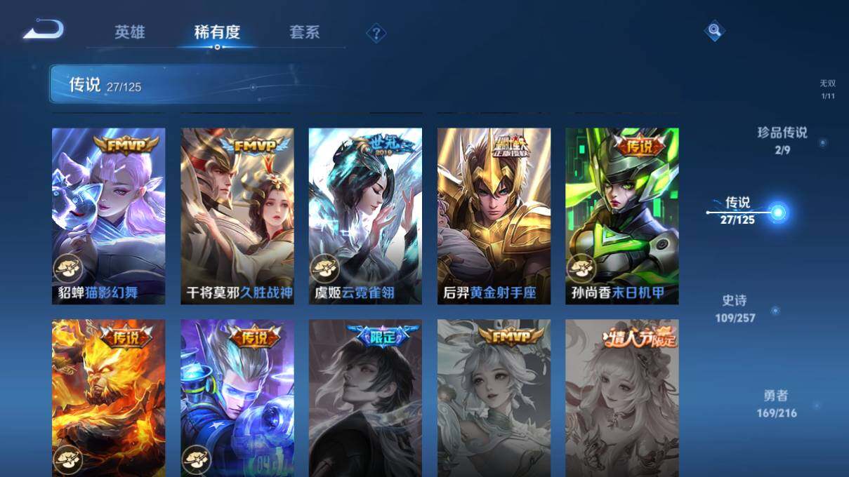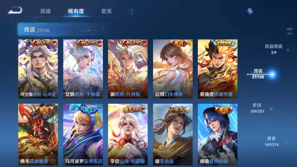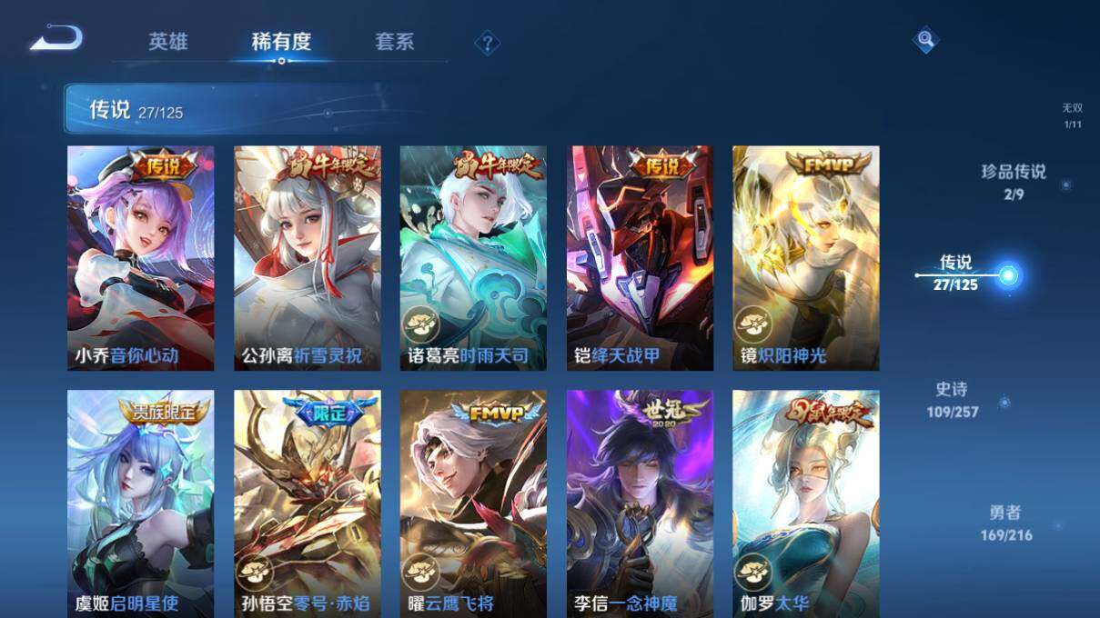 【传说皮肤】:狄仁杰超时空战士,孙悟空地狱火,孙尚香末日机甲,后羿黄金射手座,虞姬云霓雀翎,干将莫邪久胜战神,貂蝉猫影幻舞,伽罗太华,李信一念神魔,曜云鹰飞将,孙悟空零号赤焰,虞姬启明星使,镜炽阳神光,铠绛天战甲,诸葛亮时雨天司,公孙离祈雪灵祝,小乔音你心动,周瑜音你心动,曜李逍遥 ,李信山海炽霜斩,马可波罗妄想实况,典韦战鼓燎原,裴擒虎祥瑞亨通,云缨幻光神枪,澜愿照九州拓,女娲愿照千秋盛,司空震愿照山河定