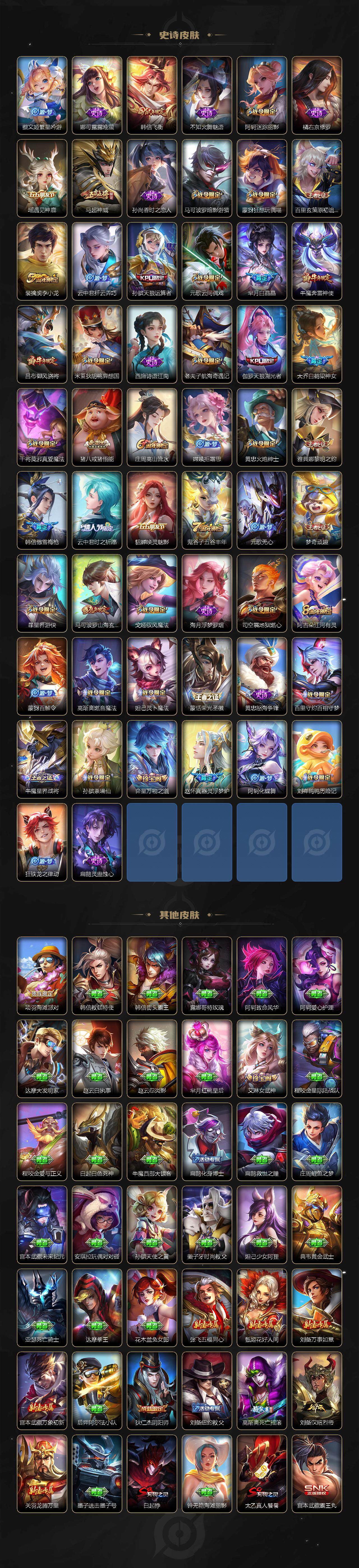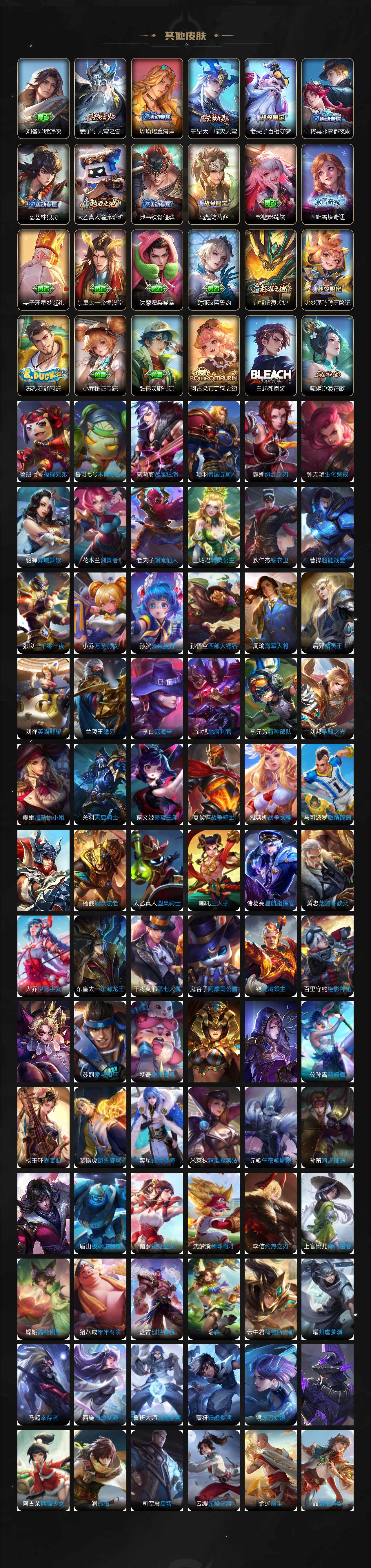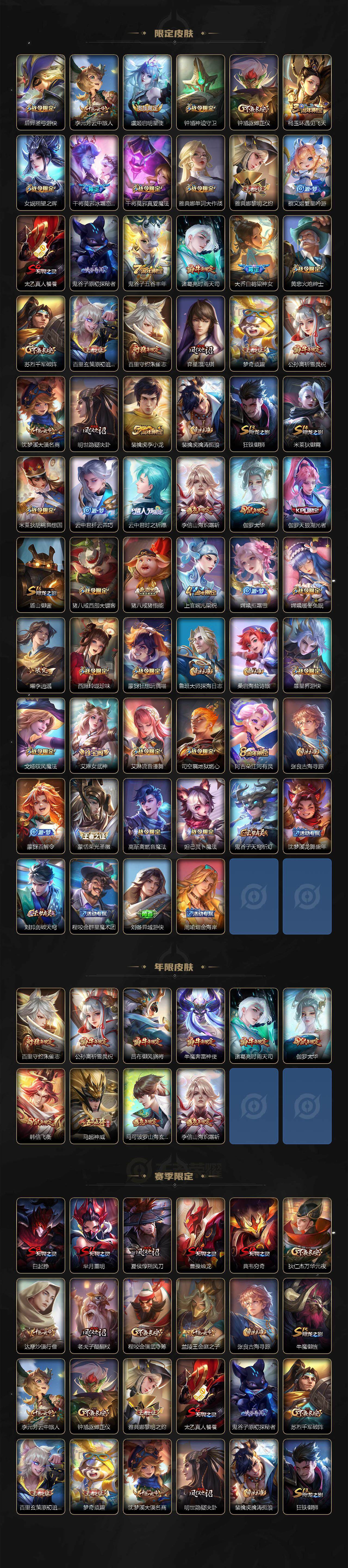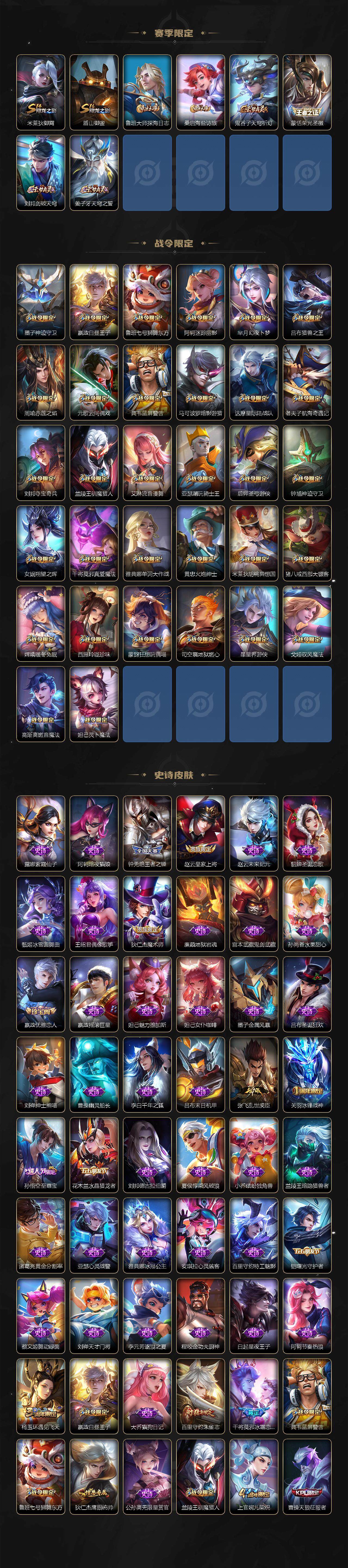 【限定皮肤】:白起狰,姜子牙天穹之誓,狄仁杰阴阳师,赵云皇家上将,墨子神迹守卫,嬴政优雅恋人,嬴政白昼王子,鲁班七号狮舞东方,庄周高山流水,高渐离死亡摇滚,阿轲迷踪丽影,钟无艳王者之锤,孙膑天狼运算者,芈月重明,芈月白晶晶,芈月幻夜卜梦,吕布猎兽之王,吕布御风骁将,周瑜赤莲之焰,元歌云间偶戏,元歌无心,夏侯惇朔风刀,曹操烛龙,曹操天狼征服者,典韦穷奇,典韦蓝屏警告,马可波罗暗影游猎,马可波罗山海玄木吟,马可波罗妄想实况,狄仁杰魔术师,狄仁杰万华元夜,达摩星际陆战队,达摩沙漠行僧,项羽海滩派对,老夫子醍醐杖,老夫子航海奇遇记,关羽冰锋战神,程咬金演武夺筹,刘邦夺宝奇兵,韩信飞衡,韩信傲雪梅枪,兰陵王驯魔猎人,兰陵王金庭之子,亚瑟潮玩骑士王,孙悟空至尊宝,孙悟空零号赤焰,牛魔御旌,牛魔奔雷神使,后羿圣弓游侠,李元芳云中旅人,虞姬启明星使,钟馗神迹守卫,钟馗驱傩正仪,杨玉环遇见飞天,女娲朔望之晖,干将莫邪冰霜恋舞曲,干将莫邪真爱魔法,雅典娜单词大作战,雅典娜黎明之约,蔡文姬繁星吟游,太乙真人饕餮,鬼谷子原初探秘者,鬼谷子五谷丰年,诸葛亮时雨天司,大乔白鹤梁神女,黄忠火炮绅士,苏烈千军破阵,百里玄策原初追逐者,百里守约朱雀志,弈星混沌棋,梦奇顽趣,公孙离祈雪灵祝,沈梦溪大漠名商,明世隐疑决卦,裴擒虎李小龙,裴擒虎擒涛扼浪,狂铁御狮,米莱狄御霄,米莱狄胡桃异想国,云中君纤云弄巧,云中君时之祈愿,李信山海炽霜斩,伽罗太华,伽罗天狼溯光者,盾山御銮,猪八戒西部大镖客,猪八戒猪