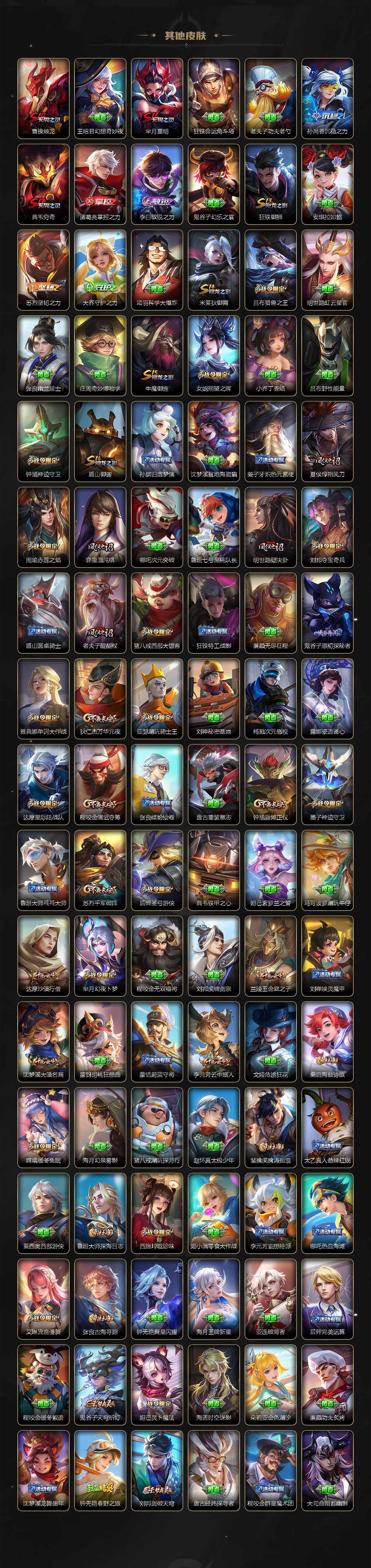 瑶遇见神鹿,娜可露露晚萤,李元芳逐浪之夏,不知火舞魅语,公孙离无限星赏官,大乔猫狗日记,阿轲节奏热浪,露娜紫霞仙子,诸葛亮黄金分割率,王昭君偶像歌手,孙尚香时之恋人,阿轲暗夜猫娘,雅典娜冰冠公主,吕布末日机甲,橘右京修罗,嬴政摇滚巨星,刘禅绅士熊喵,刘禅天才门将,白起星夜王子,安琪拉心灵骇客,程咬金功夫厨神,刘邦德古拉伯爵,兰陵王暗隐猎兽者,曹操幽灵船长,宫本武藏鬼剑武藏,亚瑟心灵战警,蔡文姬舞动绿茵,廉颇地狱岩魂,西施诗语江南,小乔缤纷独角兽,夏侯惇乘风破浪,花木兰水晶猎龙者,铠曙光守护者,墨子金属风暴,百里玄策原初追逐者,吕布圣诞狂欢,貂蝉圣诞恋歌,百里守约特工魅影,嫦娥拒霜思,雅典娜黎明之约,李白千年之狐,貂蝉唤灵魅影,海月浮梦罗烟,蒙犽百解令,高渐离燃音魔法,赵怀真器灵·浮梦炉