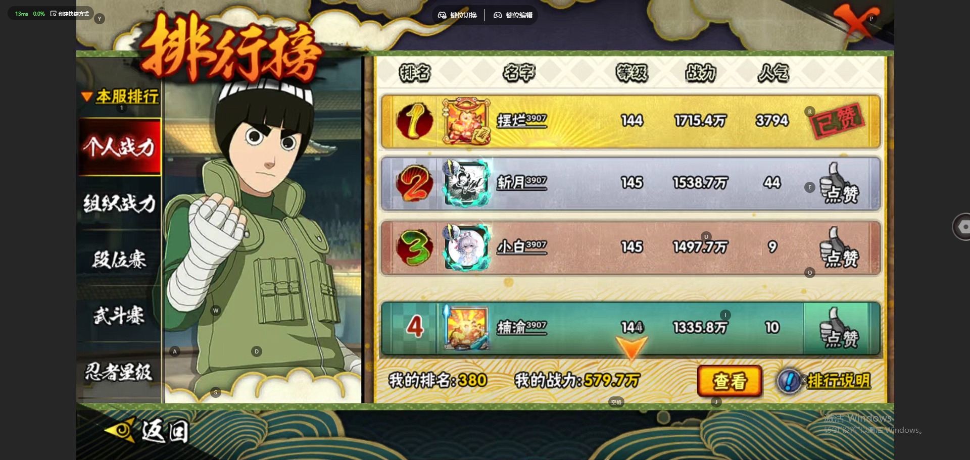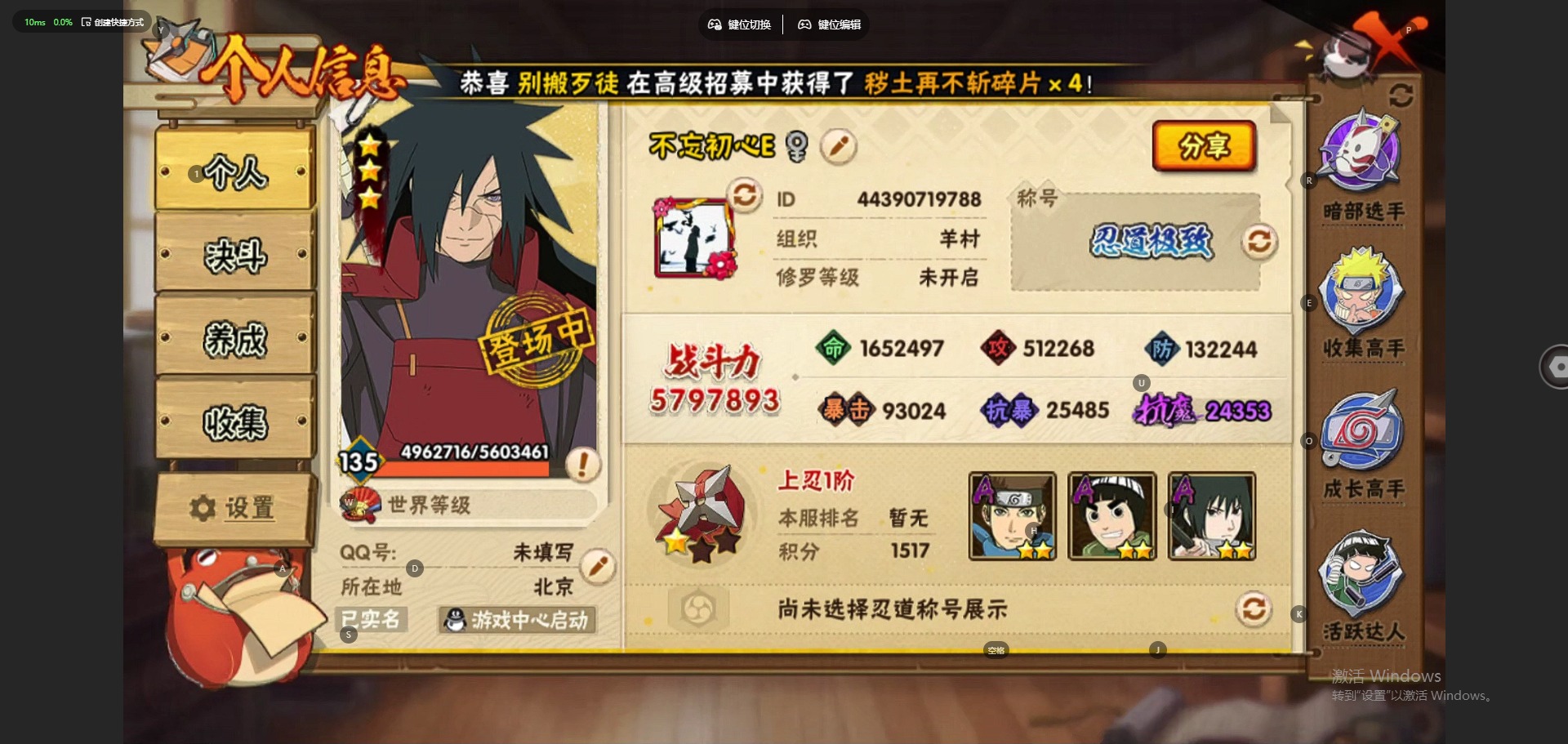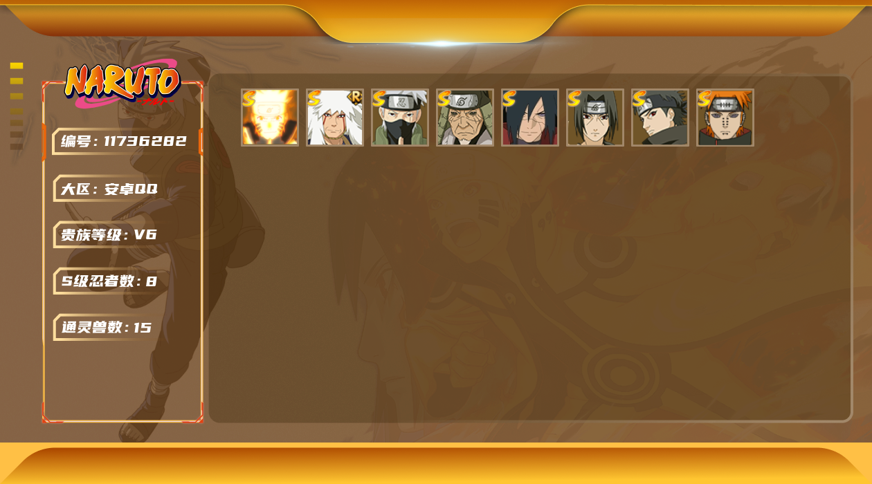[11736282]V6 8S忍 26A忍 15通灵 579.7W战力 可二次 可修改实名 优质装备:猿飞日斩「秽土转生」,漩涡鸣人 「九喇嘛连结」,宇智波斑「秽土转生·解」,宇智波止水「须佐能乎」,旗木卡卡西「须佐能乎」 S级忍者:自来也 「舞之豪杰」,宇智波鼬 「须佐能乎」,佩恩「天道」