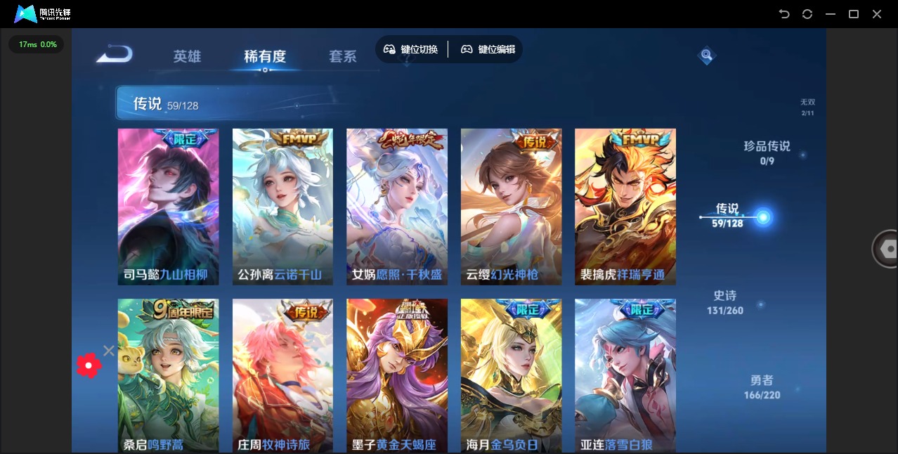 - [12002225]V7 1典藏 1珍品传说 9传说 125英雄 203皮肤 可修改实名 优质装备:鸣剑·曳影,怪盗基德,炽阳神光,山海·炽霜斩(李信年限) 传说皮:祥瑞亨通,幻光神枪 珍宝阁皮:万物之道,蔷薇恋人 限定皮:愿照·九州拓(澜年限),愿照·岁时盈(虞姬年限),愿照·山河定(司空震年限),鸣野蒿,遇见飞天,诗剑行,五谷丰年,李小龙,山海·玄木吟(马可年限) 史诗皮:星界战将,龙之律动,茶境仙,怒海争锋,破空之剑,蒙犽顽岩魄,百相守梦-百里守约,紫霞仙子,苍穹之光,电玩小子(小书包),黄金分割率,特工魅影,江河有灵,真我赫兹(镜),魅语,百解令(蒙犽),蒙恬荣光圣徽,偶像歌手,白蛇,电玩·爆裂旋风,末日机甲-吕布,乱世虎臣,节奏热浪,摇滚巨星,水果甜心,星夜王子,心灵骇客,功夫厨神,暗隐猎兽者,幽灵船长,鬼剑武藏,天秀·启明,缤纷独角兽,乘风破浪,逐浪之夏,月团寄思,水晶猎龙者,曙光守护者,箭羽风息,唤灵魅影,金属风暴,原初追逐者,圣诞狂欢,圣诞恋歌,鹰眼统帅,黎明之约,赏金猎手,无心,未来纪元-赵云