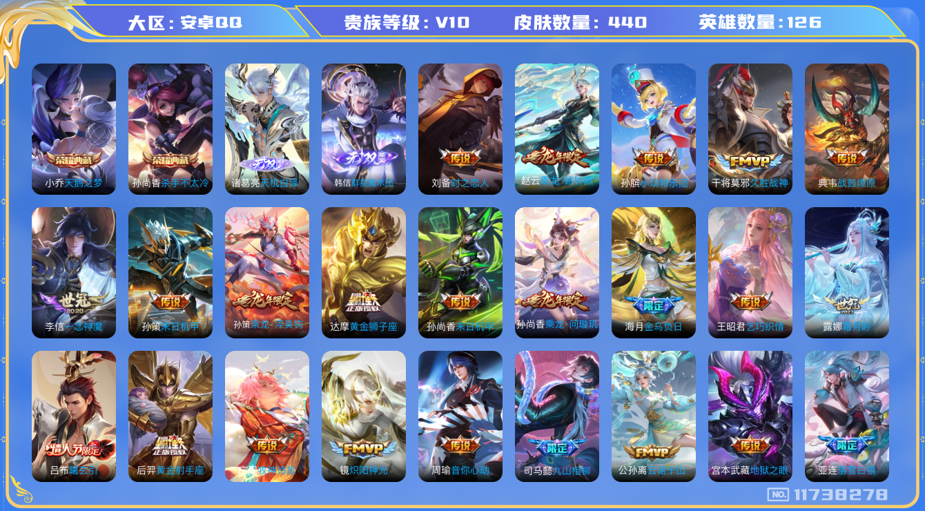 [11738278]V10 2典藏 2无双 59传说 126英雄 440皮肤 典藏英雄武则天 可修改实名 优质装备:天鹅之梦(小乔典藏),杀手不太冷,韩信群星魔术团(韩信无双),天机白泽,黄金狮子座,黄金射手座,冠军飞将,云鹰飞将(小将军),黄金白羊座,猫影幻舞,久胜战神,炽阳神光,一念神魔,云霓雀翎,末日机甲-孙尚香(绿蚂蚱),地狱火,仲夏夜之梦(大飞蛾),地狱之眼,飞鸢探春,音你心动-周瑜,胖达荣荣,李逍遥,乞巧织情,时之恋人-刘备(电焊工),游龙清影(小青龙),超时空战士-狄仁杰,末日机甲-孙策,花朝如约(花篮子),无双飞将,神器·狴犴令,灼幽烈阳,惊梅引,小动物乐团,霜月吟,澜逐花归海,艾琳觅芳踪,金乌负日,黄金天蝎座,牧神诗旅 传说皮:乘龙·问璇玑(孙尚香年限),乘龙·铭钟鼎(赵云年限),乘龙·淬吴钩(孙策年限),貂蝉曦玄引,吕布曦玄引,典韦战鼓燎原,落雪白狼,九山相柳,云诺千山,祥瑞亨通,幻光神枪 珍宝阁皮:妄想食味,女武神,玩趣恶龙 限定皮:愿照·千秋盛(女娲年限),鸣野蒿,至尊宝,白虎志(电光耗子),凤求凰(白切鸡),凤凰于飞,太华(伽罗年限),武陵仙君(小桃花),傲雪梅枪,时之彼端,白鹤梁神女,神威(电光马子),飞衡(韩信年限),玄嵩(庄周年限),山海·碧波行(瑶年限),遇见飞天,高山流水,诗剑行,怒海麟威,五谷丰年,幽恒(沐浴露),梁祝,御风骁将(吕布年限),岱宗(典韦年限),天狼征服者,天狼绘梦者,李小龙,逐梦之影,朱雀志(守约年限),永曜之星,辉光之辰,如梦令-嫦娥,如梦令-后羿,圣诞老人,一生所爱,大圣娶亲,天魔缭乱,冰霜恋舞曲,乒乒小将,蜜橘之夏,时之祈愿-瑶(瑶传限),枫霜尽,山海·玄木吟(马可年限) 史诗皮:赞萌露比,苍鳞隐世,灵蛊蚀心,星界战将,龙之律动,石田雨龙,百相守梦-周瑜,幻珠鲛人,奇遇星旅,蔬乡物语(鲁班七号),乘龙·聚宝船(安琪拉年限),乘龙·忆丹青(大乔年限),百相守梦-黄忠,遇见神鹿,紫霞仙子,苍穹之光,电玩小子(小书包),白龙吟,黄金分割率,特工魅影,千年之狐,永昼,魅语,高渐离燃音魔法,蒙恬荣光圣徽,无限星赏官,冰冠公主,青蛇,偶像歌手,白蛇,晚萤,龙骑士(小龙虾),末日机甲-吕布,猫狗日记-孙策,猫狗日记-大乔,时之恋人-孙尚香,乱世虎臣,节奏热浪,修罗,女仆咖啡,摇滚巨星,水果甜心,绅士熊喵,天才门将,星夜王子,心灵骇客,功