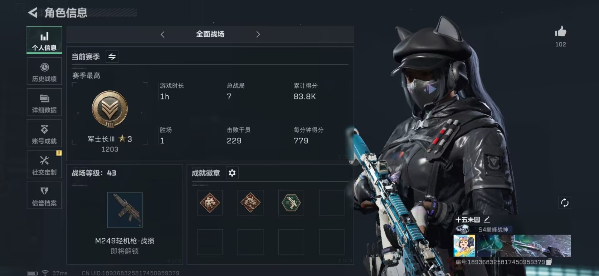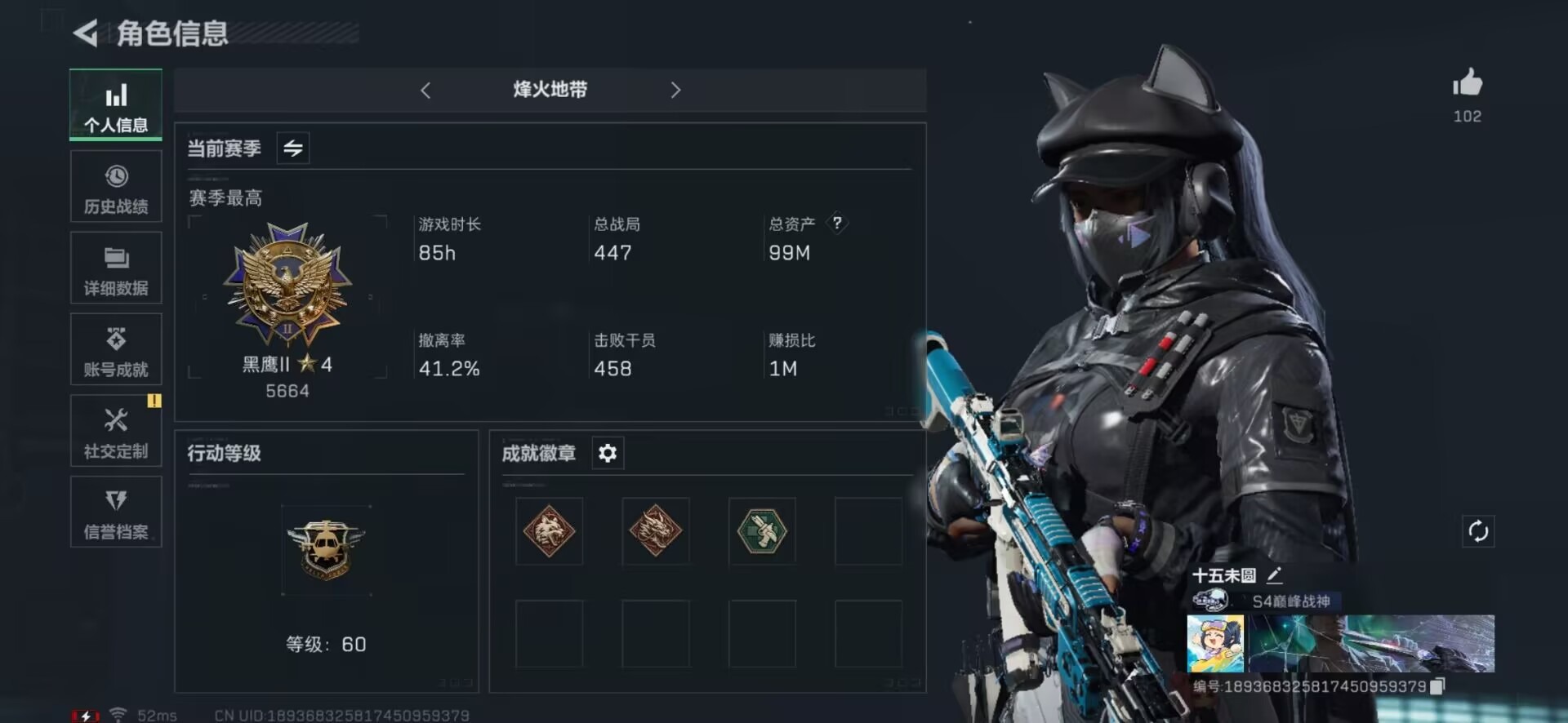 [11684415]总资产:99.5M 2干员外观 1近战传说 13传说枪械 哈夫币:681.212K 可二次 可修改实名 优质装备:近战-北极星,Vector冲锋枪-美杜莎 烽火地带段位:钻石 全面战场段位:无段位 传说武器皮肤:SR-25射手步枪-水墨云图,AS Val突击步枪-蛇年祥瑞,SMG45冲锋枪-骑士,复合弓-黑-天际线,K437突击步枪-北极星,QCQ171冲锋枪-北极星,725双管霰弹枪-送葬人-无题密令,CAR-15突击步枪-阿米娅,AK-12突击步枪-夜鹰,M4A1突击步枪-蚀金玫瑰,CAR-15突击步枪-黑鹰坠落 史诗武器皮肤:M1014霰弹枪-潜袭者,SR-3M紧凑突击步枪-英雄,SR-25射手步枪-战场英杰,PKM通用机枪-蝮蛇,AUG突击步枪-蝮蛇,M700狙击步枪-蝮蛇,G3战斗步枪-战场英杰,SG552突击步枪-尖端治疗,M1014霰弹枪-林中猎手,P90冲锋枪-暗影猎手,PKM通用机枪-守夜人,AS Val突击步枪-尖端治疗,M700狙击步枪-守夜人,Ash-12战斗步枪-守夜人,SR-25射手步枪-尖端治疗,MP5冲锋枪-深海恐惧,勇士冲锋枪-深海恐惧,SG552突击步枪-深海恐惧,AKM突击步枪-林中猎手,M16A4突击步枪-竞赛选手,M250通用机枪-囚徒,SV-98狙击步枪-林中猎手,PSG-1射手步枪-无垢,PKM通用机枪-荒野求生,QBZ95-1突击步枪-曙光,沙漠之鹰-曙光,Vector冲锋枪-阿萨拉文明,SVD狙击步枪-阿萨拉工艺,S12K霰弹枪-曙光,PKM通用机枪-英雄,M700狙击步枪-竞技风,QSZ92G-风林火山,93R-博士 干员外观:红狼-蚀金玫瑰,威龙-飞虎