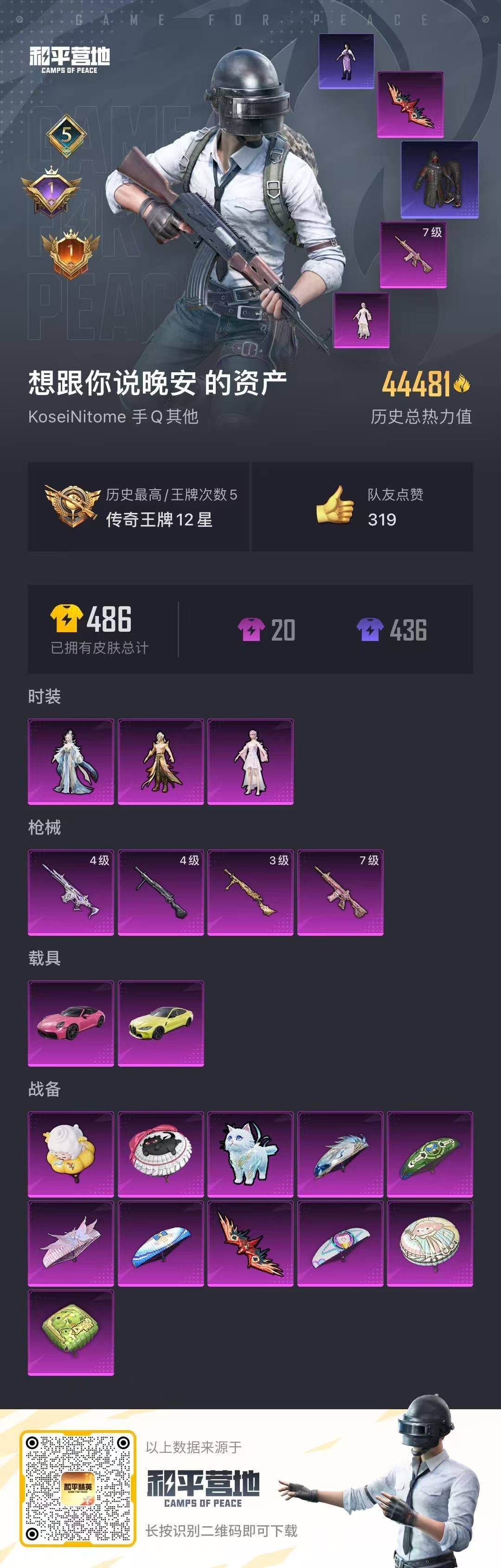 - [11689205]8特效枪 2载具 3印记 可二次 可修改实名 连体王者 优质装备:玛莎拉蒂Ghibli(蓝),玛莎拉蒂Ghibli(粉),AKM绿萝繁花,M416电玩时刻,GROZA-镜光银凌,SCAR-L金蛇镇世,MK14-盛世惊鸿,AUG-暖羊咩咩,MK14-甜梦熊击,Kar98K-巳巳如意 热门装扮:梦魇先生,东方飞龙 五级特效枪:五级GROZA-镜光银凌,五级MK14-甜梦熊击,五级AUG-暖羊咩咩,五级M416-电玩时刻,五级AKM-绿萝繁花 四级特效枪:四级Kar98K-巳巳如意 三级特效枪:三级SCAR-L金蛇镇世,三级MK14-盛世惊鸿 紫色装扮:日冕精灵,SS31特训套装,SS3特训,SS4特训,SS5特训,伏击者,冰川特警,决胜时刻,凛冬战士,北国孤狼,SS30特训套装,SS33特训套装,青涩时光,SS13特训,SS14特训,吉莉礼服,酒红色名流,酷萌兔限定,野性战魂,金鼠迎春,长空猛禽,雪山征服者,雪山精英,雷霆特警,霓虹街区,风暴特警,缤纷果语,蓝色运动,跃动心情,龙腾端午,骑行爱好者,黑色伏地魔,龙的传人,龟仙人,龙魂突击队,和平特警,沙漠兵团,圣诞大吉,坚韧舞者,夏日音浪,夜莺强袭者,怒火燎原,战地督导,攀登者,疯狂小兔子,神秘领域,甜蜜告白,空岛之星,竞技勇士朋克,红色运动,牛气冲天,灰色格斗者,灼焰舞者,热血青春,熔岩使者,牛气满满,猛禽,特战装甲,星途旅人,SS28特训,鱼渊荷华,燕燕于飞,巳巳如意,森林游猎者,竞技名士,怀庆长公主,果汁能量,惊鸿侠骨,SS25特训,锦衣飞扬,粉红小猪,焰鹰斗篷,幻羽潜行,SS27特训,萌趣绒叽,SS26特训,春光漫游,快闪甜心,智谋强哥,精神漫游,炽焰拳师,格斗专家,SS6特训,黑色刀锋,核芯基因,SS7特训,清香五月粽,拳皇97草薙京,黑夜传说,太极红客,玲珑飞花,SS8特训,星谷精灵,SS12特训,智慧之神,SS9特训,SS10特训,SS11特训,SS32特训服(SS32特训套装),恋语绒绒,忍者信条,街舞达人,WiFi精灵,冷血极客,丛林猎人,传奇侦探,特种空勤,银月精灵 优质战备:星途旅人降落伞,蜜语绒猫降落伞,盛世惊鸿降落伞,凤舞九天飞行器,临安公主降落伞,甜心宝贝降落伞,至尊龙雀降落伞,梦幻火箭降落伞