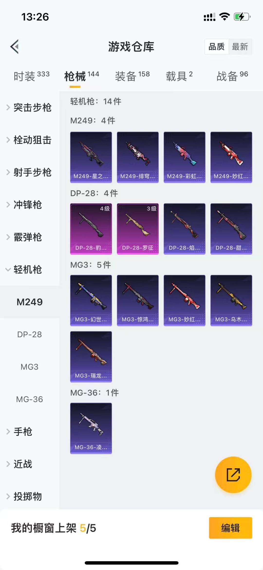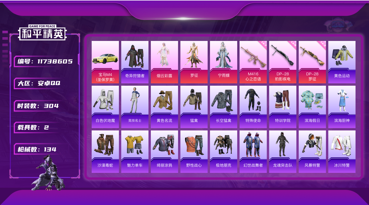 [11738605]3粉装 4特效枪 2载具 5印记 可二次 可修改实名 优质装备:宝马M4(圣保罗黄),M416心之恋语,奇异狩猎者,七级M416-心之恋语,宁雨蝶,罗征,DP-28-罗征 热门装扮:烟云彩露 稀有枪皮:DP-28-豹影疾电 四级特效枪:四级DP-28-豹影疾电 三级特效枪:三级DP-28-罗征 紫色装扮:田园牧歌,轻风白浪,SS22特训,SS23特训,幻彩翩翩,妙红点点,摩登艾咪,娇憨猪猪,萌趣咩咩,SS21特训,冰川特警,云朵鹅,雪绒豹,SS33特训套装,SS20特训,飞驰魅影,音速流光,SS19特训,甜心亚梦,虚音幻奏,瑞龙福将,团圆交子,SS17特训,焰山流火,异彩先驱,SS18特训,野性战心,长空猛禽,霓虹极客,风暴特警,虎虎生威吉莉,绛羽幽主,魅力单车,鹤鸣,黄色名流,黄色运动,龟仙人,冰河战士,龙魂突击队,蝶变,沙漠毒蛇,极地朋克,柠萌假日,深蓝色名流,滨海假日,夏日音浪,幻世战舞者,探宝勇士,滨海厨神,绮丽涂鸦,白色伏地魔,破蛋小黄鸡,福星高照,空岛之星,空投萌叽,牛气冲天,炫蓝之夏,猛禽,特殊使命,特训学院,米开朗基罗,SS28特训,玉兔迎春,林月如,竞技名士,情公主,惊鸿侠骨,SS24特训(SS24特训套装),SS25特训,元气发射,锦衣飞扬,焰鹰斗篷,幻羽潜行,SS27特训,蝶吟花词,SS26特训,精神漫游,绯格组合 优质战备:忍者神龟降落伞,江南烟雨降落伞,恐龙拽拽降落伞,喜羊羊与灰太狼降落伞,绯穹魔姬降落伞,灵猫魔法师飞行器,宁雨蝶降落伞,筑梦精灵降落伞,太空嘟嘟降落伞,未来歌姬降落伞,炎氏战神飞行翼