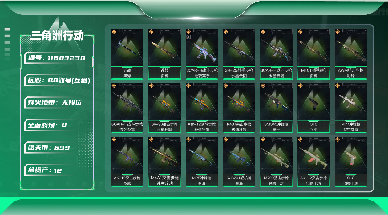 [11683230]总资产:12.5M 3干员外观 2近战传说 22传说枪械 哈夫币:699.803K 可二次 可修改实名 优质装备:近战-影锋,近战-黑海,SCAR-H战斗步枪-电玩高手 烽火地带段位:无段位 全面战场段位:无段位 传说武器皮肤:SR-25射手步枪-水墨云图,SCAR-H战斗步枪-水墨云图,M1014霰弹枪-影锋,AWM狙击步枪-影锋,SCAR-H战斗步枪-铁艺苍穹,SV-98狙击步枪-极速狂飙,Ash-12战斗步枪-极速狂飙,K437突击步枪-极速狂飙,SMG45冲锋枪-骑士,G18-飞虎,MP7冲锋枪-深空威胁,AK-12突击步枪-夜鹰,M4A1突击步枪-蚀金玫瑰,MP5冲锋枪-黑海,QJB201轻机枪-黑海,M700狙击步枪-创益工坊,AK-12突击步枪-创益工坊,G18-创益工坊,Vector冲锋枪-阿瑞斯之怒 史诗武器皮肤:SG552突击步枪-尖端治疗,M1014霰弹枪-林中猎手,AS Val突击步枪-尖端治疗,Ash-12战斗步枪-守夜人,SR-25射手步枪-尖端治疗,MP5冲锋枪-深海恐惧,SG552突击步枪-深海恐惧,M16A4突击步枪-竞赛选手,PTR-32突击步枪-英雄,M7战斗步枪-禁卫 干员外观:红狼-蚀金玫瑰,骇爪-水墨云图,威龙-飞虎