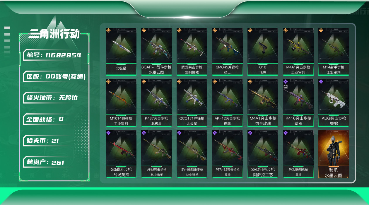 [11682854]总资产:261.9M 2干员外观 1近战传说 12传说枪械 哈夫币:21.009K 可二次 可修改实名 优质装备:近战-北极星 烽火地带段位:无段位 全面战场段位:无段位 传说武器皮肤:SCAR-H战斗步枪-水墨云图,腾龙突击步枪-黎明警戒,SMG45冲锋枪-骑士,G18-飞虎,M4A1突击步枪-工业审判,M14射手步枪-工业审判,M1014霰弹枪-工业审判,K437突击步枪-北极星,QCQ171冲锋枪-北极星,AK-12突击步枪-夜鹰,M4A1突击步枪-蚀金玫瑰 史诗武器皮肤:K416突击步枪-暗鸦,AUG突击步枪-蝮蛇,G3战斗步枪-战场英杰,AKM突击步枪-林中猎手,SV-98狙击步枪-林中猎手,PTR-32突击步枪-英雄,SVD狙击步枪-阿萨拉工艺,PKM通用机枪-英雄 干员外观:骇爪-水墨云图,威龙-飞虎