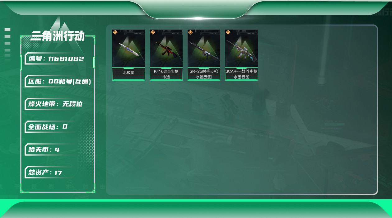 [11681082]总资产:17.2M 1近战传说 4传说枪械 哈夫币:4.103K 可二次 可修改实名 优质装备:近战-北极星,K416突击步枪-命运(典藏) 烽火地带段位:无段位 全面战场段位:无段位 传说武器皮肤:SR-25射手步枪-水墨云图,SCAR-H战斗步枪-水墨云图