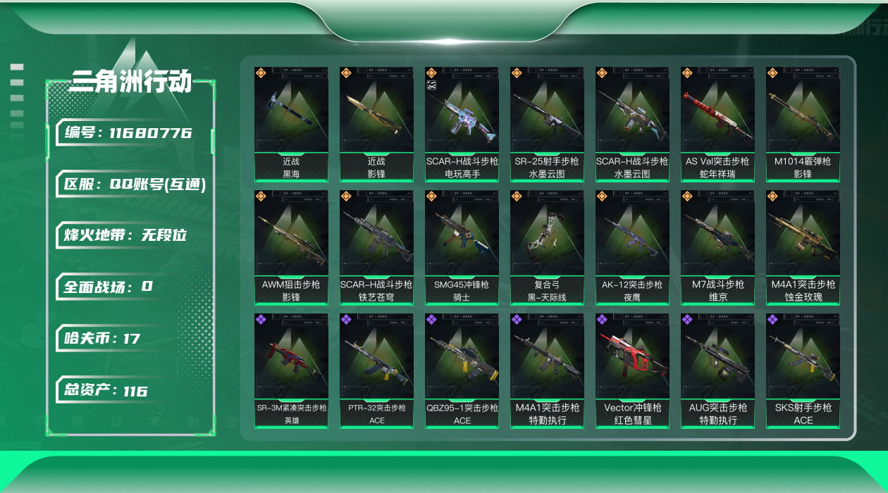 [11680776]总资产:116.1M 4干员外观 2近战传说 14传说枪械 哈夫币:17.811K 可二次 可修改实名 优质装备:近战-影锋,近战-黑海,SCAR-H战斗步枪-电玩高手 烽火地带段位:无段位 全面战场段位:无段位 传说武器皮肤:SR-25射手步枪-水墨云图,SCAR-H战斗步枪-水墨云图,AS Val突击步枪-蛇年祥瑞,M1014霰弹枪-影锋,AWM狙击步枪-影锋,SCAR-H战斗步枪-铁艺苍穹,SMG45冲锋枪-骑士,复合弓-黑-天际线,AK-12突击步枪-夜鹰,M7战斗步枪-维京,M4A1突击步枪-蚀金玫瑰 史诗武器皮肤:SR-3M紧凑突击步枪-英雄,PTR-32战斗步枪-ACE,QBZ95-1突击步枪-ACE,M4A1突击步枪-特勤执行,Vector冲锋枪-红色彗星,AUG突击步枪-特勤执行,SKS射手步枪-ACE,PKM通用机枪-蝮蛇,AUG突击步枪-蝮蛇,M700狙击步枪-蝮蛇,G3战斗步枪-战场英杰,SG552突击步枪-尖端治疗,M1014霰弹枪-林中猎手,PKM通用机枪-守夜人,AS Val突击步枪-尖端治疗,M700狙击步枪-守夜人,Ash-12战斗步枪-守夜人,SR-25射手步枪-尖端治疗,MP5冲锋枪-深海恐惧,勇士冲锋枪-深海恐惧,SG552突击步枪-深海恐惧,AKM突击步枪-林中猎手,SV-98狙击步枪-林中猎手,QBZ95-1突击步枪-曙光,UZI冲锋枪-危险实验,M249轻机枪-维京,SCAR-H战斗步枪-危险实验,沙漠之鹰-曙光,Vector冲锋枪-阿萨拉文明,SVD狙击步枪-阿萨拉工艺,S12K霰弹枪-曙光,AS Val突击步枪-刀锋,PKM通用机枪-英雄,PKM通用机枪-魔药,M700狙击步枪-竞技风,QSZ92G-风林火山,93R-博士,AUG突击步枪-战术迷彩 干员外观:红狼-蚀金玫瑰,威龙-壮志凌云,骇爪-水墨云图,威龙-飞虎