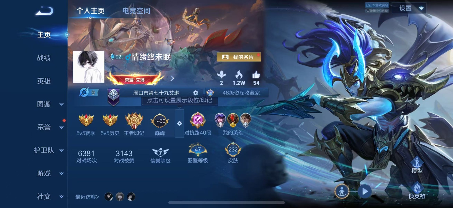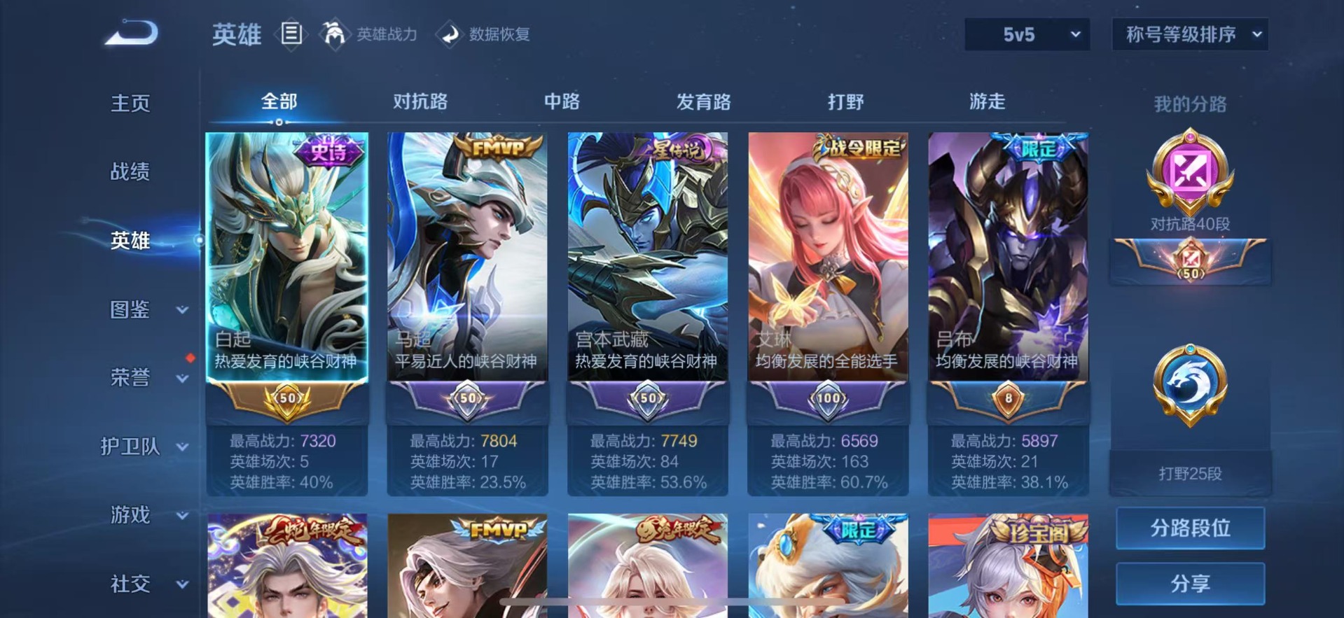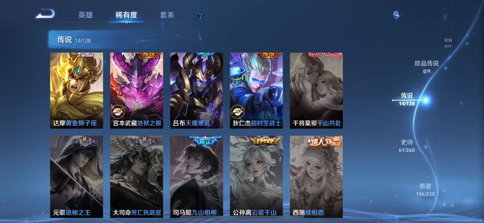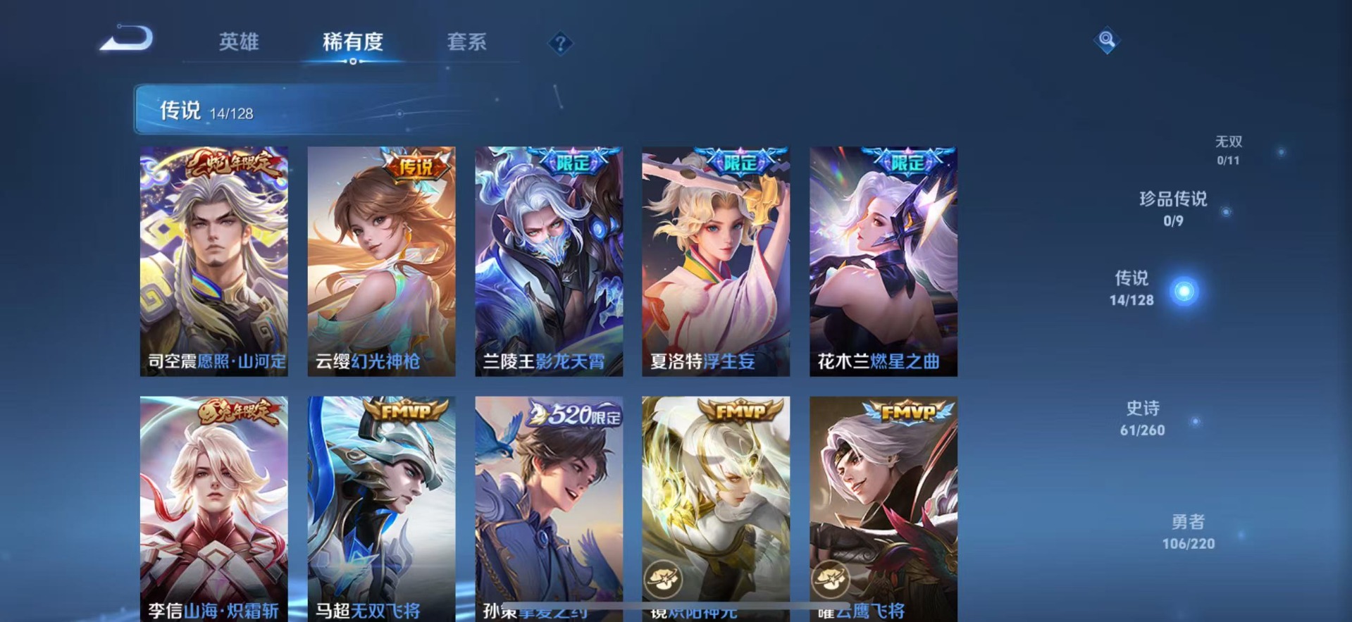 - [36997]英雄数: 86 皮肤数: 2 勇者皮肤数: 46 史诗皮肤数: 10 传说皮肤数: 1 稀有英雄: 艾琳,娜可露露,不知火舞,桑启,戈娅 当前段位: 星耀 限定皮肤: 高山流水,五谷丰年 内测皮肤: 女武神 史诗皮肤: 逐浪之夏,水果甜心,乘风破浪,水晶猎龙者 赛季/战令皮肤: 朔风刀,混沌棋,疑决卦,醍醐杖,原初探秘者,万华元夜,演武夺筹,驱傩正仪,千军破阵,星际陆战队(达摩),金庭之子,大漠名商,云中旅人,海盐诗旅 实名: 有人脸修改机会/实名是本人 普通皮肤: 五福同心,龙腾万里,归虚梦演(鲁班大师),归虚梦演(曜),掌控之力,守护之力,化身博士,缤纷绘卷,黄金武士,天使之翼,红桃皇后,星际陆战队(程咬金),阴阳师,汉昭烈帝,兔女郎,死亡骑士,救世之瞳,白色死神,野性能量,冰雪圆舞曲,露花倒影,花见巫女,未来旅行,龙域领主,蔷薇王座,万圣前夜,异域舞娘,潮流仙人,东海龙王,战争女神,精灵王,加勒比小姐,死神来了,赤焰之缨,启蛰,棒球奇才,海之征途,精准探案法,花间舞,绝影神枪,阿摩司公爵,特种部队,隐刃,木偶奇遇记,海军大将,一千零一夜,英喵野望,前尘,碧珀绯影