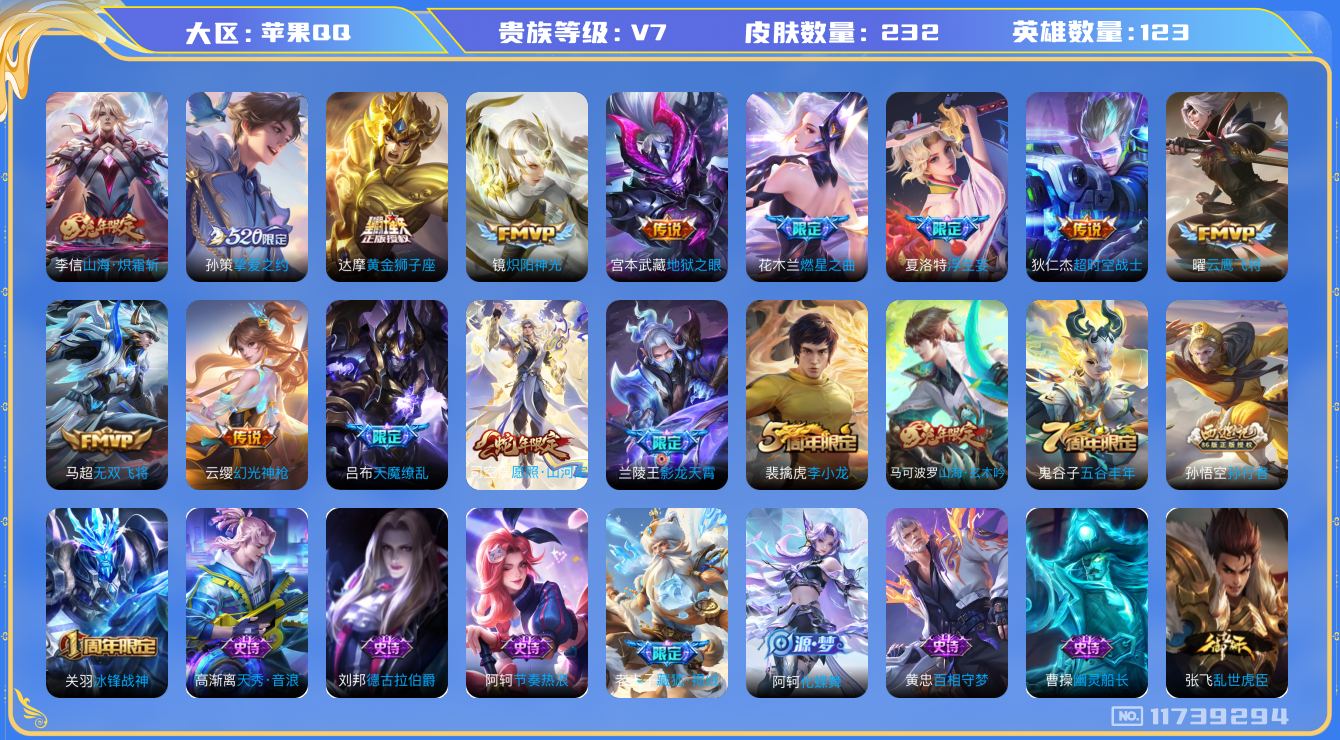 [11739294]V7 14传说 123英雄 232皮肤 可修改实名 优质装备:黄金狮子座,云鹰飞将(小将军),炽阳神光,地狱之眼,超时空战士-狄仁杰,挚爱之约,无双飞将,山海·炽霜斩(李信年限),燃星之曲,浮生妄,涂山容容 传说皮:幻光神枪 珍宝阁皮:妄想食味 限定皮:愿照·山河定(司空震年限),影龙天霄,五谷丰年,冰锋战神,李小龙,孙行者,天魔缭乱,山海·玄木吟(马可年限) 史诗皮:鸭鸭历险记-刘禅,苍鳞隐世,器灵·浮梦炉,化蝶舞,灵蛊蚀心,龙之律动,藏狐·褐绒,茶境仙,琥珀纪元伽罗,蔬乡物语(鲁班七号),百相守梦-黄忠,织梦人,紫霞仙子,苍穹之光,千年之狐,江河有灵,真我赫兹(镜),蒙恬荣光圣徽,无限星赏官,青蛇,偶像歌手,电玩·爆裂旋风,末日机甲-吕布,猫狗日记-孙策,乱世虎臣,节奏热浪,修罗,摇滚巨星,水果甜心,星夜王子,德古拉伯爵,幽灵船长,鬼剑武藏,舞动绿茵,逐浪之夏,水晶猎龙者,金属风暴,原初追逐者,圣诞狂欢,圣诞恋歌,鹰眼统帅,魅力维加斯,黎明之约,天秀·音浪,无心,未来纪元-赵云