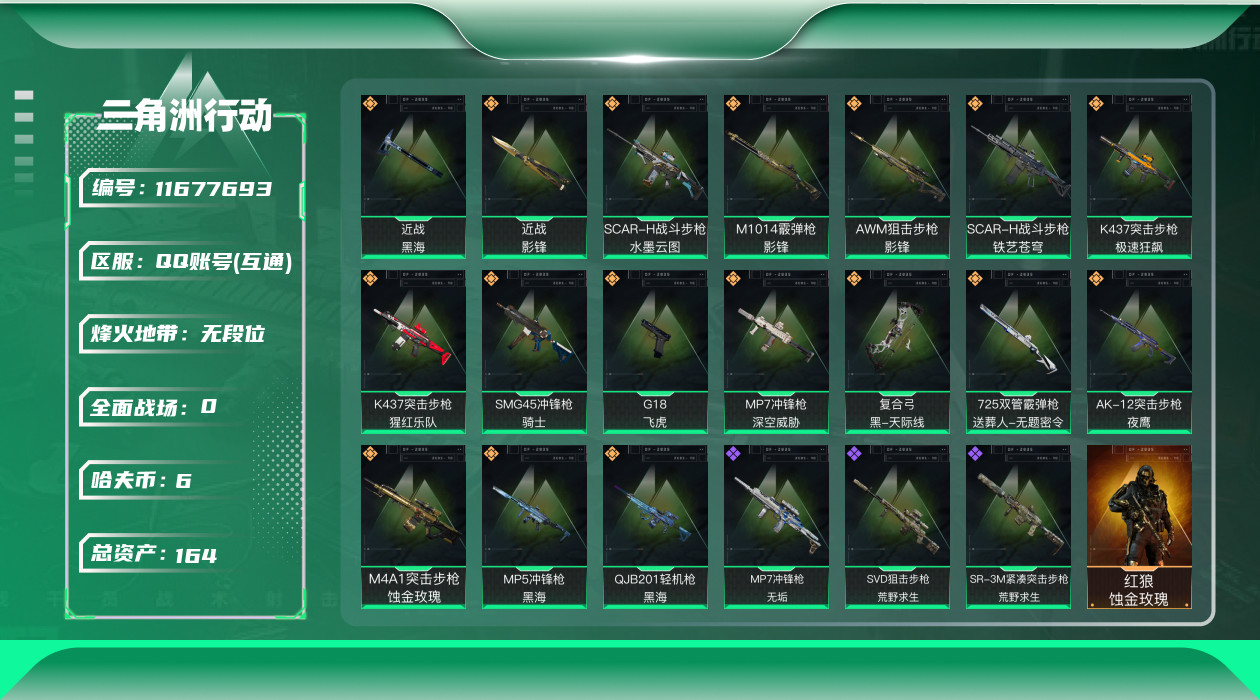 [11677693]总资产:164.3M 3干员外观 2近战传说 17传说枪械 哈夫币:6.097K 可二次 可修改实名 优质装备:近战-影锋,近战-黑海 烽火地带段位:无段位 全面战场段位:无段位 传说武器皮肤:SCAR-H战斗步枪-水墨云图,M1014霰弹枪-影锋,AWM狙击步枪-影锋,SCAR-H战斗步枪-铁艺苍穹,K437突击步枪-极速狂飙,K437突击步枪-猩红乐队,SMG45冲锋枪-骑士,G18-飞虎,MP7冲锋枪-深空威胁,复合弓-黑-天际线,725双管霰弹枪-送葬人-无题密令,AK-12突击步枪-夜鹰,M4A1突击步枪-蚀金玫瑰,MP5冲锋枪-黑海,QJB201轻机枪-黑海 史诗武器皮肤:MP7冲锋枪-无垢,SVD狙击步枪-荒野求生,SR-3M紧凑突击步枪-荒野求生 干员外观:红狼-蚀金玫瑰,骇爪-水墨云图,威龙-飞虎