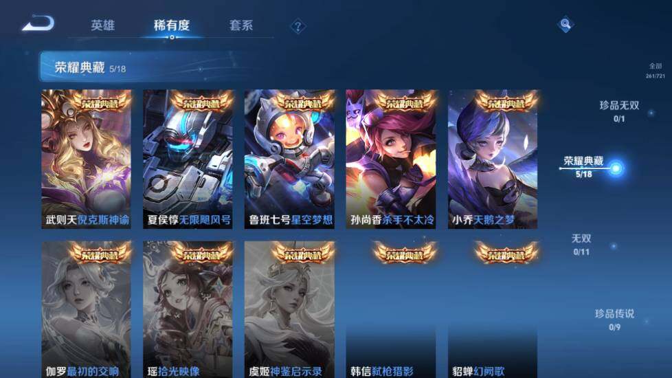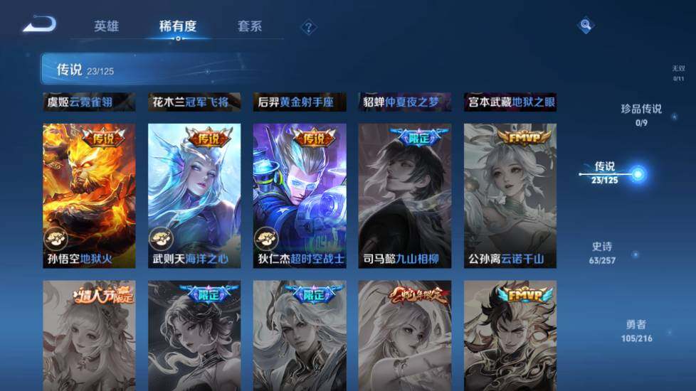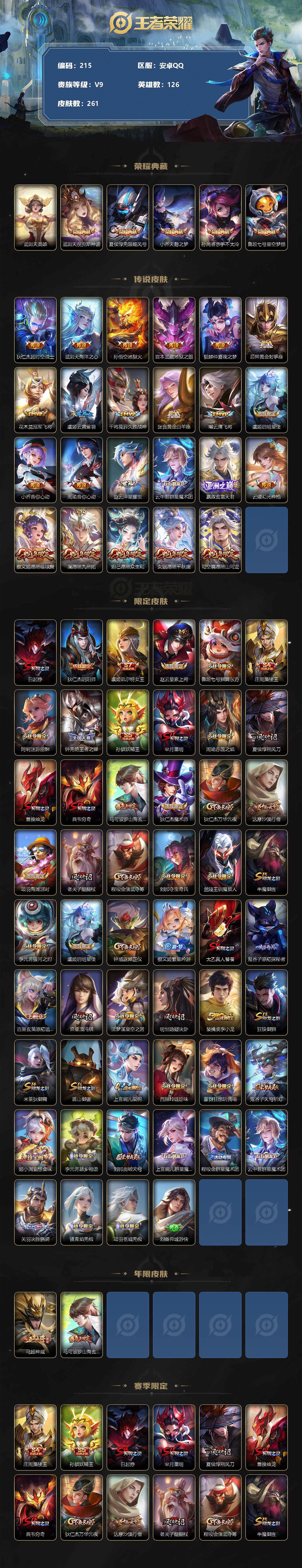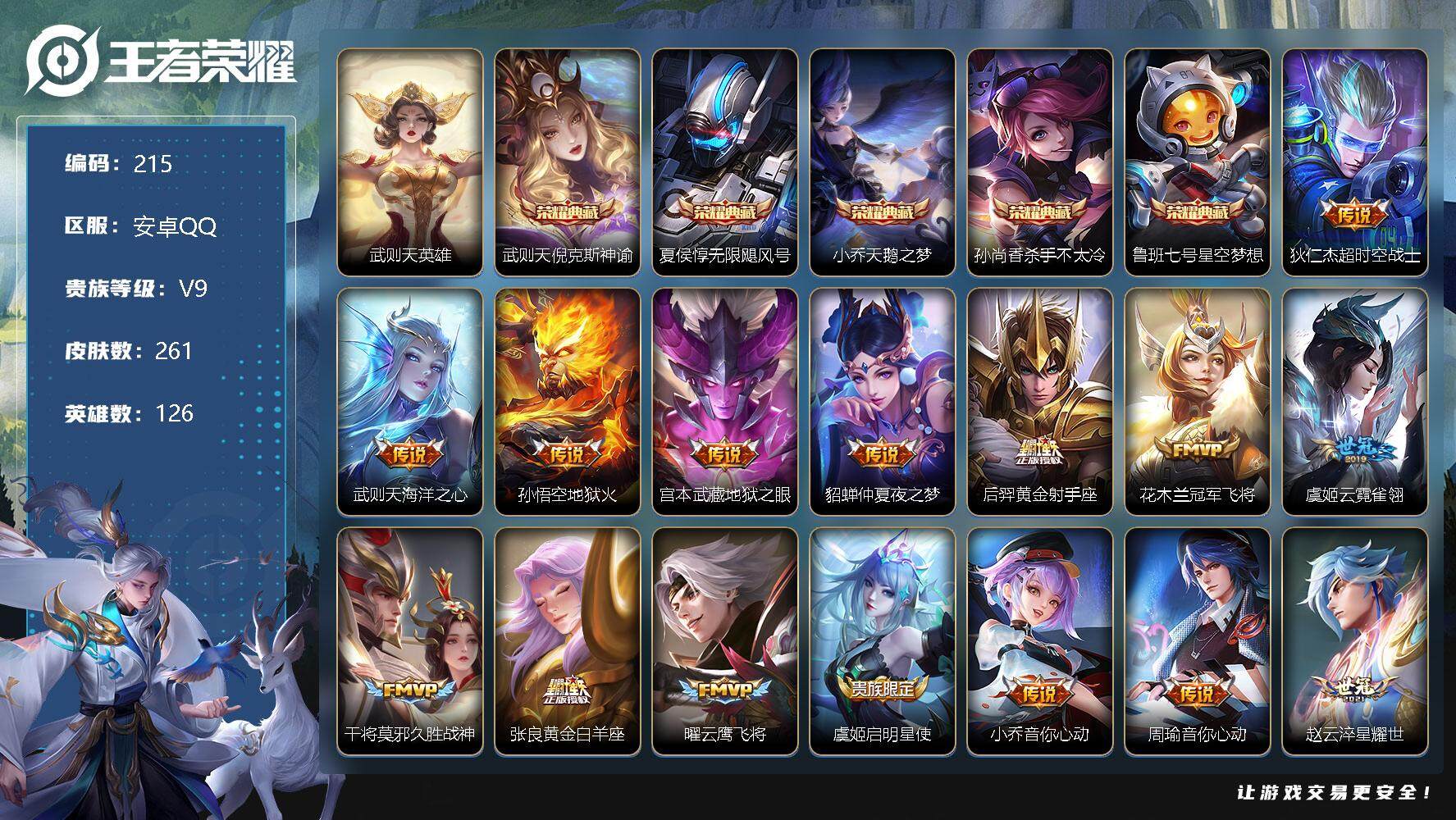 [11739408]【商品标题】:安卓Q-V9-至尊星耀I段位-126英雄-261皮肤-5典藏-0珍品无双-0无双-0珍品传说-23传说-62史诗