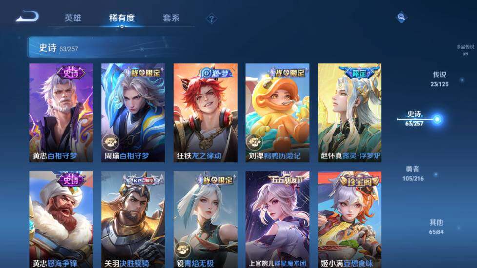 【赛季限定】:庄周蜃楼王,孙膑妖精王,白起狰,芈月重明,夏侯惇朔风刀,曹操烛龙,典韦穷奇,狄仁杰万华元夜,达摩沙漠行僧,老夫子醍醐杖,程咬金演武夺筹,牛魔御旌,虞姬凯尔特女王,钟馗驱傩正仪,太乙真人饕餮,鬼谷子原初探秘者,百里玄策原初追逐者,弈星混沌棋,明世隐疑决卦,狂铁御狮,米莱狄御霄,盾山御銮,鬼谷子天穹祈灯,刘邦剑破天穹