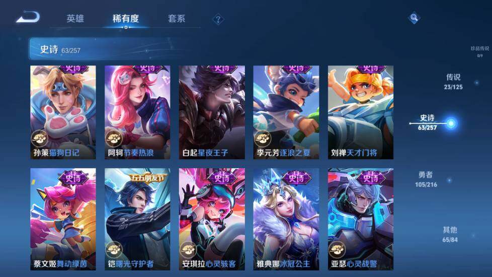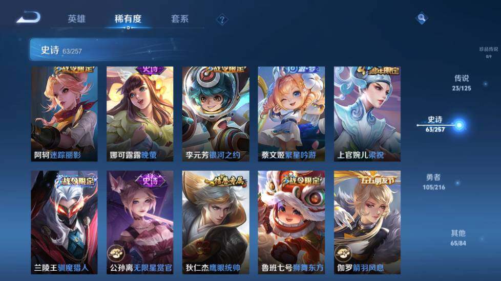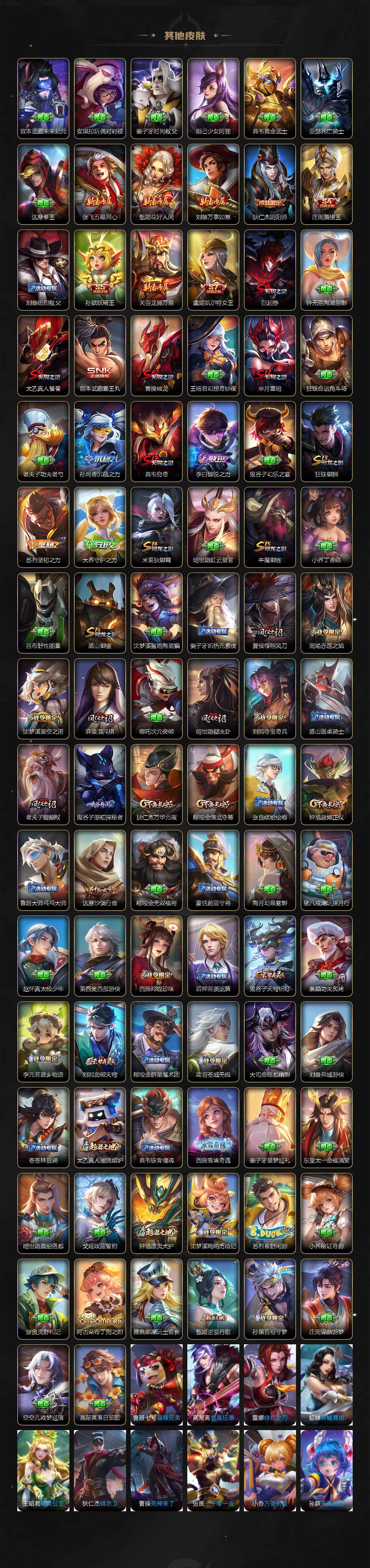 瑶遇见神鹿,娜可露露晚萤,伽罗箭羽风息,李元芳逐浪之夏,公孙离无限星赏官,孙策猫狗日记,阿轲节奏热浪,露娜紫霞仙子,诸葛亮黄金分割率,王昭君偶像歌手,韩信白龙吟,雅典娜冰冠公主,吕布末日机甲,鲁班七号电玩小子,橘右京修罗,墨子龙骑士,刘禅绅士熊喵,刘禅天才门将,白起星夜王子,安琪拉心灵骇客,刘邦德古拉伯爵,兰陵王暗隐猎兽者,曹操幽灵船长,宫本武藏鬼剑武藏,亚瑟心灵战警,蔡文姬舞动绿茵,西施诗语江南,铠曙光守护者,百里玄策原初追逐者,吕布圣诞狂欢,貂蝉圣诞恋歌,嬴政暗夜贵公子,李白千年之狐,夏洛特永昼,艾琳奇遇舞章,上官婉儿群星魔术团,关羽决胜骁骑,赵怀真器灵·浮梦炉