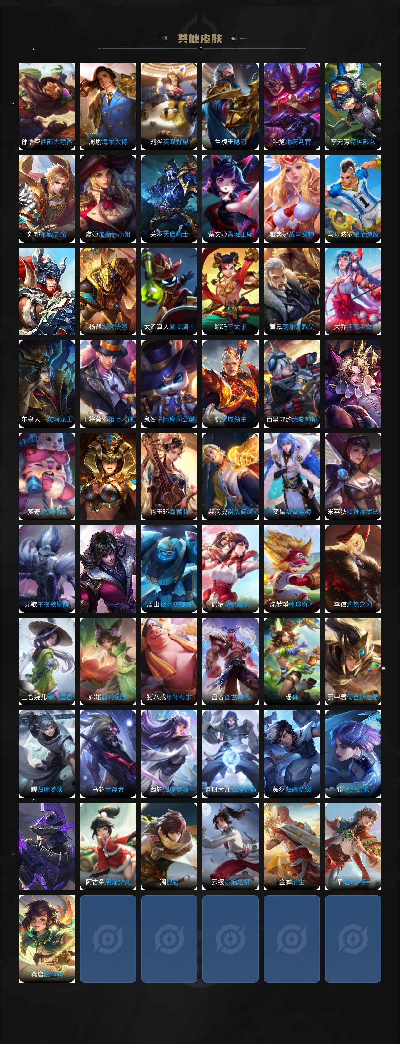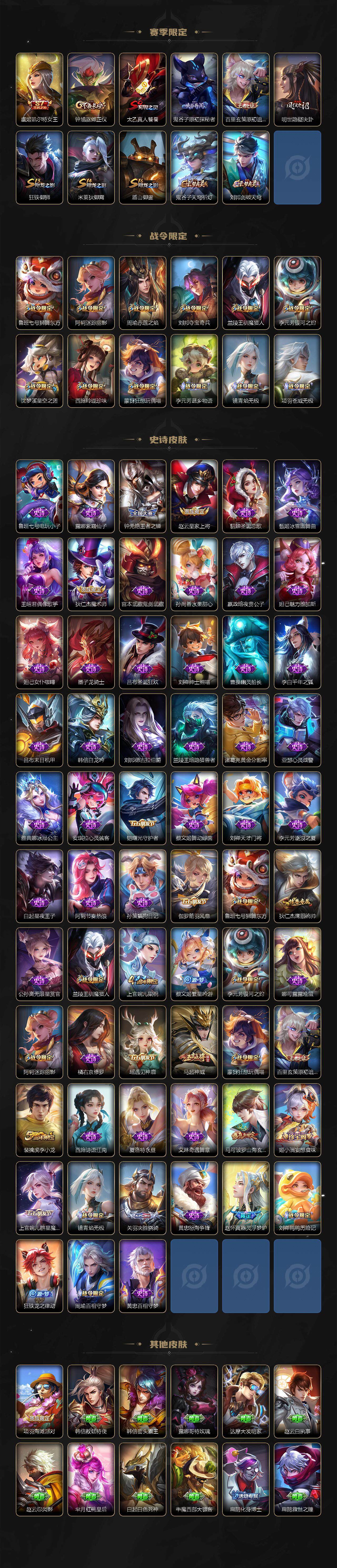 【限定皮肤】:白起狰,狄仁杰阴阳师,虞姬凯尔特女王,赵云皇家上将,鲁班七号狮舞东方,庄周蜃楼王,阿轲迷踪丽影,钟无艳王者之锤,孙膑妖精王,芈月重明,周瑜赤莲之焰,夏侯惇朔风刀,曹操烛龙,典韦穷奇,马可波罗山海玄木吟,狄仁杰魔术师,狄仁杰万华元夜,达摩沙漠行僧,项羽海滩派对,老夫子醍醐杖,程咬金演武夺筹,刘邦夺宝奇兵,兰陵王驯魔猎人,牛魔御旌,李元芳银河之约,虞姬启明星使,钟馗驱傩正仪,蔡文姬繁星吟游,太乙真人饕餮,鬼谷子原初探秘者,百里玄策原初追逐者,弈星混沌棋,沈梦溪星空之诺,明世隐疑决卦,裴擒虎李小龙,狂铁御狮,米莱狄御霄,盾山御銮,上官婉儿梁祝,西施玲珑珍味,蒙犽狂想玩偶喵,鬼谷子天穹祈灯,姬小满妄想食味,李元芳蔬乡物语,刘邦剑破天穹,上官婉儿群星魔术团,程咬金群星魔术团,云中君群星魔术团,关羽决胜骁骑,镜青焰无极,项羽苍威无极,刘备异域游侠
