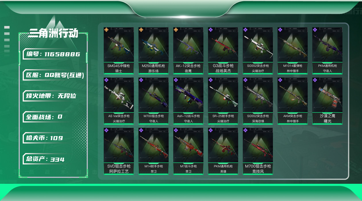 [11658886]总资产:334.2M 3传说枪械 哈夫币:109K 可二次 可修改实名 烽火地带段位:无段位 全面战场段位:无段位 传说武器皮肤:SMG45冲锋枪-骑士,M250通用机枪-游乐场,AK-12突击步枪-夜鹰 史诗武器皮肤:G3战斗步枪-战场英杰,SG552突击步枪-尖端治疗,M1014霰弹枪-林中猎手,PKM通用机枪-守夜人,AS Val突击步枪-尖端治疗,M700狙击步枪-守夜人,Ash-12战斗步枪-守夜人,SR-25射手步枪-尖端治疗,SG552突击步枪-深海恐惧,AKM突击步枪-林中猎手,沙漠之鹰-曙光,SVD狙击步枪-阿萨拉工艺,M14射手步枪-禁卫,M7战斗步枪-禁卫,PKM通用机枪-英雄,M700狙击步枪-竞技风