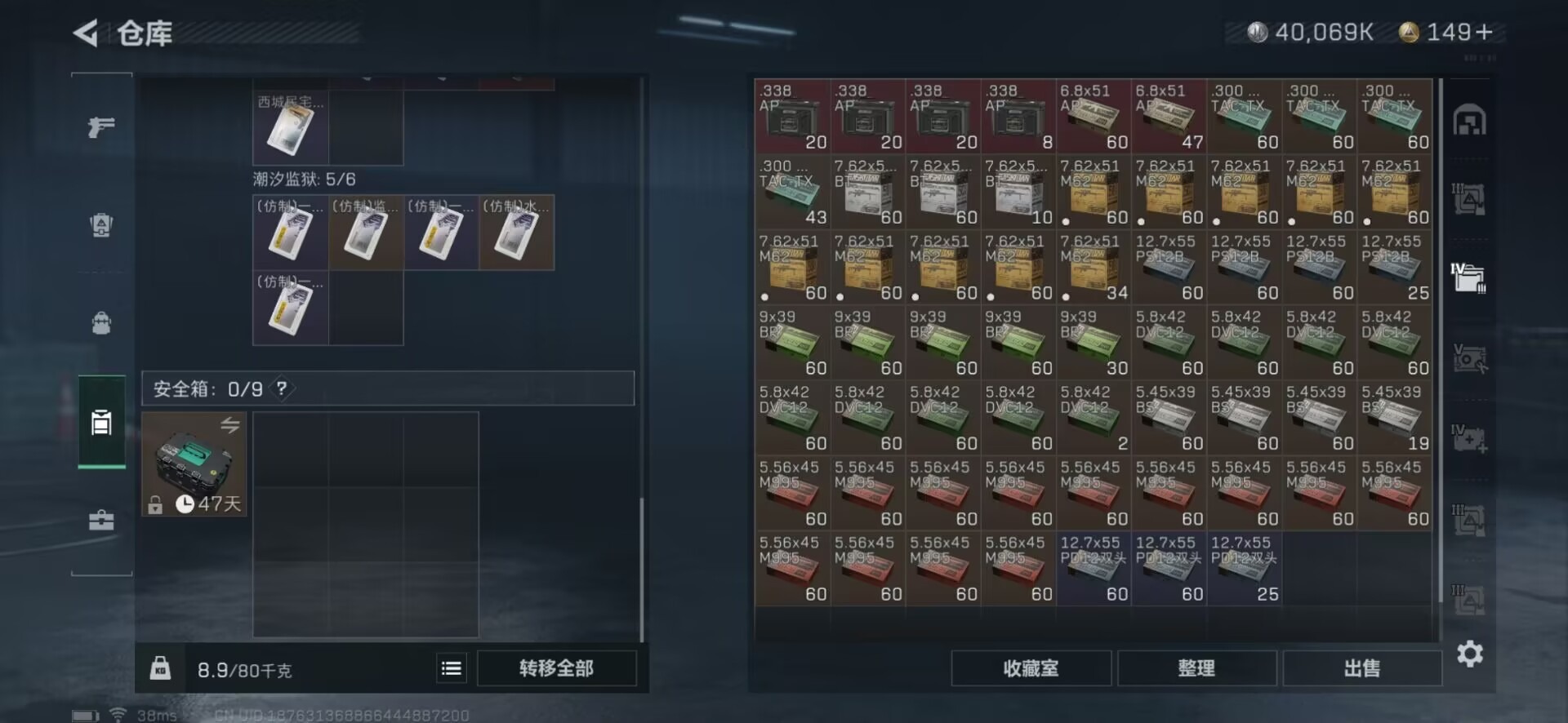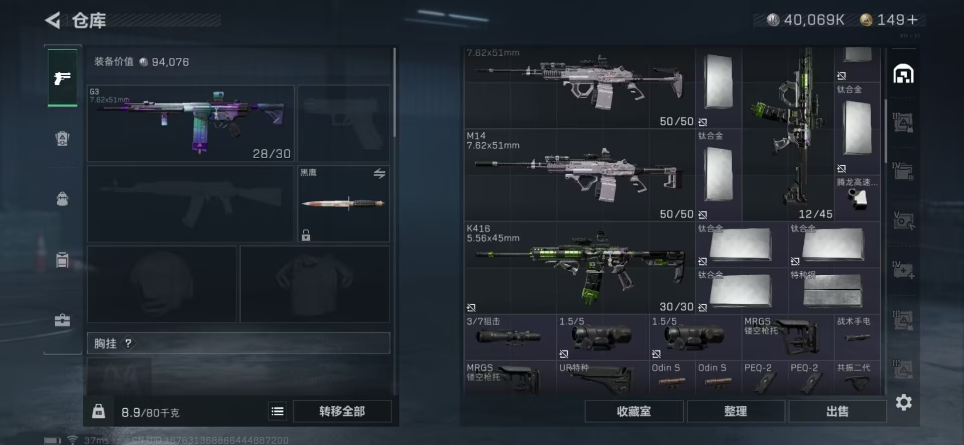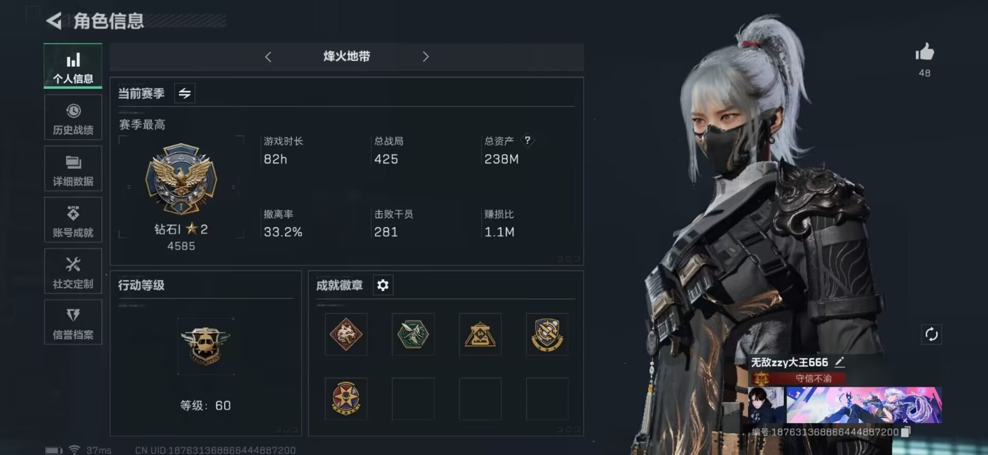 - [11518229]总资产:103.3 2干员外观 1近战传说 12传说枪械 高级安全箱(9.17到期) 可二次 可修改实名 烽火地带段位:钻石 全面战场段位:尉官 哈夫币:7.615 传说武器皮肤:近战-北极星,SCAR-H战斗步枪-电玩高手,SCAR-H战斗步枪-水墨云图,SR-25射手步枪-水墨云图,SCAR-H战斗步枪-铁艺苍穹,AK-12突击步枪-夜鹰,复合弓-黑-天际线,725双管霰弹枪-送葬人-无题密令,QCQ171冲锋枪-北极星,K437突击步枪-北极星,M4A1突击步枪-蚀金玫瑰,CAR-15突击步枪-黑鹰坠落 史诗武器皮肤:QBZ95-1突击步枪-ACE,AUG突击步枪-特勤执行,Vector冲锋枪-红色彗星,PTR-32战斗步枪-ACE,SKS射手步枪-ACE,AUG突击步枪-蝮蛇,M700狙击步枪-蝮蛇,G3战斗步枪-战场英杰,SR-25射手步枪-尖端治疗,AS Val突击步枪-尖端治疗,M700狙击步枪-守夜人,SG552突击步枪-尖端治疗,Ash-12战斗步枪-守夜人,MP5冲锋枪-深海恐惧,SR-3M紧凑突击步枪-荒野求生,勇士冲锋枪-深海恐惧,AKM突击步枪-林中猎手,SVD狙击步枪-暗夜猎手,M16A4突击步枪-竞赛选手,PKM通用机枪-守夜人,SVD狙击步枪-荒野求生,SV-98狙击步枪-林中猎手,M250通用机枪-囚徒,腾龙突击步枪-无垢,MP7冲锋枪-无垢,Vector冲锋枪-阿萨拉文明,SCAR-H战斗步枪-趣味贴纸,M700狙击步枪-竞技风,QSZ92G-风林火山 干员外观:红狼-蚀金玫瑰,骇爪-水墨云图