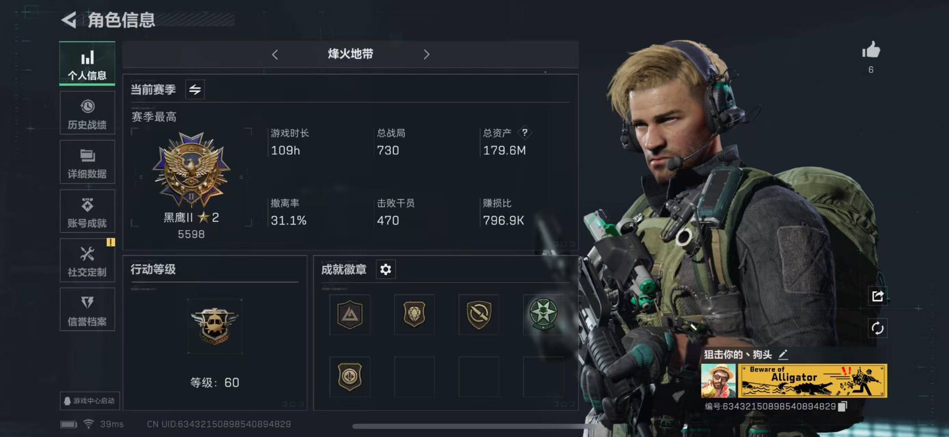 [11632684]总资产:179.6M 3传说枪械 哈夫币:31.025K 可二次 可修改实名 烽火地带段位:黑鹰 全面战场段位:无段位 传说武器皮肤:复合弓-黑-天际线,725双管霰弹枪-送葬人-无题密令,CAR-15突击步枪-阿米娅 史诗武器皮肤:M700狙击步枪-蝮蛇,SG552突击步枪-尖端治疗,M1014霰弹枪-林中猎手,PKM通用机枪-守夜人,AS Val突击步枪-尖端治疗,M700狙击步枪-守夜人,SR-25射手步枪-尖端治疗,SG552突击步枪-深海恐惧,AKM突击步枪-林中猎手,M16A4突击步枪-竞赛选手,SV-98狙击步枪-林中猎手,PTR-32突击步枪-英雄,SVD狙击步枪-暗夜猎手,MP7冲锋枪-无垢,PSG-1射手步枪-无垢,SVD狙击步枪-荒野求生,SR-3M紧凑突击步枪-荒野求生,QBZ95-1突击步枪-曙光