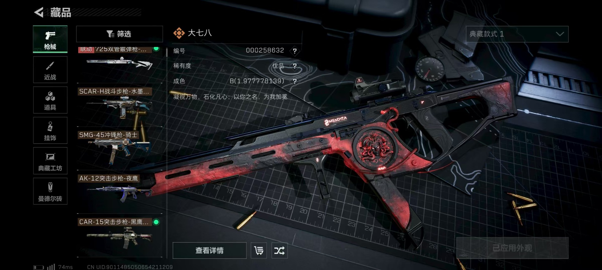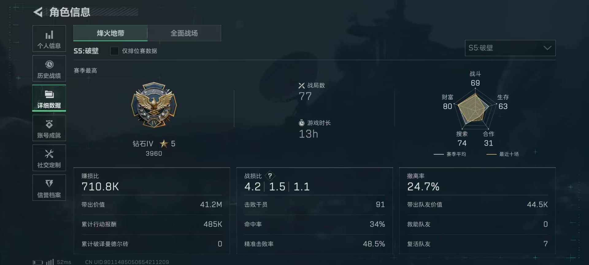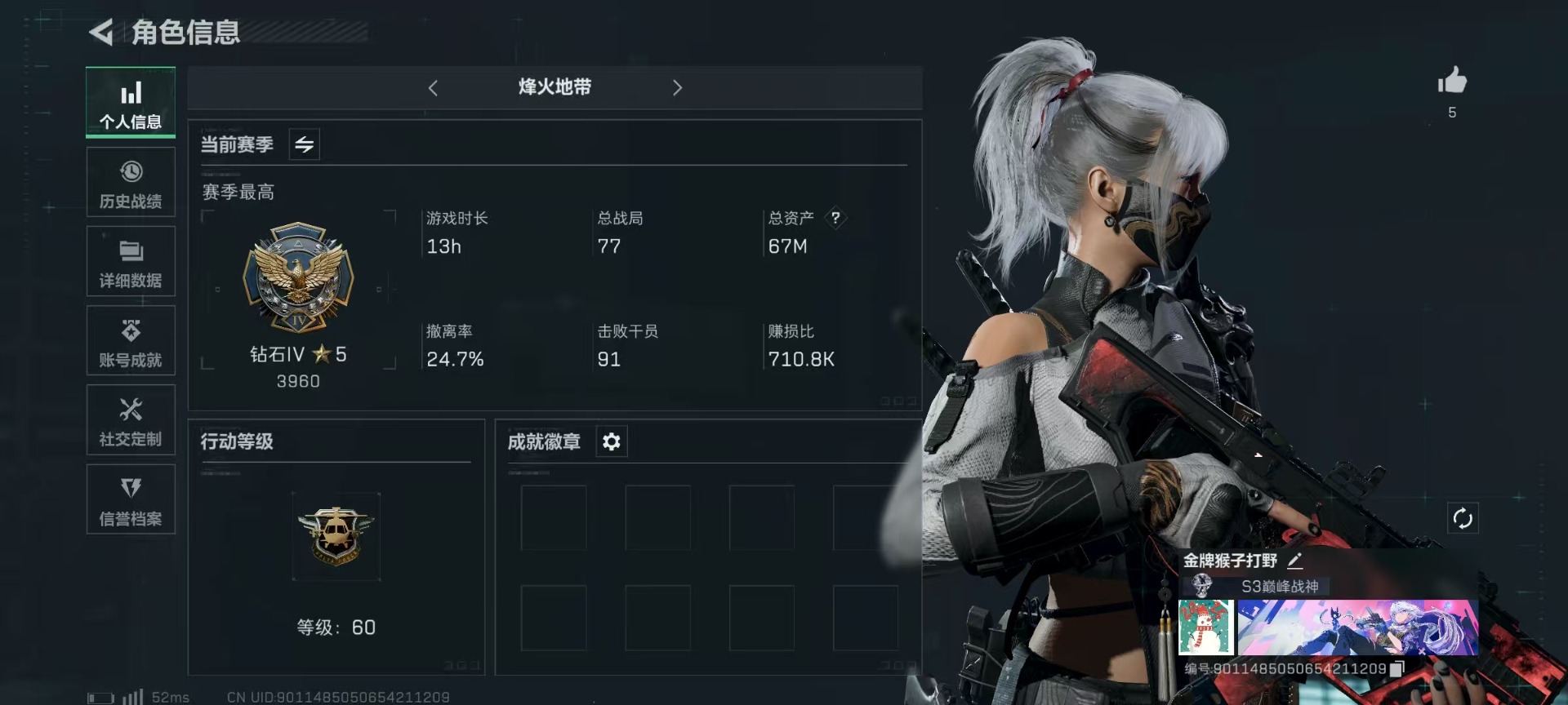 [11680068]总资产:67M 3干员外观 1近战传说 14传说枪械 哈夫币:103.618K 高级安全箱(2×3)9.15号到期 可二次 可修改实名 优质装备:近战-北极星,Vector冲锋枪-美杜莎 烽火地带段位:钻石 全面战场段位:无段位 传说武器皮肤:SR-25射手步枪-水墨云图,SCAR-H战斗步枪-水墨云图,AS Val突击步枪-蛇年祥瑞,SCAR-H战斗步枪-铁艺苍穹,SMG45冲锋枪-骑士,复合弓-黑-天际线,K437突击步枪-北极星,QCQ171冲锋枪-北极星,725双管霰弹枪-送葬人-无题密令,AK-12突击步枪-夜鹰,M7战斗步枪-维京,CAR-15突击步枪-黑鹰坠落 史诗武器皮肤:P90冲锋枪-暗鸦,M1014霰弹枪-暗鸦,M700狙击步枪-蝮蛇,SG552突击步枪-尖端治疗,M1014霰弹枪-林中猎手,PKM通用机枪-守夜人,AS Val突击步枪-尖端治疗,M700狙击步枪-守夜人,Ash-12战斗步枪-守夜人,SR-25射手步枪-尖端治疗,MP5冲锋枪-深海恐惧,勇士冲锋枪-深海恐惧,SG552突击步枪-深海恐惧,AKM突击步枪-林中猎手,M16A4突击步枪-竞赛选手,SV-98狙击步枪-林中猎手,PSG-1射手步枪-无垢,PKM通用机枪-英雄 干员外观:威龙-壮志凌云,骇爪-水墨云图,无名-夜鹰