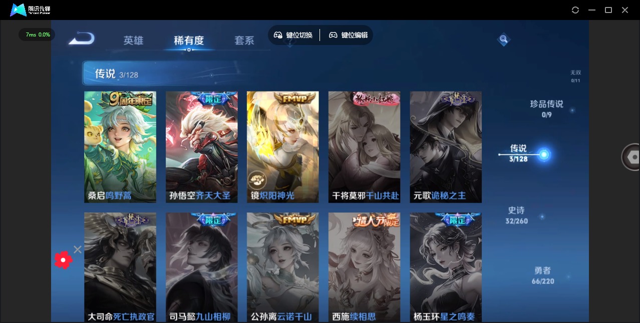 - PX_2089800-13 安卓QQ/至尊星耀/393皮肤/125英雄/4典藏/0珍品无双/0无双/0珍品传说/46传说/120史诗/9稀有英雄 【4 典藏皮肤】鸣剑·曳影 李白,全息碎影 孙悟空,银白咏叹调 铠,弑枪猎影 韩信, 【46 传说皮肤】枫霜尽 橘右京,武圣 关羽,启明星使 虞姬,云霓雀翎 虞姬,前尘镜 娜可露露,逐花归海 澜,李逍遥 曜,地狱火 孙悟空,云鹰飞将 曜,齐天大圣 孙悟