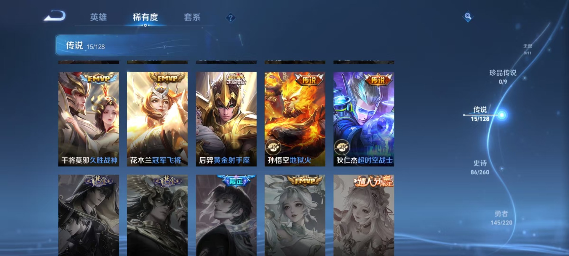 老夫子醍醐杖,沈梦溪大漠名商,苏烈千军破阵,达摩沙漠行僧,项羽苍威无极,镜青焰无极,元歌云间偶戏,兰陵王金庭之子,裴擒虎擒涛扼浪,鲁班大师探海日志,明世隐疑决卦,蒙犽狂想玩偶喵,马可波罗暗影游猎,鬼谷子原初探秘者,张良古海寻踪,桑启海盐诗旅,狄仁杰万华元夜,程咬金演武夺筹,李元芳银河之约,李元芳云中旅人,钟馗驱傩正仪