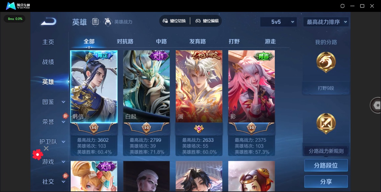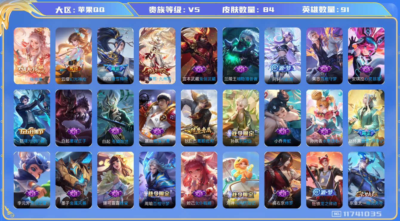 [11741035]V5 3传说 91英雄 84皮肤 可修改实名 传说皮:续相思,幻光神枪 限定皮:愿照·九州拓(澜年限),傲雪梅枪 史诗皮:鸭鸭历险记-刘禅,苍鳞隐世,器灵·浮梦炉,化蝶舞,龙之律动,百相守梦-周瑜,茶境仙,百相守梦-黄忠,青蛇,晚萤,修罗,女仆咖啡,摇滚巨星,水果甜心,星夜王子,心灵骇客,暗隐猎兽者,鬼剑武藏,逐浪之夏,曙光守护者,金属风暴,鹰眼统帅