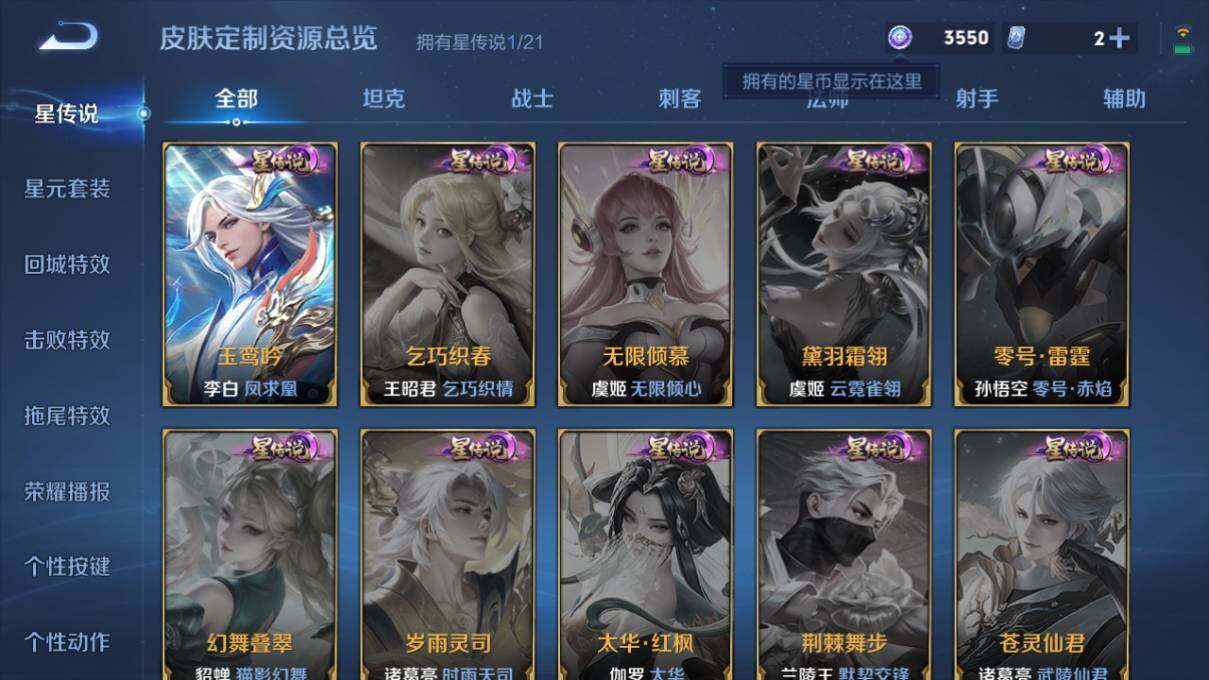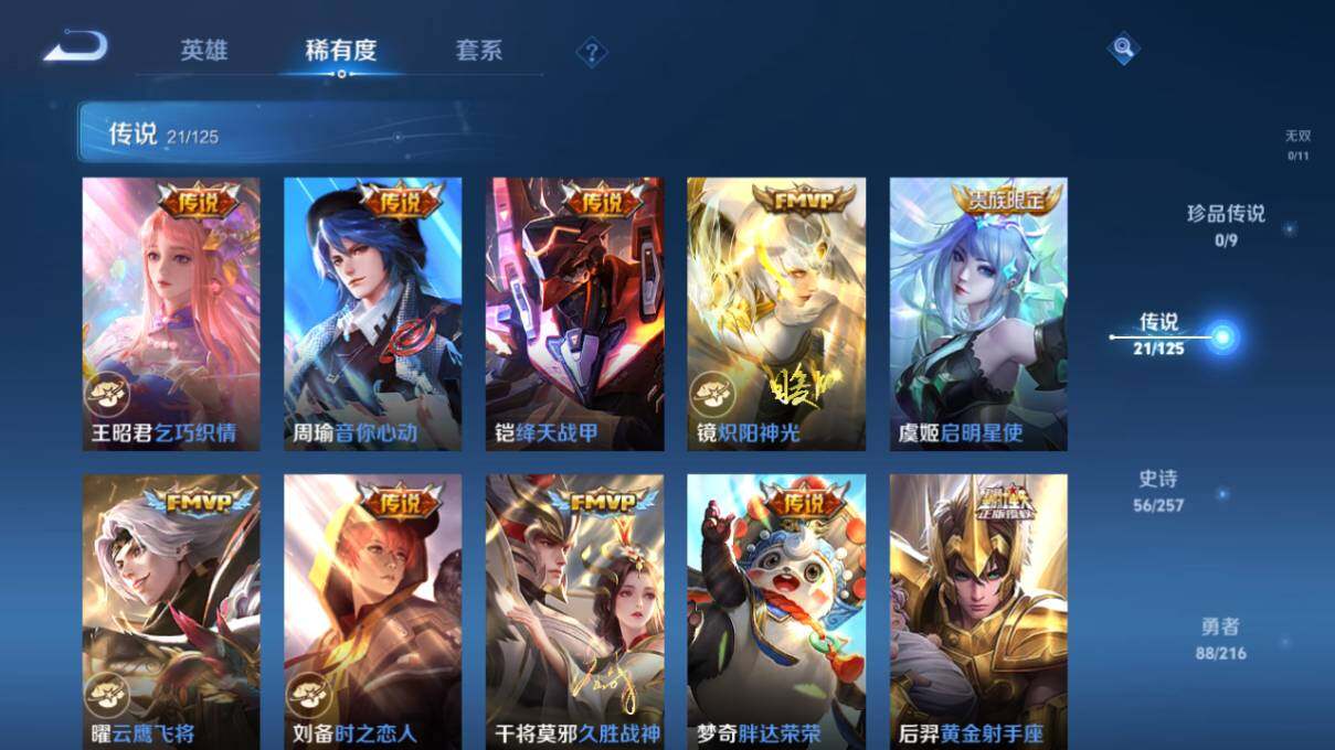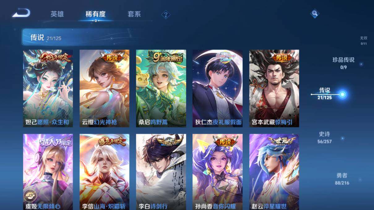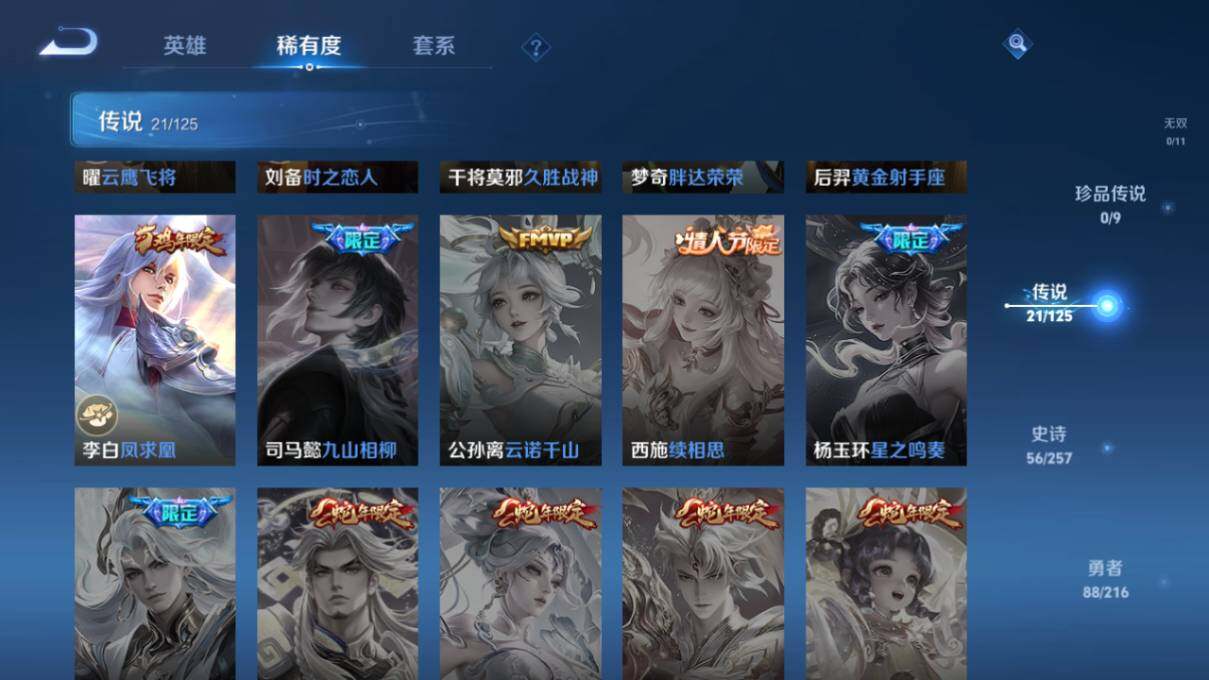 【传说皮肤】:李白凤求凰,后羿黄金射手座,梦奇胖达荣荣,干将莫邪久胜战神,刘备时之恋人,曜云鹰飞将,虞姬启明星使,镜炽阳神光,铠绛天战甲,周瑜音你心动,王昭君乞巧织情,赵云淬星耀世,孙尚香音你闪耀,李白诗剑行,李信山海炽霜斩,虞姬无限倾心,宫本武藏惊梅引,狄仁杰夜礼服假面,桑启鸣野蒿,云缨幻光神枪,妲己愿照众生和