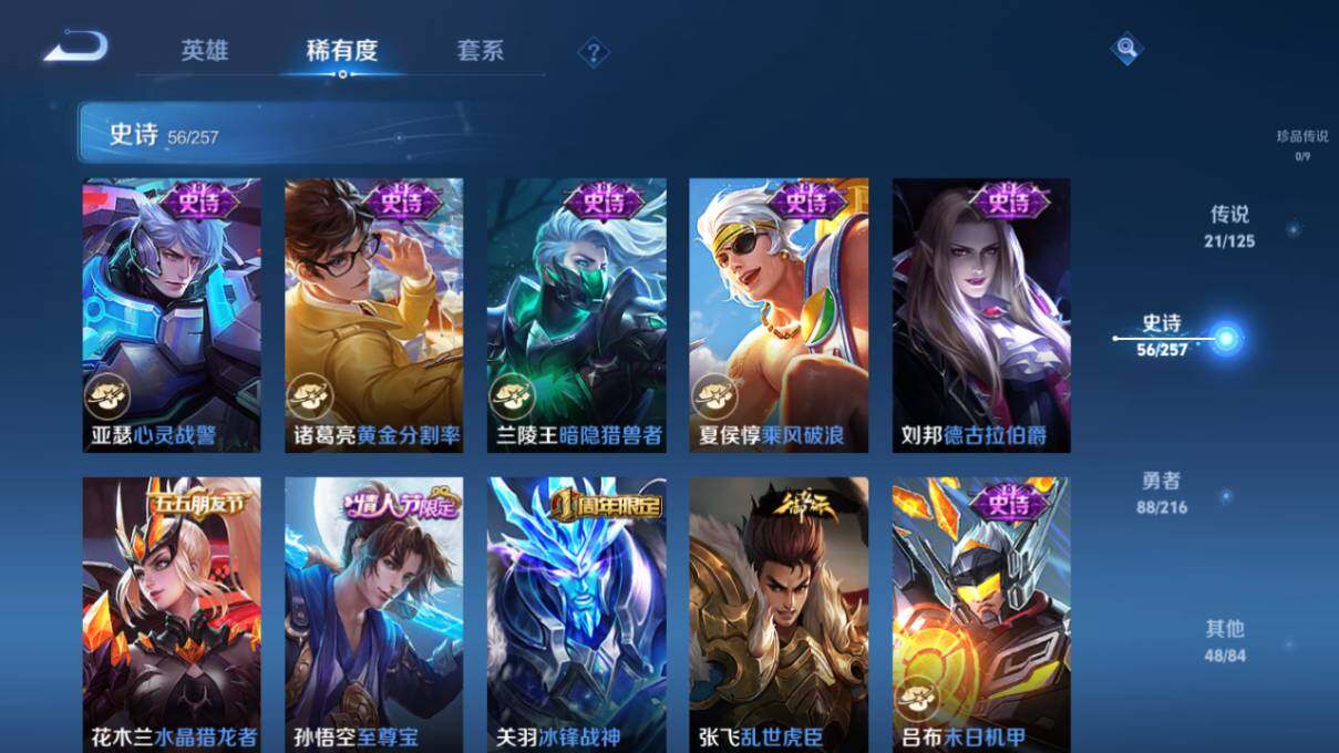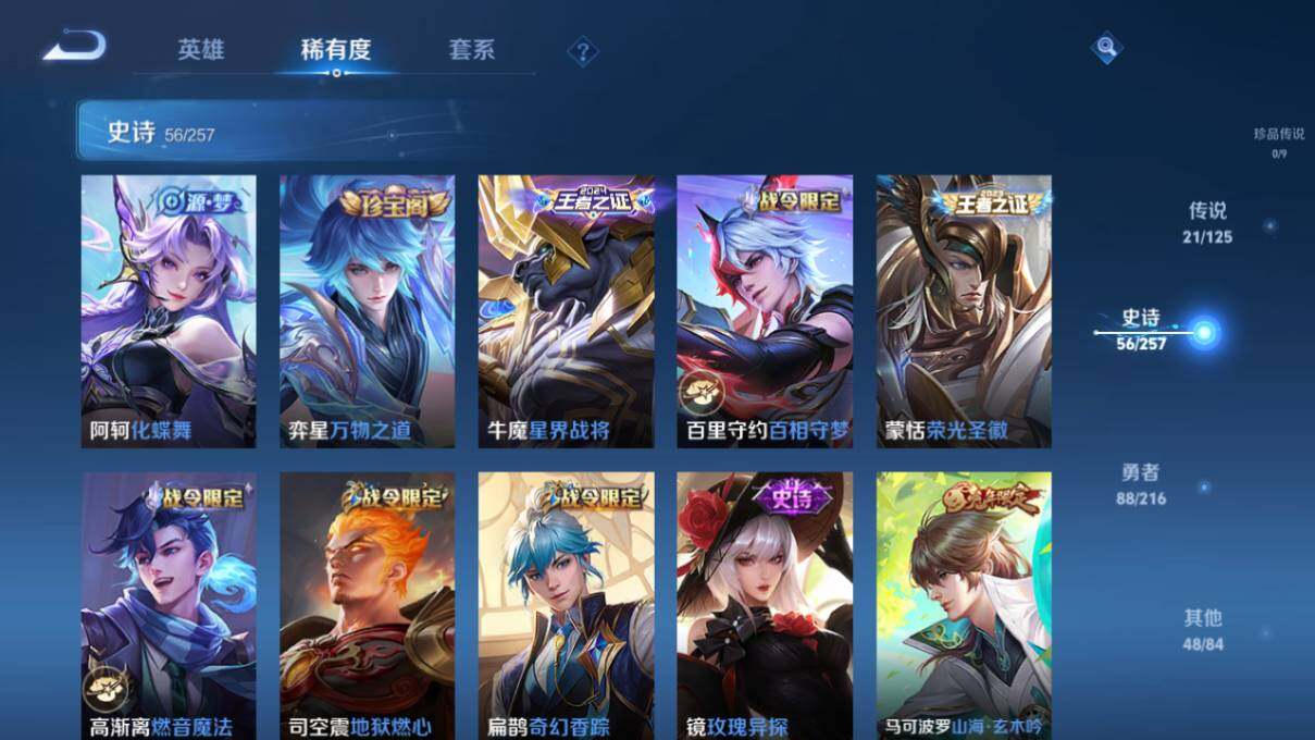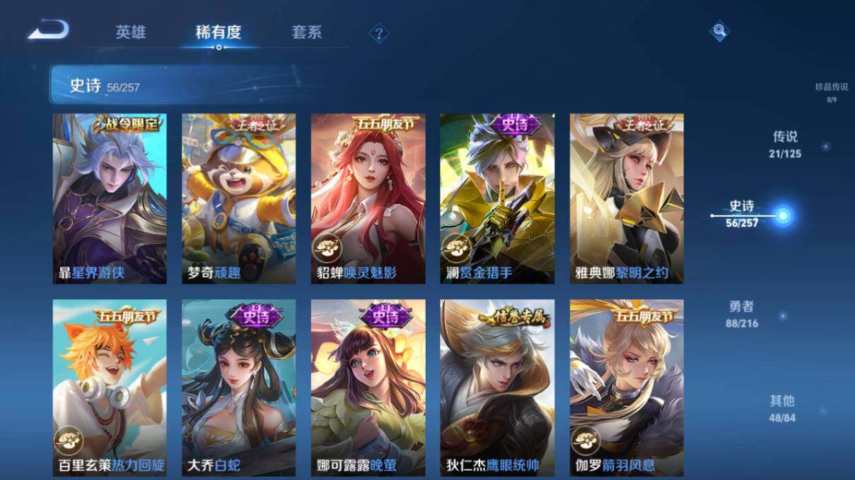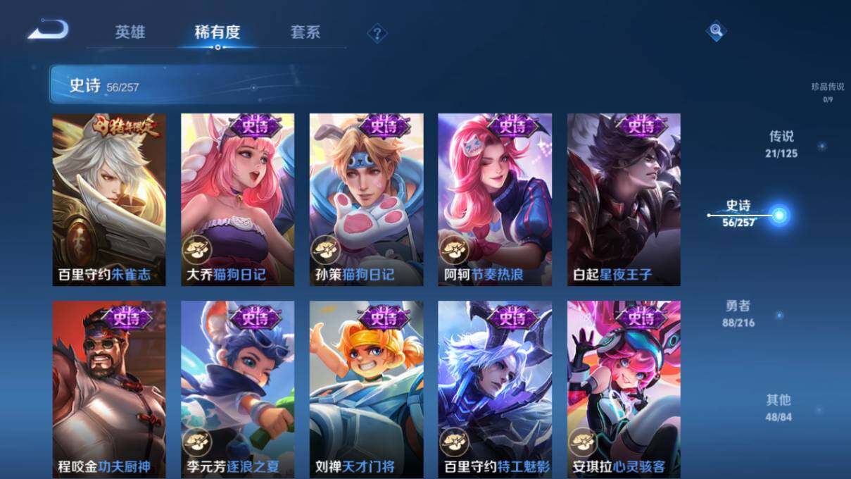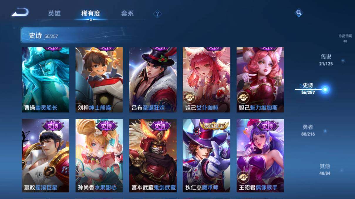 【史诗皮肤】:鲁班七号电玩小子,露娜紫霞仙子,赵云皇家上将,赵云未来纪元,貂蝉圣诞恋歌,甄姬冰雪圆舞曲,王昭君偶像歌手,狄仁杰魔术师,宫本武藏鬼剑武藏,孙尚香水果甜心,嬴政摇滚巨星,妲己魅力维加斯,妲己女仆咖啡,吕布圣诞狂欢,刘禅绅士熊喵,曹操幽灵船长,吕布末日机甲,张飞乱世虎臣,关羽冰锋战神,孙悟空至尊宝,花木兰水晶猎龙者,刘邦德古拉伯爵,夏侯惇乘风破浪,兰陵王暗隐猎兽者,诸葛亮黄金分割率,亚瑟心灵战警,安琪拉心灵骇客,百里守约特工魅影,刘禅天才门将,李元芳逐浪之夏,程咬金功夫厨神,白起星夜王子,阿轲节奏热浪,