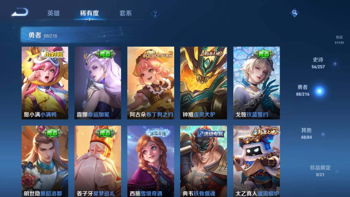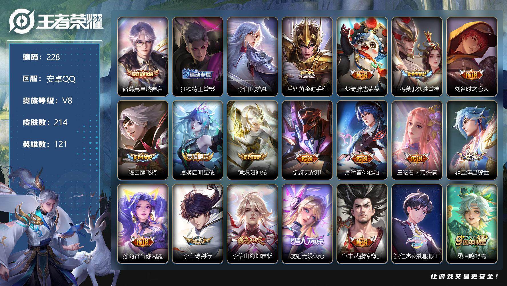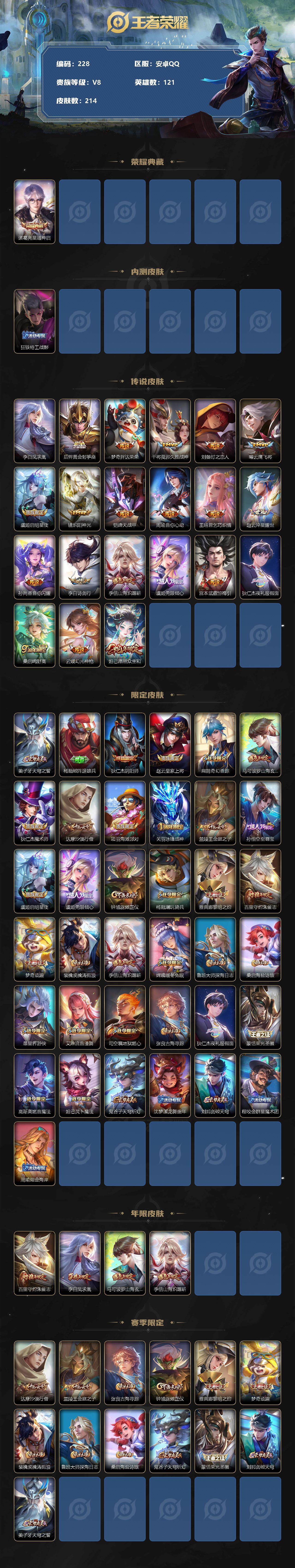 [11741537]【商品标题】:安卓Q-V8-至尊星耀V段位-121英雄-214皮肤-1典藏-0珍品无双-0无双-0珍品传说-21传说-56史诗