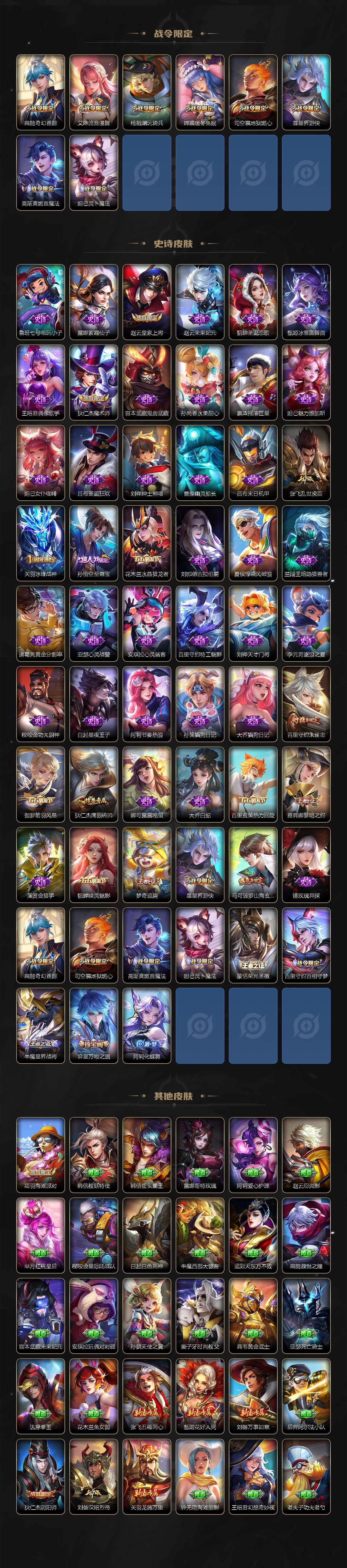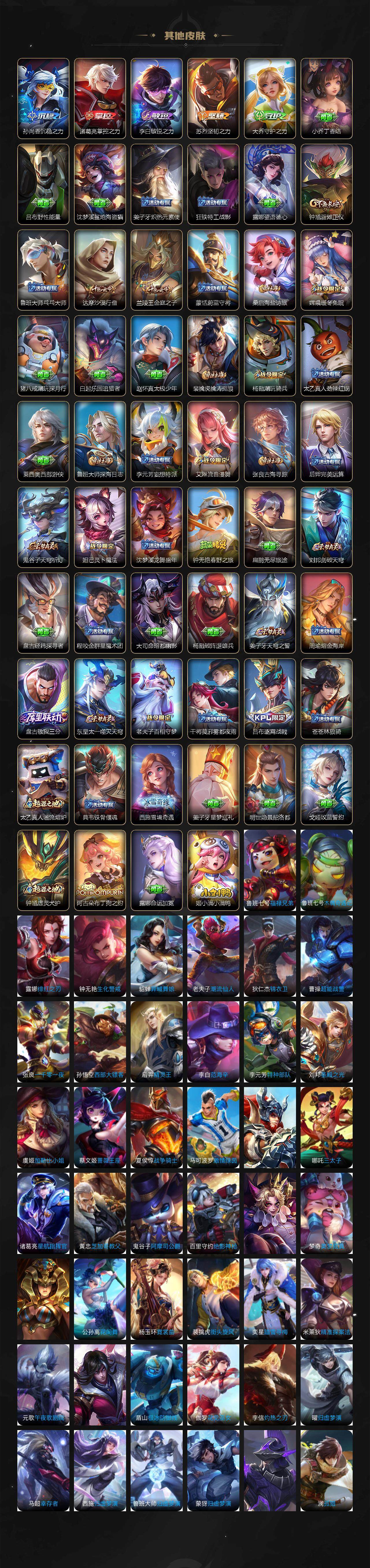 【限定皮肤】:姜子牙天穹之誓,杨戬破阵退雄兵,狄仁杰阴阳师,赵云皇家上将,扁鹊奇幻香踪,马可波罗山海玄木吟,狄仁杰魔术师,达摩沙漠行僧,项羽海滩派对,关羽冰锋战神,兰陵王金庭之子,孙悟空至尊宝,虞姬启明星使,虞姬无限倾心,钟馗驱傩正仪,杨戬潮玩骑兵,雅典娜黎明之约,百里守约朱雀志,梦奇顽趣,裴擒虎擒涛扼浪,李信山海炽霜斩,嫦娥暖冬兔眠,鲁班大师探海日志,桑启海盐诗旅,暃星界游侠,艾琳流音漫舞,司空震地狱燃心,张良古海寻踪,狄仁杰夜礼服假面,蒙恬荣光圣徽,高渐离燃音魔法,妲己灵卜魔法,鬼谷子天穹祈灯,沈梦溪龙舞盛年,刘邦剑破天穹,程咬金群星魔术团,周瑜熔金海岸