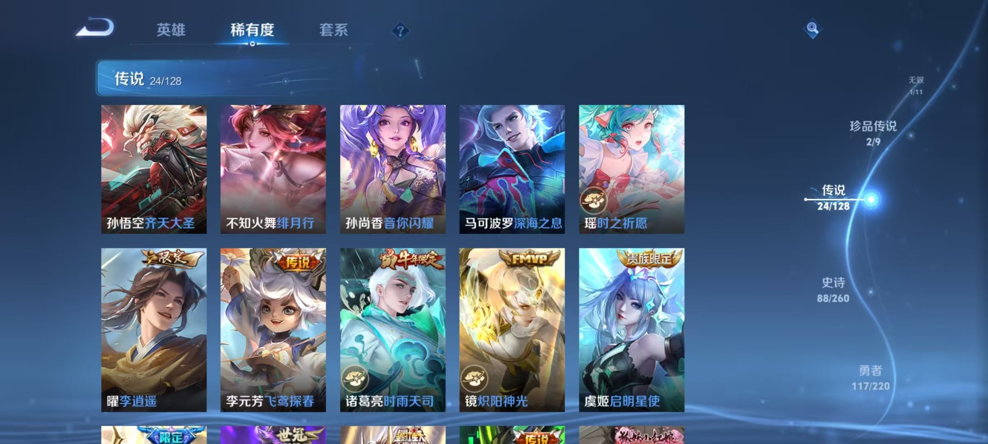 大乔白鹤梁神女,伽罗天狼溯光者,赵云百木心枪,孙膑天狼运算者,不知火舞绯月行,诸葛亮时雨天司,上官婉儿梁祝,上官婉儿神器·万象笔,马可波罗深海之息,桑启鸣野蒿,女娲愿照·千秋盛,孙悟空孙行者,芈月白晶晶,云中君时之祈愿,妲己愿照·众生和,韩信傲雪梅枪,百里守约朱雀志,瑶时之祈愿,虞姬愿照·岁时盈
